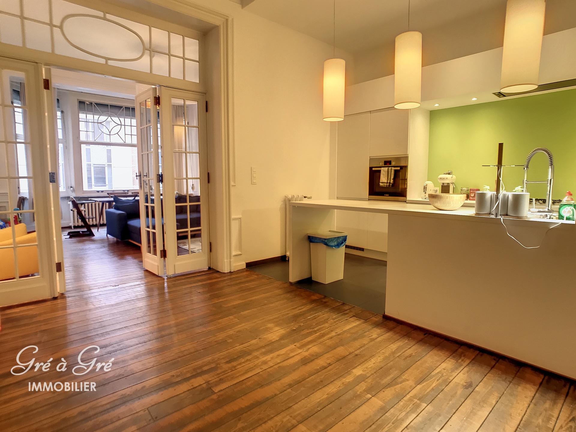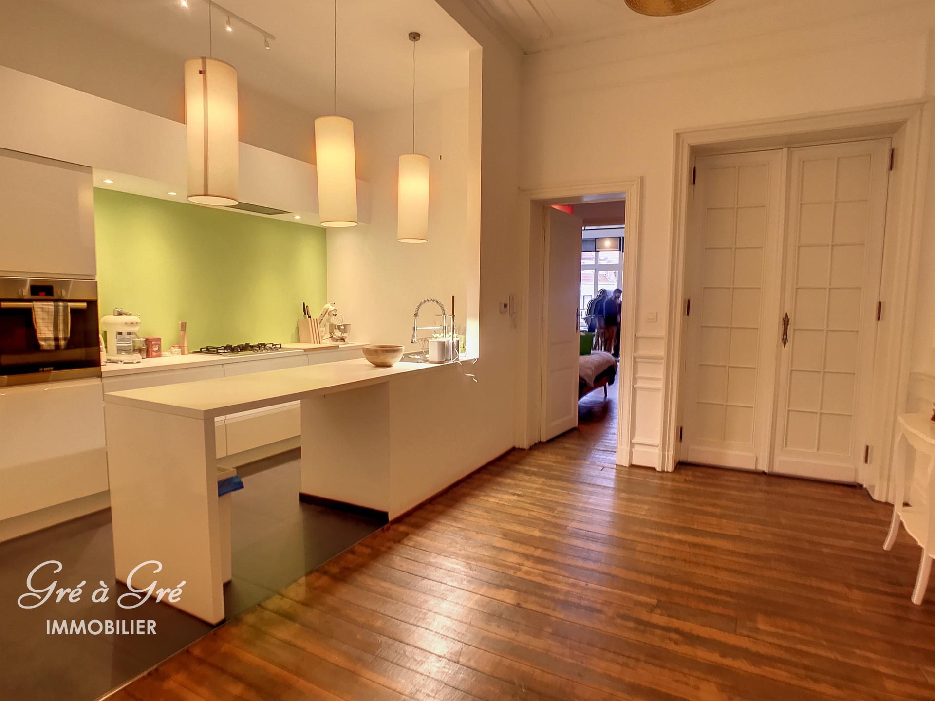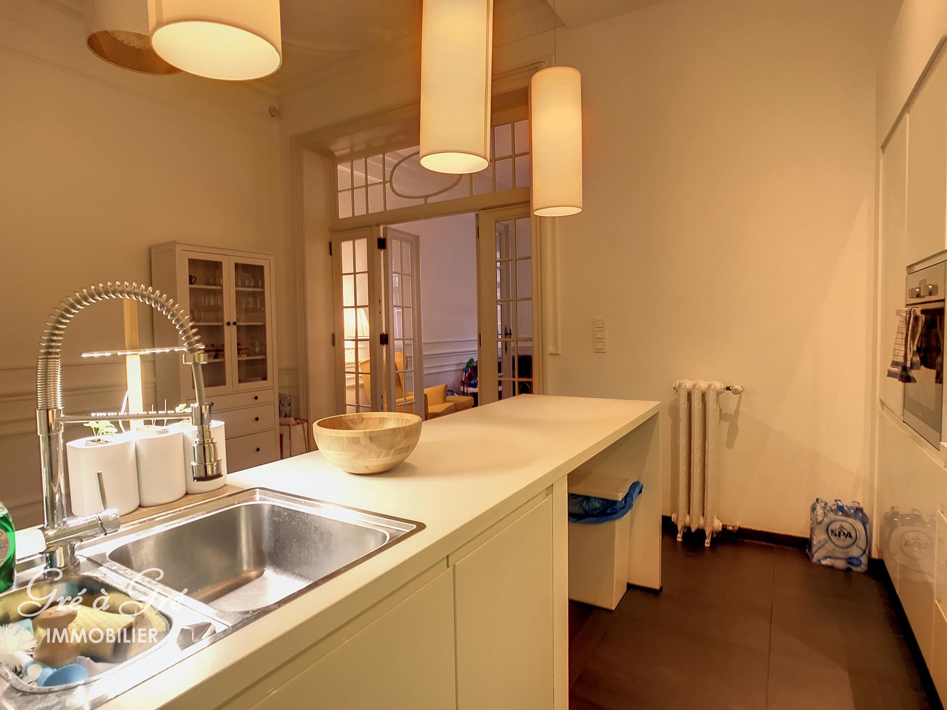 Elegant newly renovated apartment retaining high ceilings with moldings, wooden floors and offering a magnificent living room, a large hyper-equipped kitchen with breakfast corner, 1 bedroom (16 m²) with dressing room + 1 bright office for 2 (14m²), bathroom with "Italian" shower , storage place. Private cellar (15m²-possibility of storing bicycles).