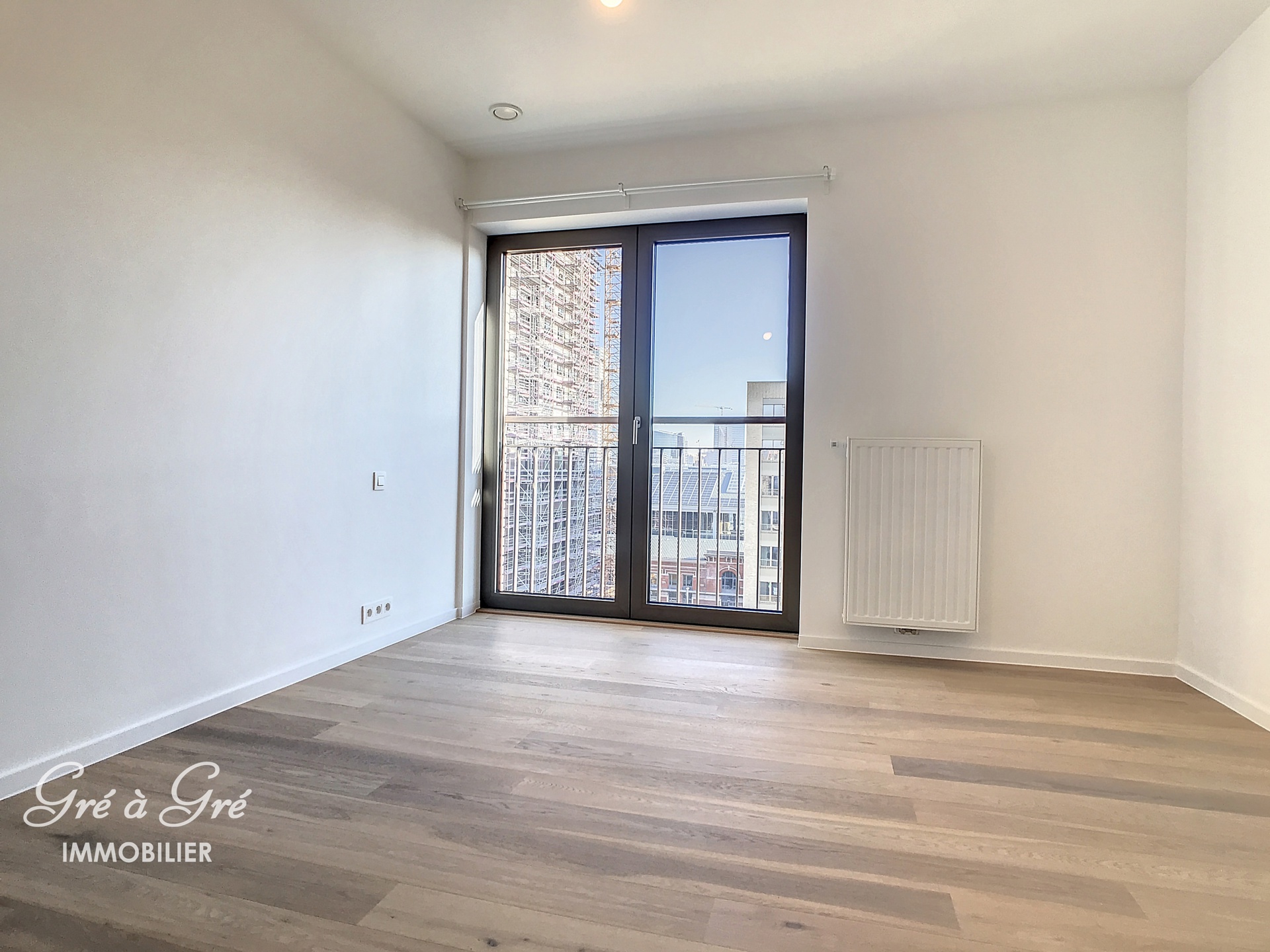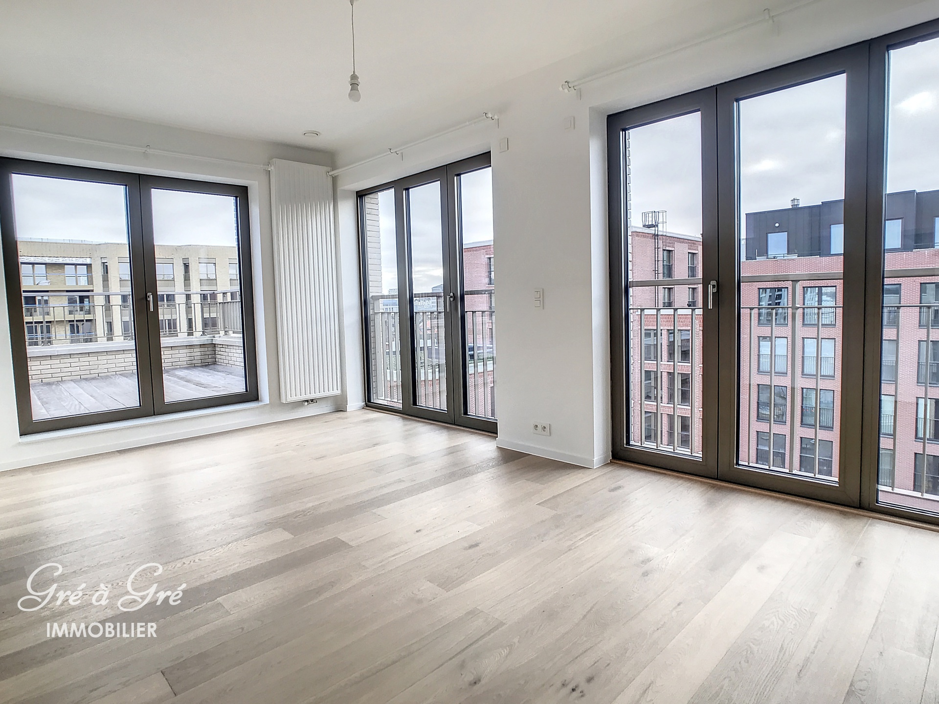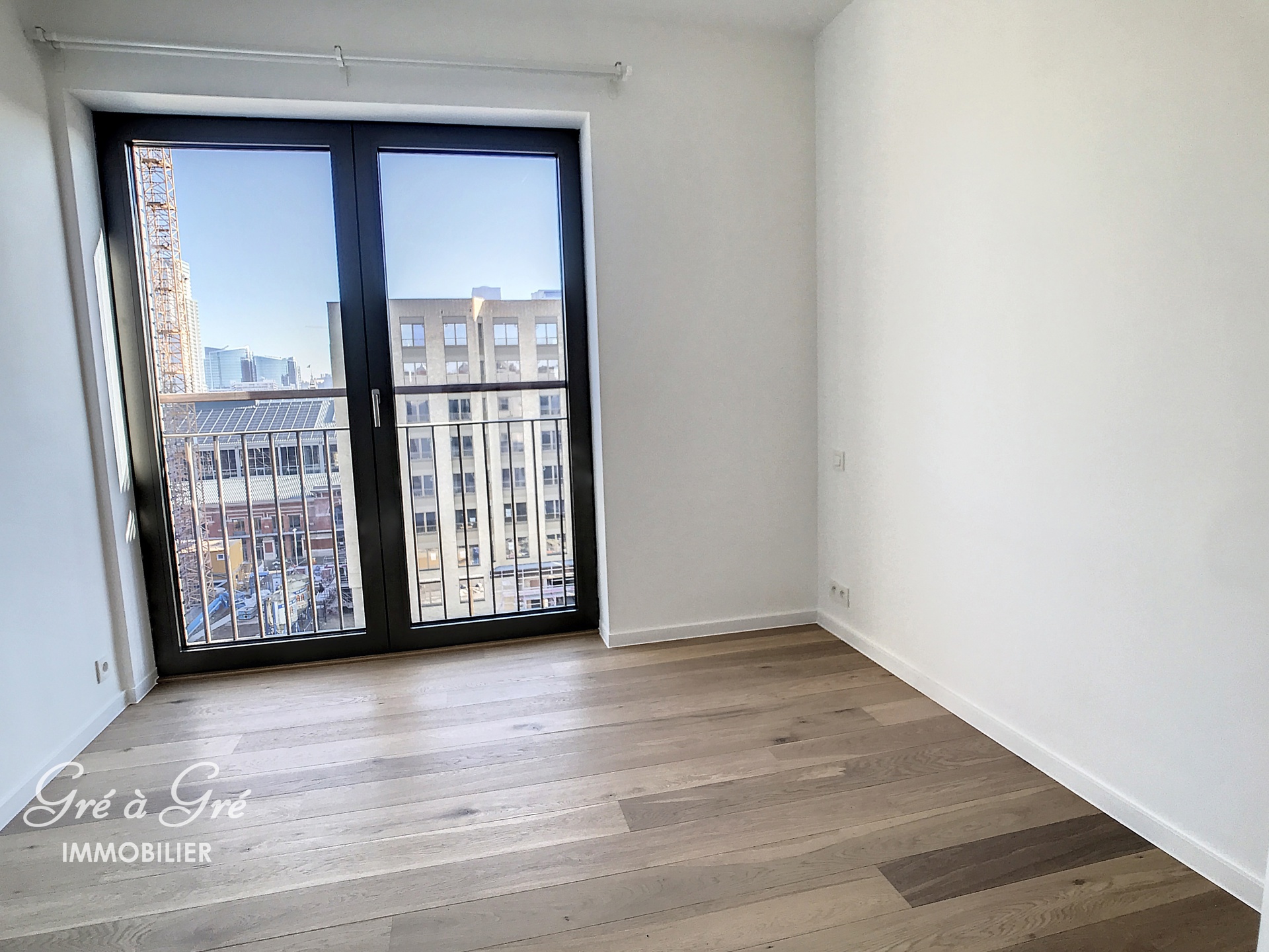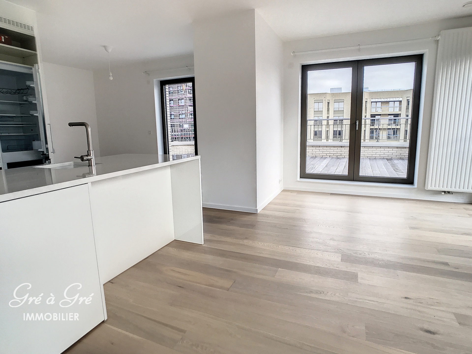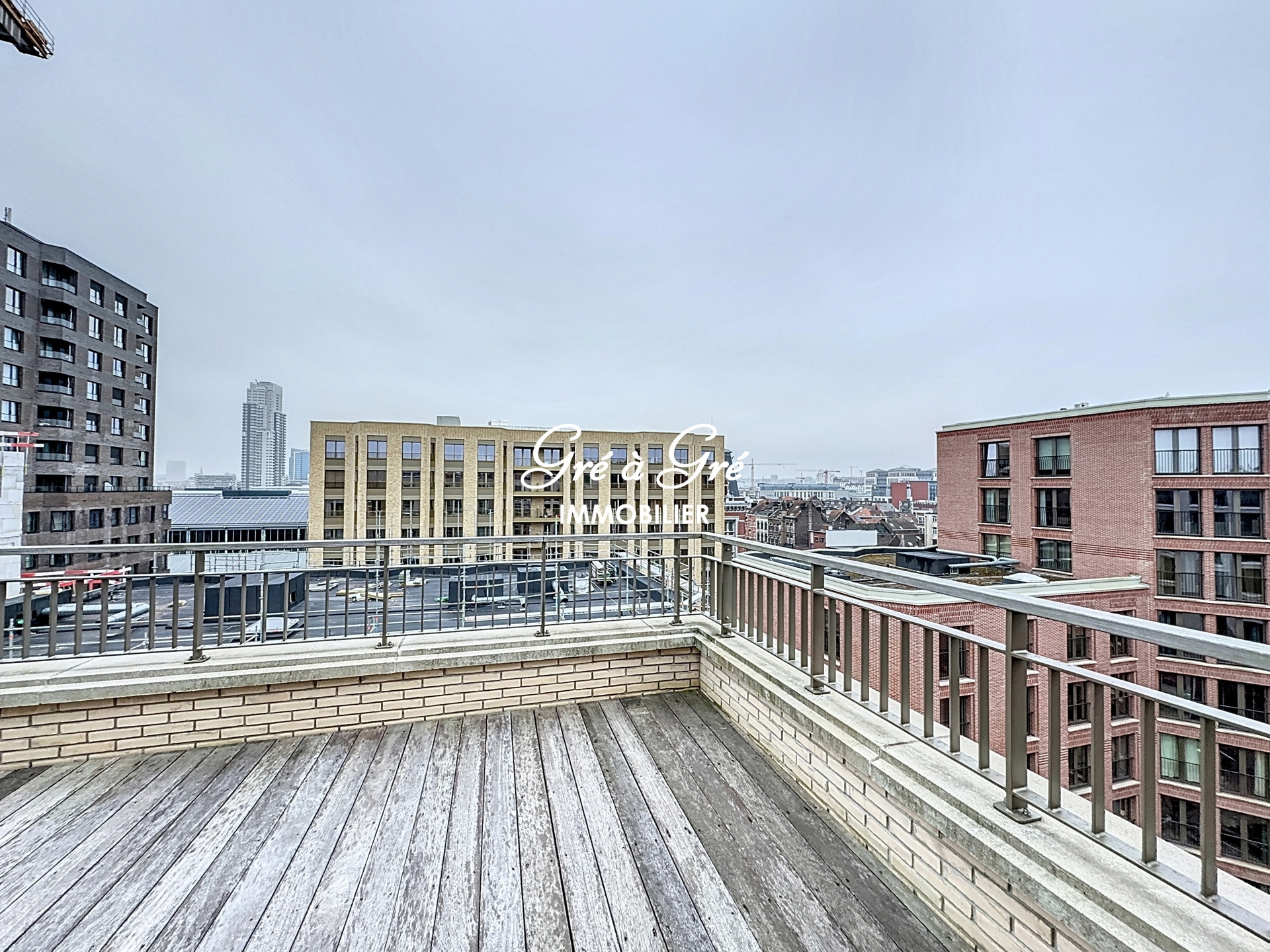 In the heart of the new Tours et Taxis district, a stone's throw from the renovated Gare Maritime, with access to a large green park, well served by public transport, a bright luxury apartment is located on the 6th and top floor of a new bright building with elevator, offering a total surface area of 95m2 and is composed of an entrance hall, a spacious living/dining room with a fully equipped open kitchen, a night corridor, a toilet, a laundry room with machine possibility washing/drying room, 2 beautiful bedrooms (10 and 15m²), 2 shower rooms. Large sunny terrace of 32 m² with open views of Brussels. Cellar and bicycle parking in the basement. Charges: 150 eur/m (provision for common areas, heating and hot water). EPC: B+. Not included: cold water consumption and private electricity. Parking possibility (+125 eur).