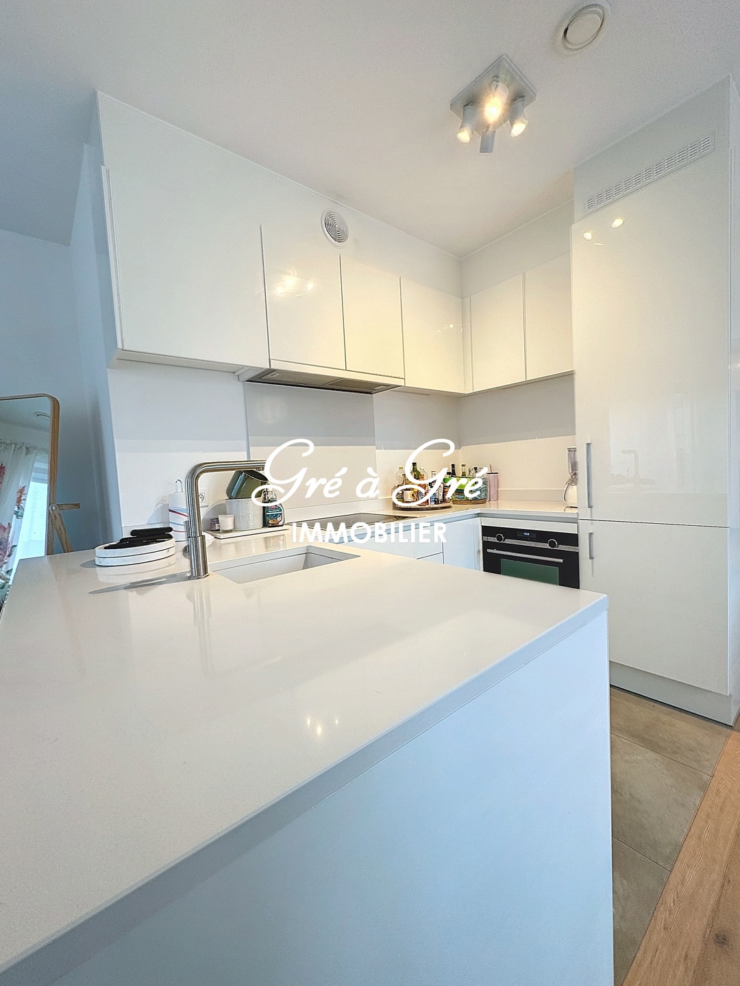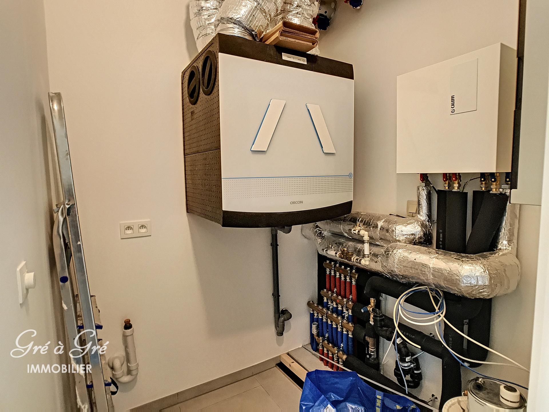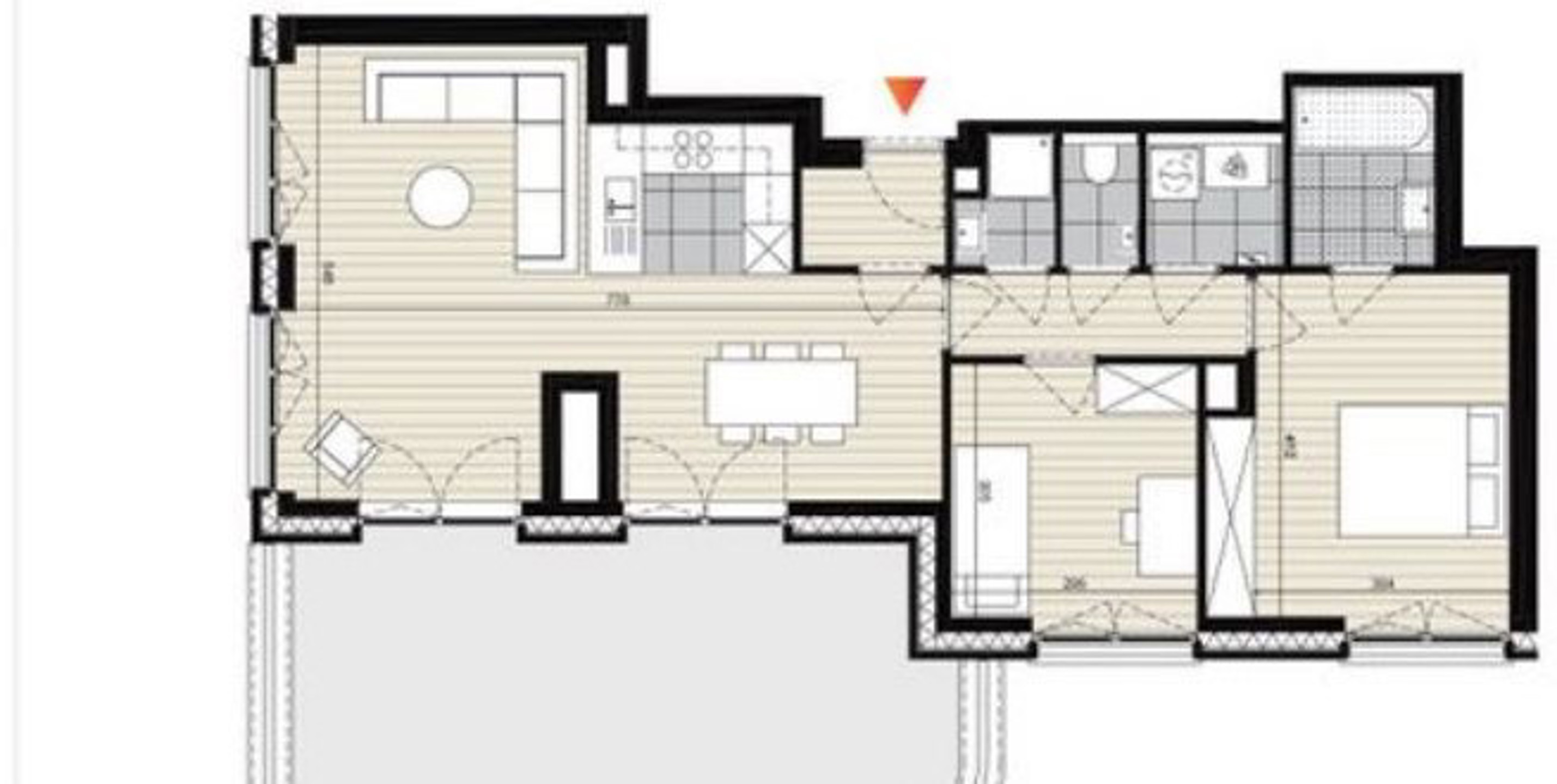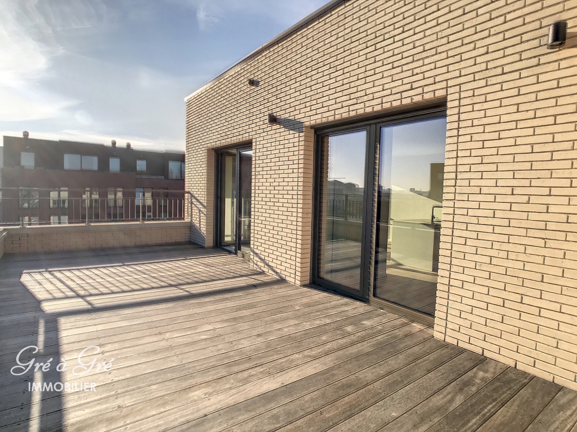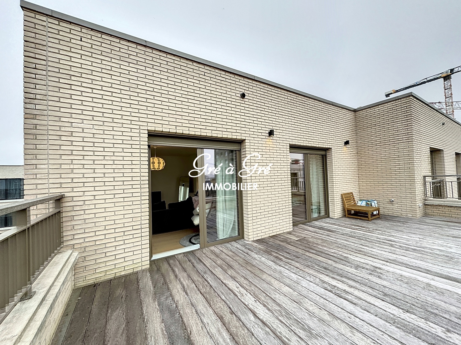 In the heart of the new Tours et Taxis district, a stone's throw from the renovated Gare Maritime, with access to a large green park, well served by public transport, a bright luxury apartment is located on the 6th and top floor of a new bright building with elevator, offering a total surface area of 95m2 and is composed of an entrance hall, a spacious living/dining room with a fully equipped open kitchen, a night corridor, a toilet, a laundry room with machine possibility washing/drying room, 2 beautiful bedrooms (10 and 15m²), 2 shower rooms. Large sunny terrace of 32 m² with open views of Brussels. Cellar and bicycle parking in the basement. Charges: 150 eur/m (provision for common areas, heating and hot water). EPC: B+. Not included: cold water consumption and private electricity. Parking possibility (+125 eur).