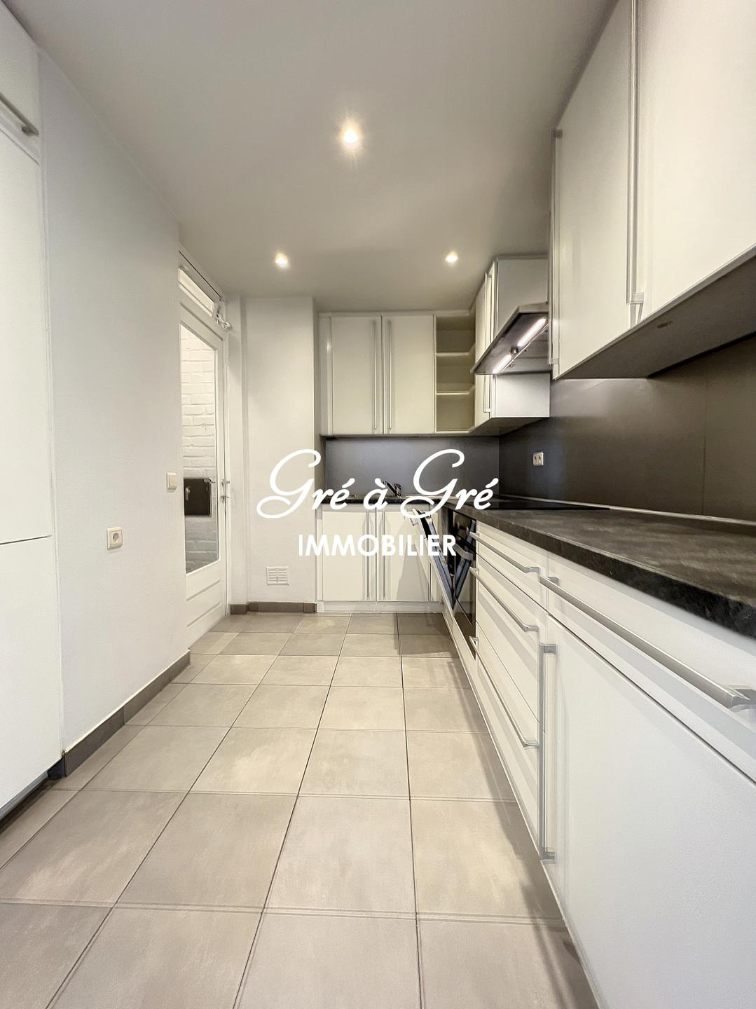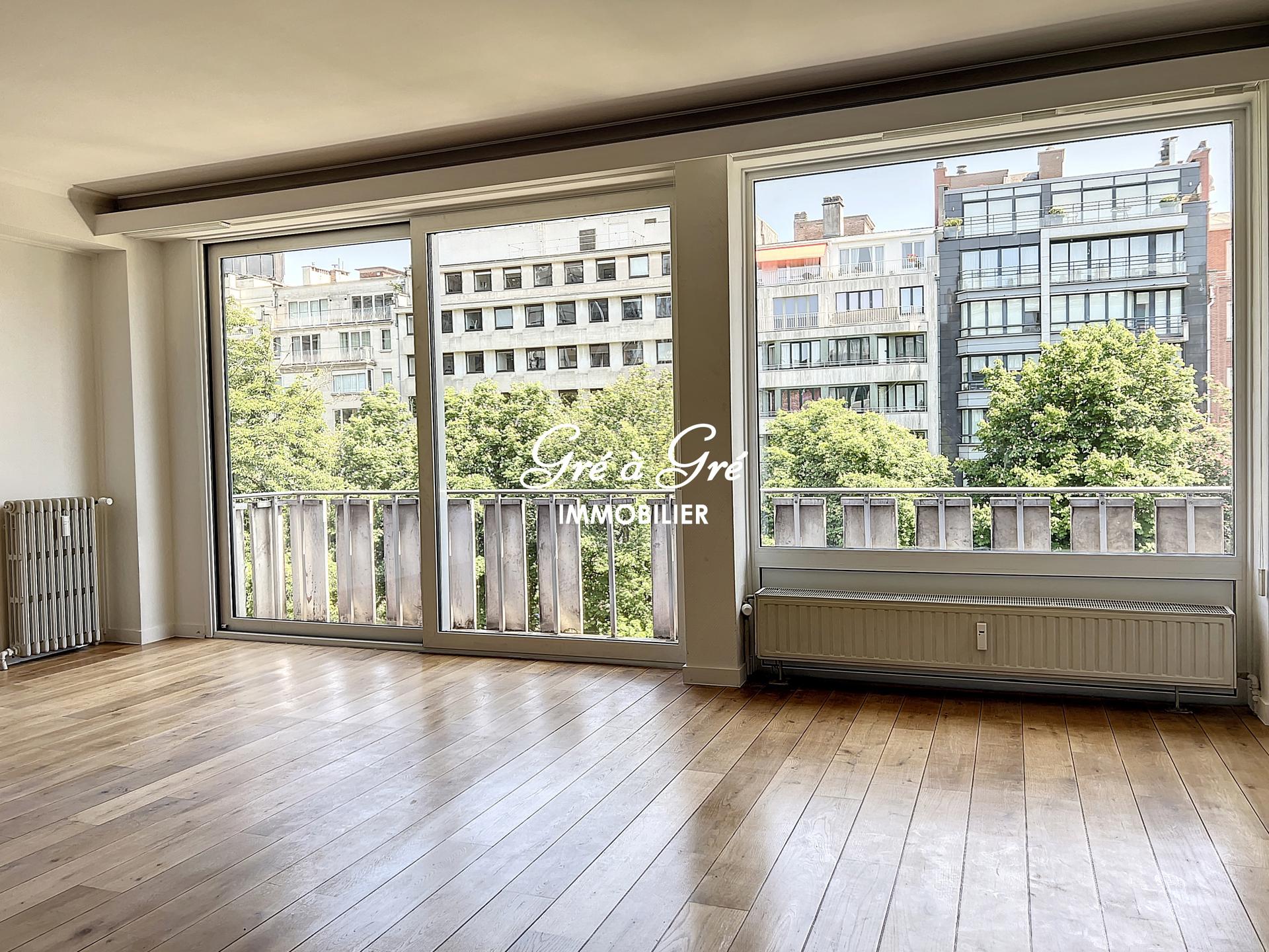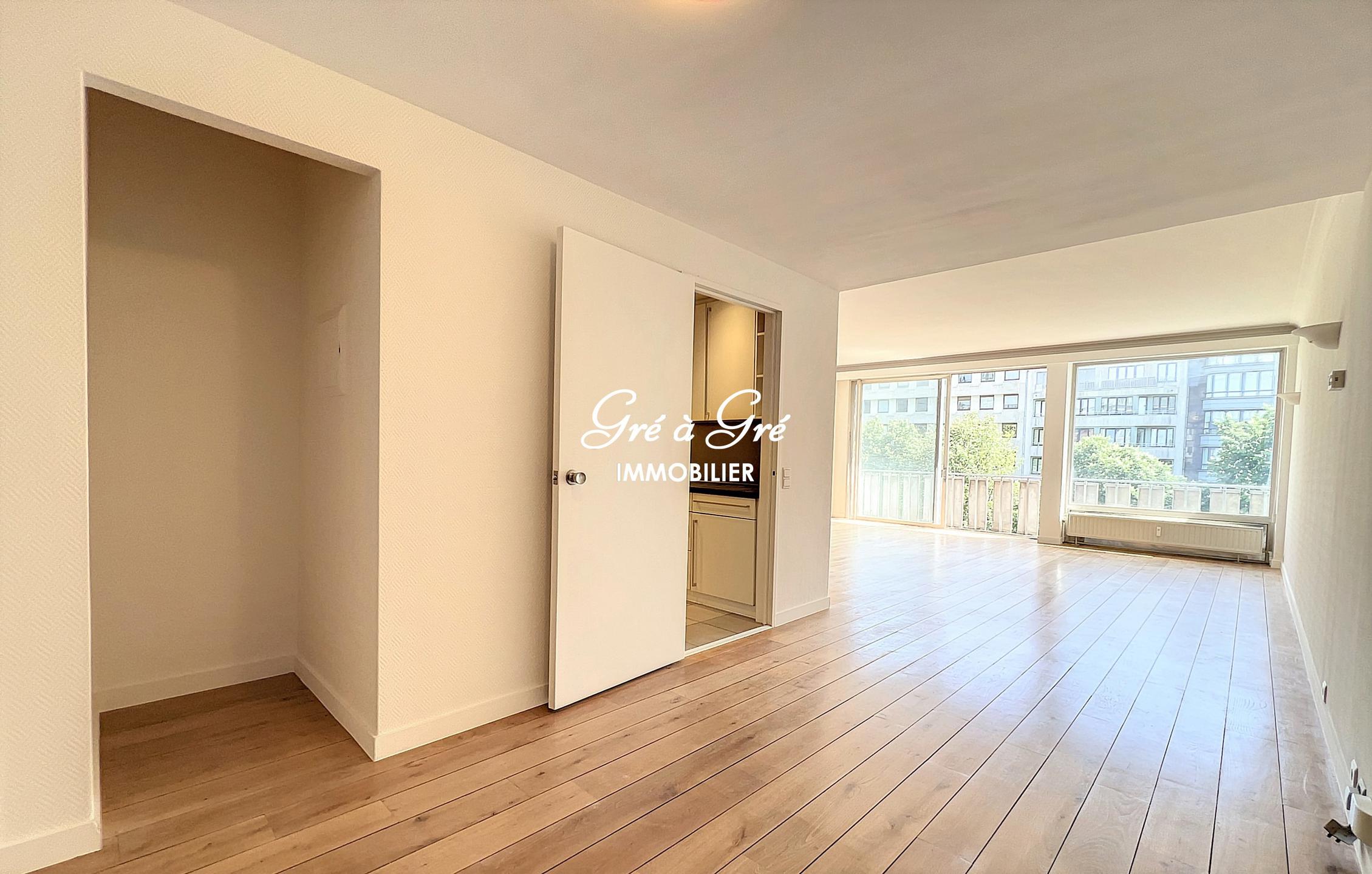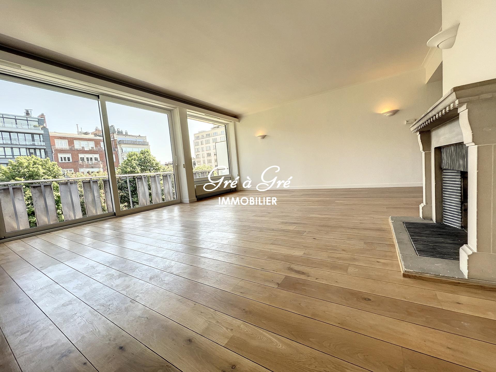 Bright refurbished apartment (1st occupation) enjoying a beautiful open view both from the front terrace and from the bedrooms at the back. Entrance hall with armored door, large cloakroom-wardrobe, guest toilet, large living room (45m²) with wooden floor, open fireplace (not in use) and terrace access. Fully equipped kitchen and new appliances (hood, hob, dishwasher, fridge and separate freezer), small balcony. Night hall with many cupboards, master bedroom (18m²) with its bathroom and wc, 2nd bedroom (10m²), shower room, 3rd bedroom (7m²) or office. Private cellar (3m²) and common bike room.