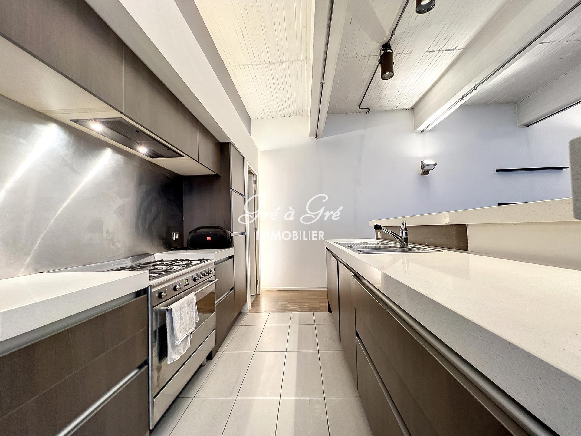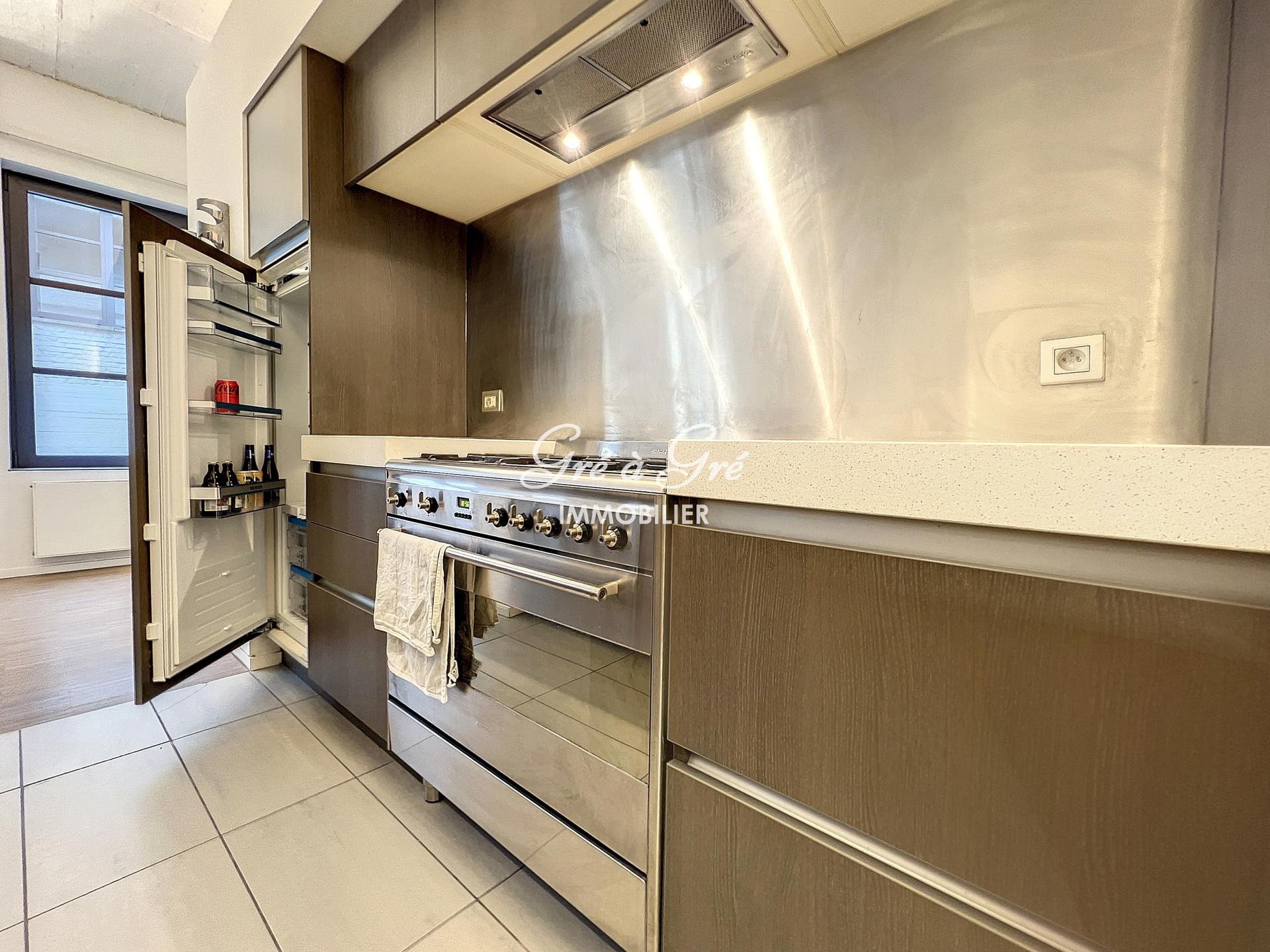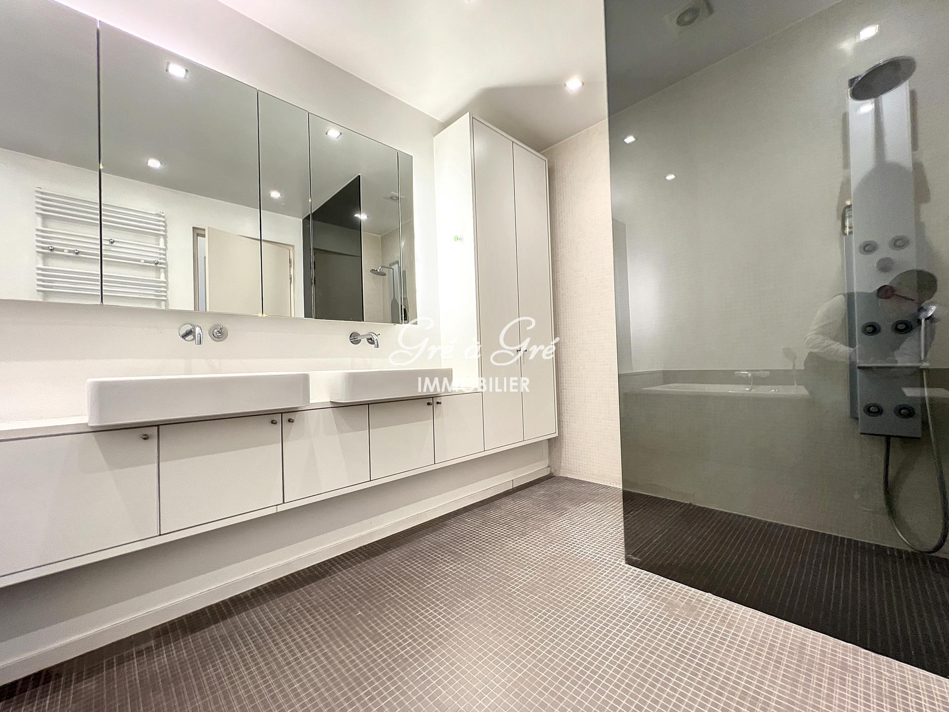 Entrance hall with secure door, videophone, toilet and cloakroom. Large living room (50 m²) and hyper-equipped semi-open kitchen with central island. Night hall, 2 large bedrooms (14m² and 25m²) with cupboards. Bathroom with bath, Italian shower, 2 sinks and plenty of storage. 1 shower room with wc. Separate laundry room, water softener, freezer, storage. Private cellar and possibility of double indoor parking in the building.