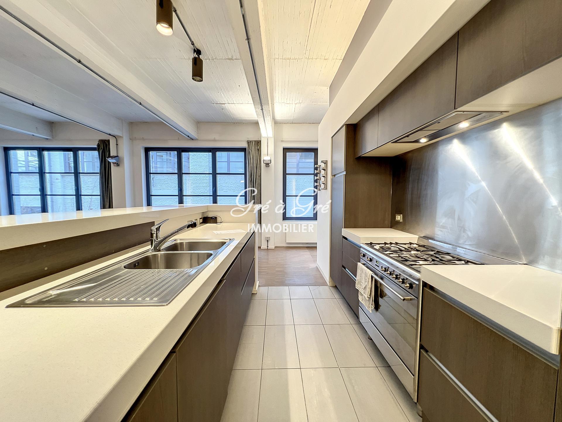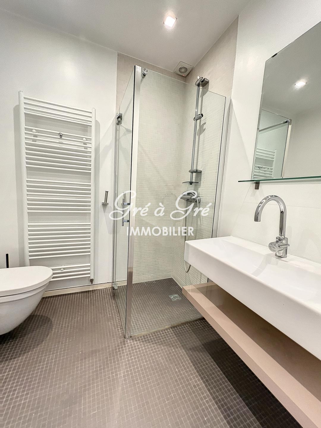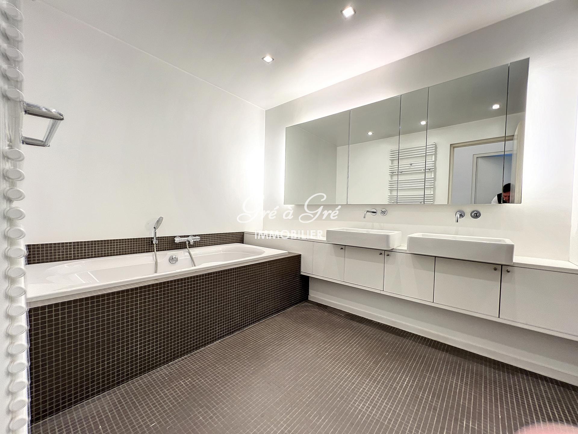 Entrance hall with secure door, videophone, toilet and cloakroom. Large living room (50 m²) and hyper-equipped semi-open kitchen with central island. Night hall, 2 large bedrooms (14m² and 25m²) with cupboards. Bathroom with bath, Italian shower, 2 sinks and plenty of storage. 1 shower room with wc. Separate laundry room, water softener, freezer, storage. Private cellar and possibility of double indoor parking in the building.