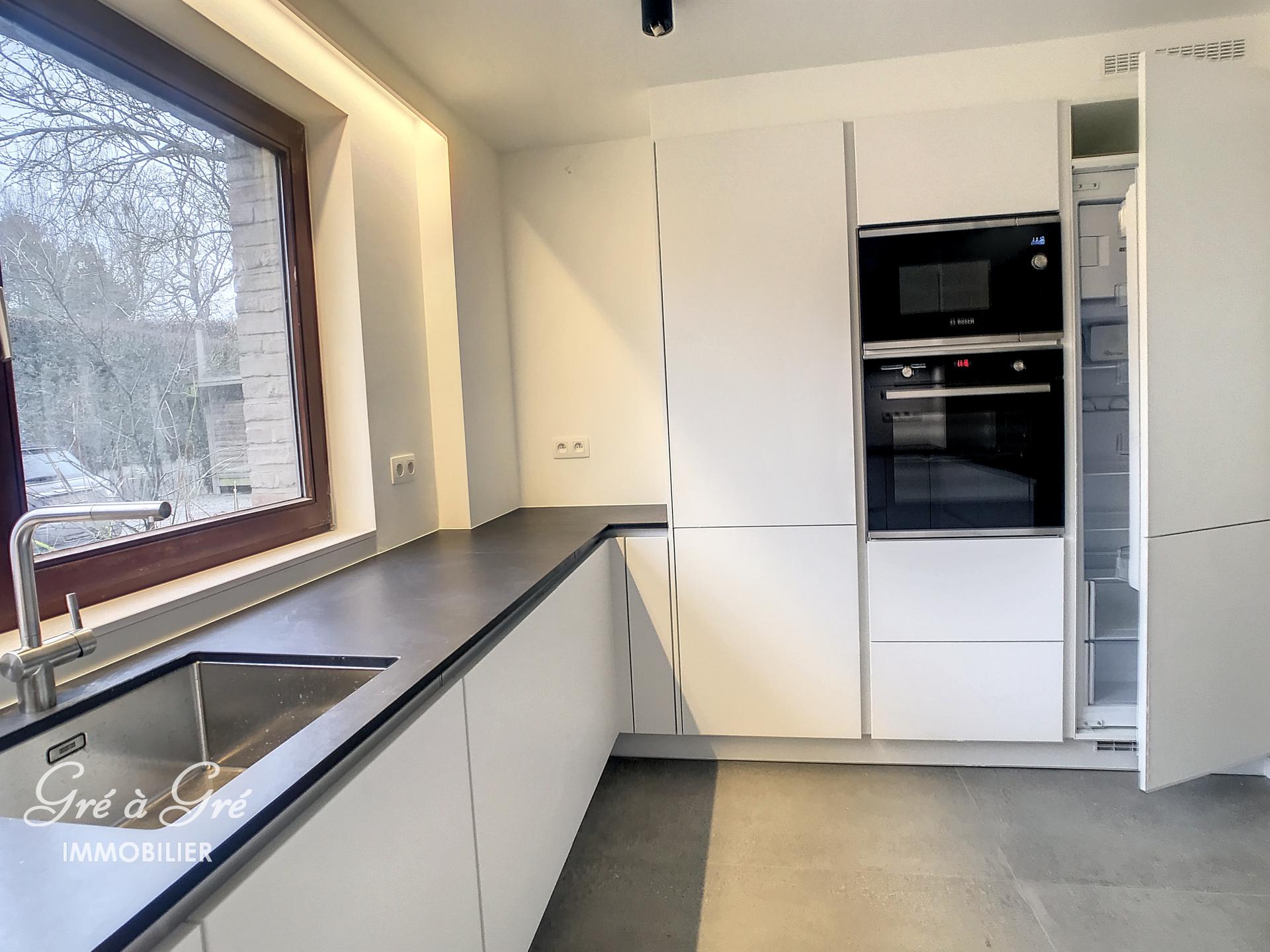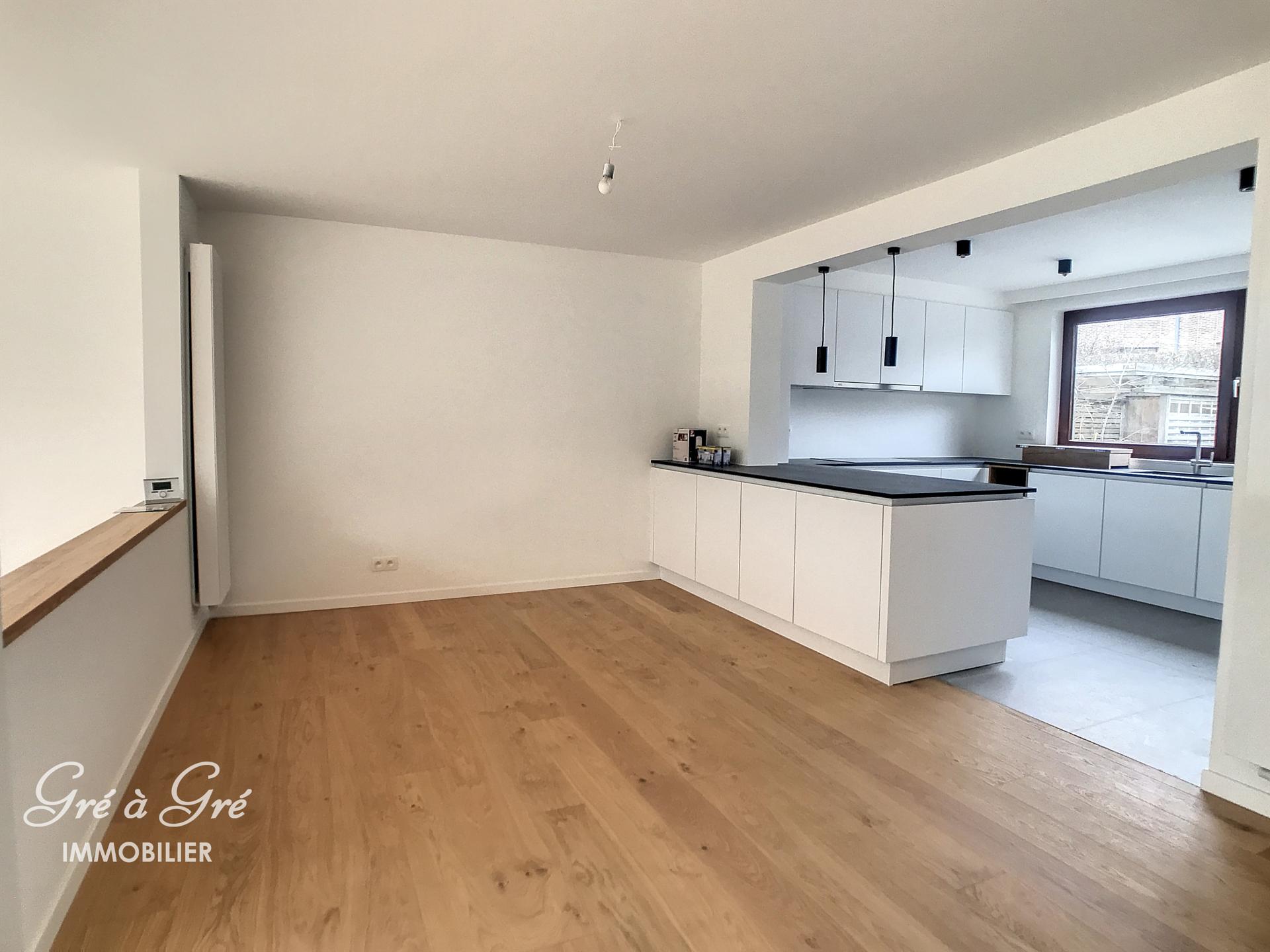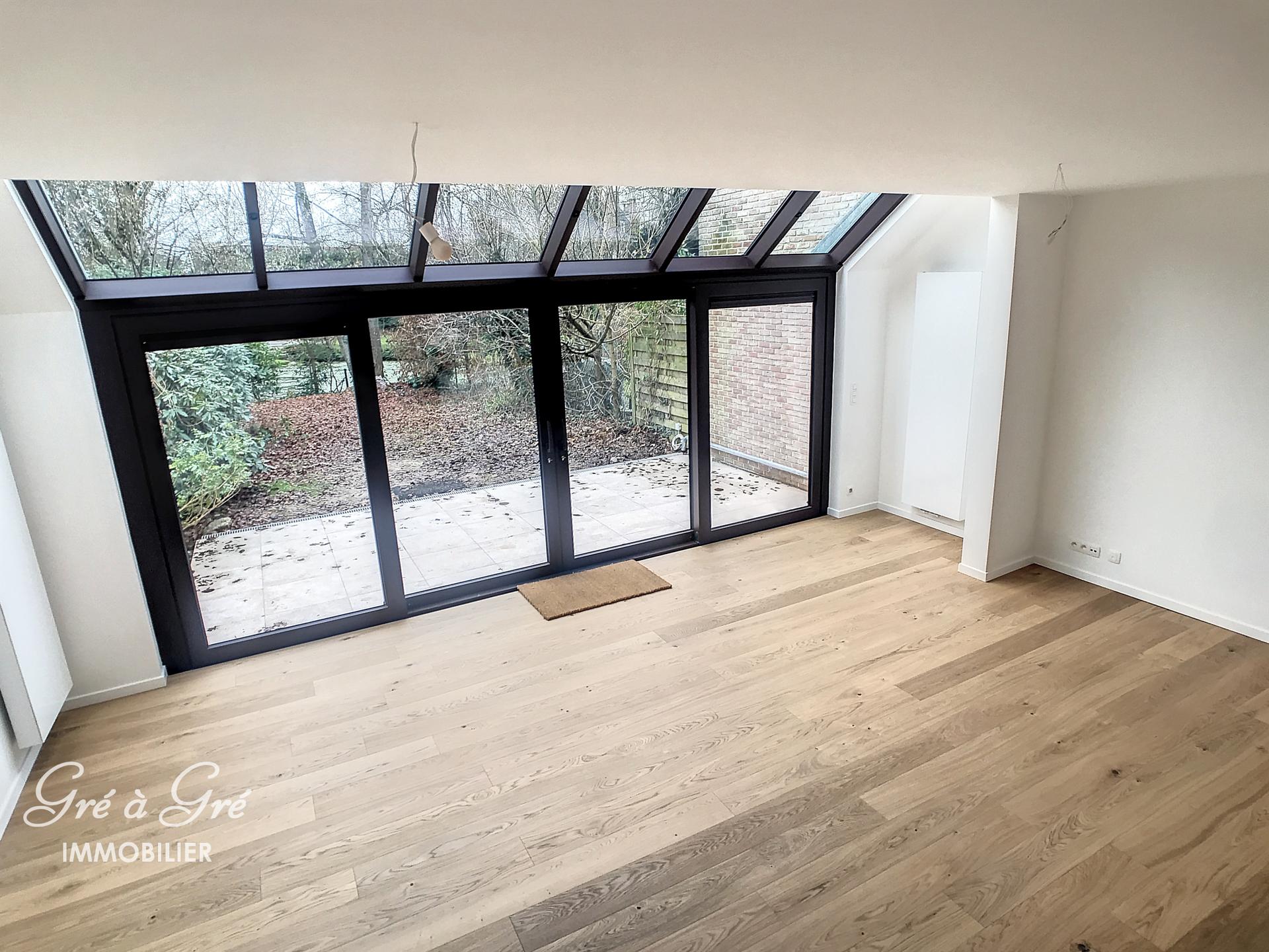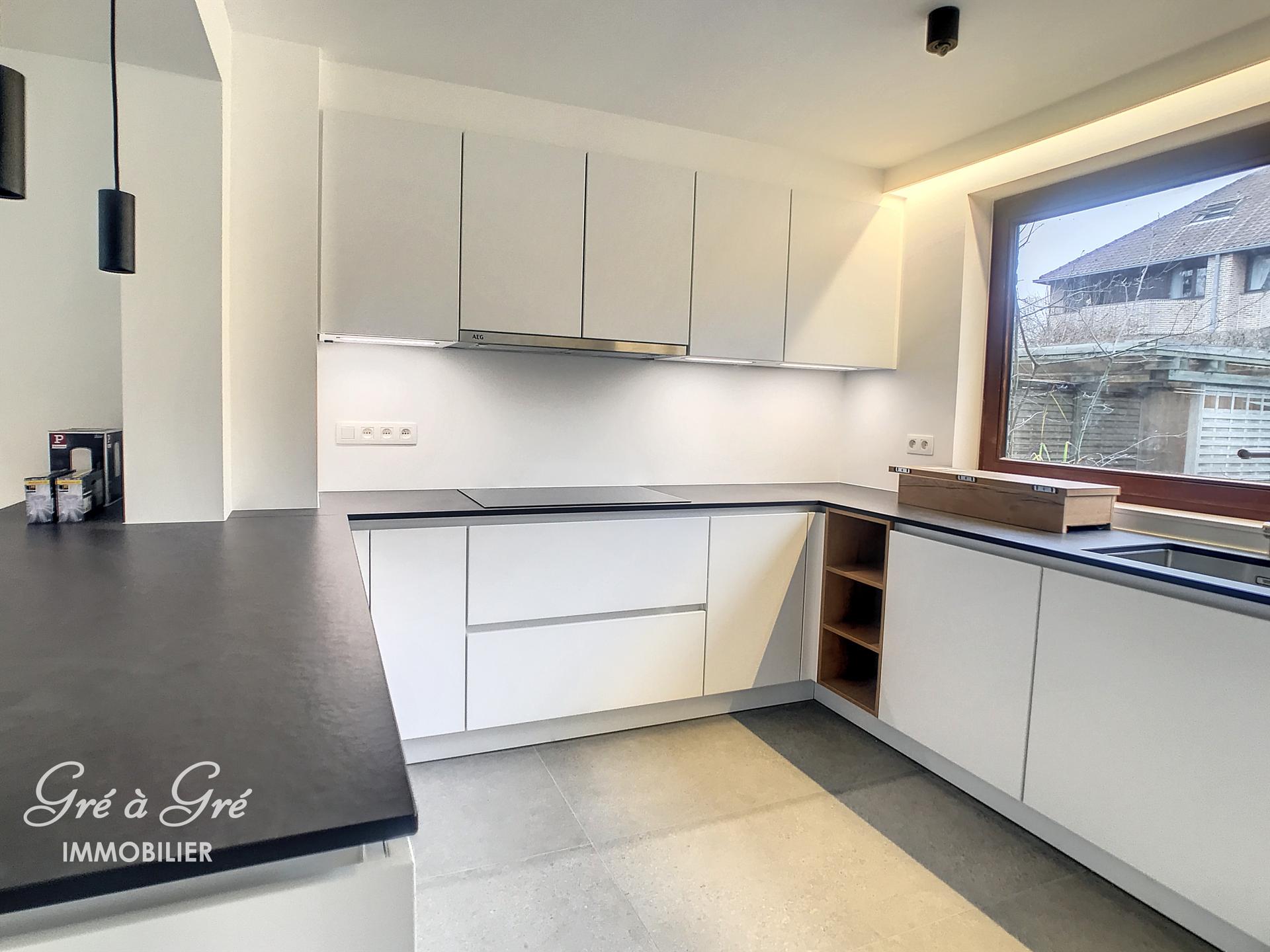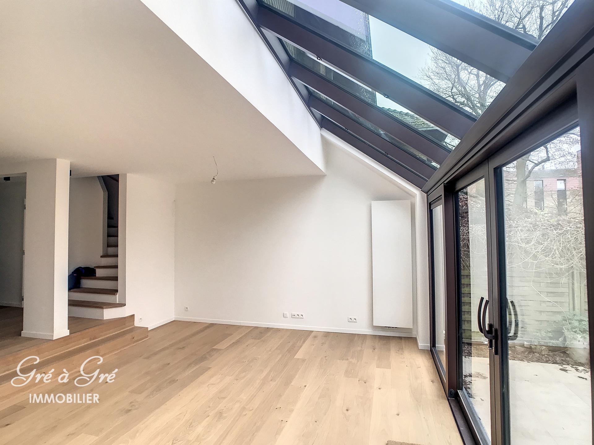 SHORT TERM LEASE. 1st occupation after renovation! Fort Jaco, in a quiet area set back from the Chaussée de Waterloo, bright renovated house comprising an entrance hall with cloakroom and toilet, 50m² living room facing the garden with terrace, new fully equipped kitchen, 4 bedrooms and 3 new bathrooms . Laundry room. Large cellars. 2 outdoor parking spaces and carport with space for bikes. New central heating. Charges: 180 eur / month (provision 60 eur / m for water and 120 eur / month for the upkeep of the enclosure. EPC E (before heating and insulation works). NOW AVAILABLE.