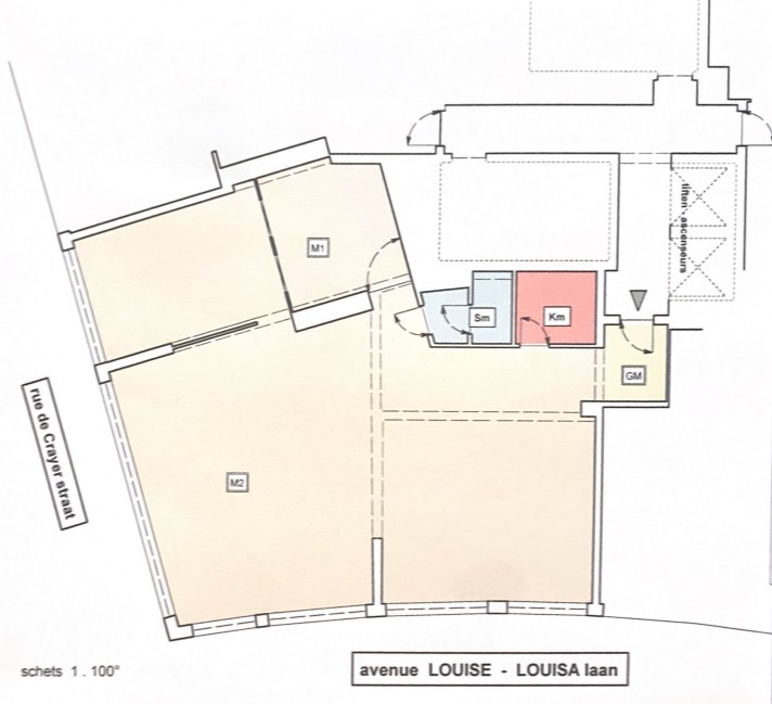 Avenue Louise/Abbaye tram. On the 7th floor of a luxury building. Bright 131m² offices with open views and parking possibility. Entrance hall, large open-plan office (90m²), private office (18m²), closed office (11m²), kitchenette, toilet, cloakroom. Charges: provision 300 eur/month (common areas, heating and water). Not included: electricity. P.I.: 350 eur/month. Possibility of parking in the basement (+ 125 eur/month/parking).