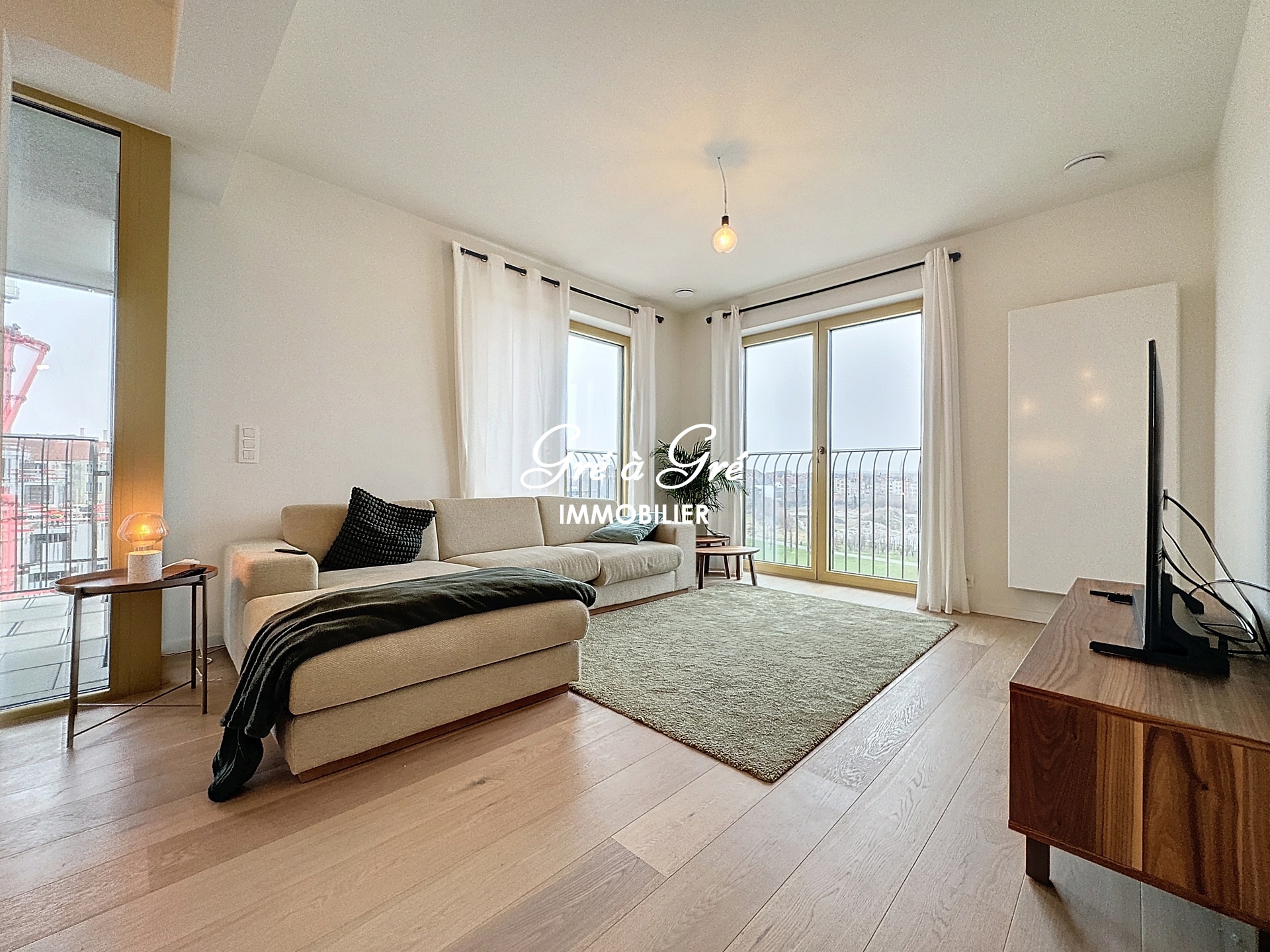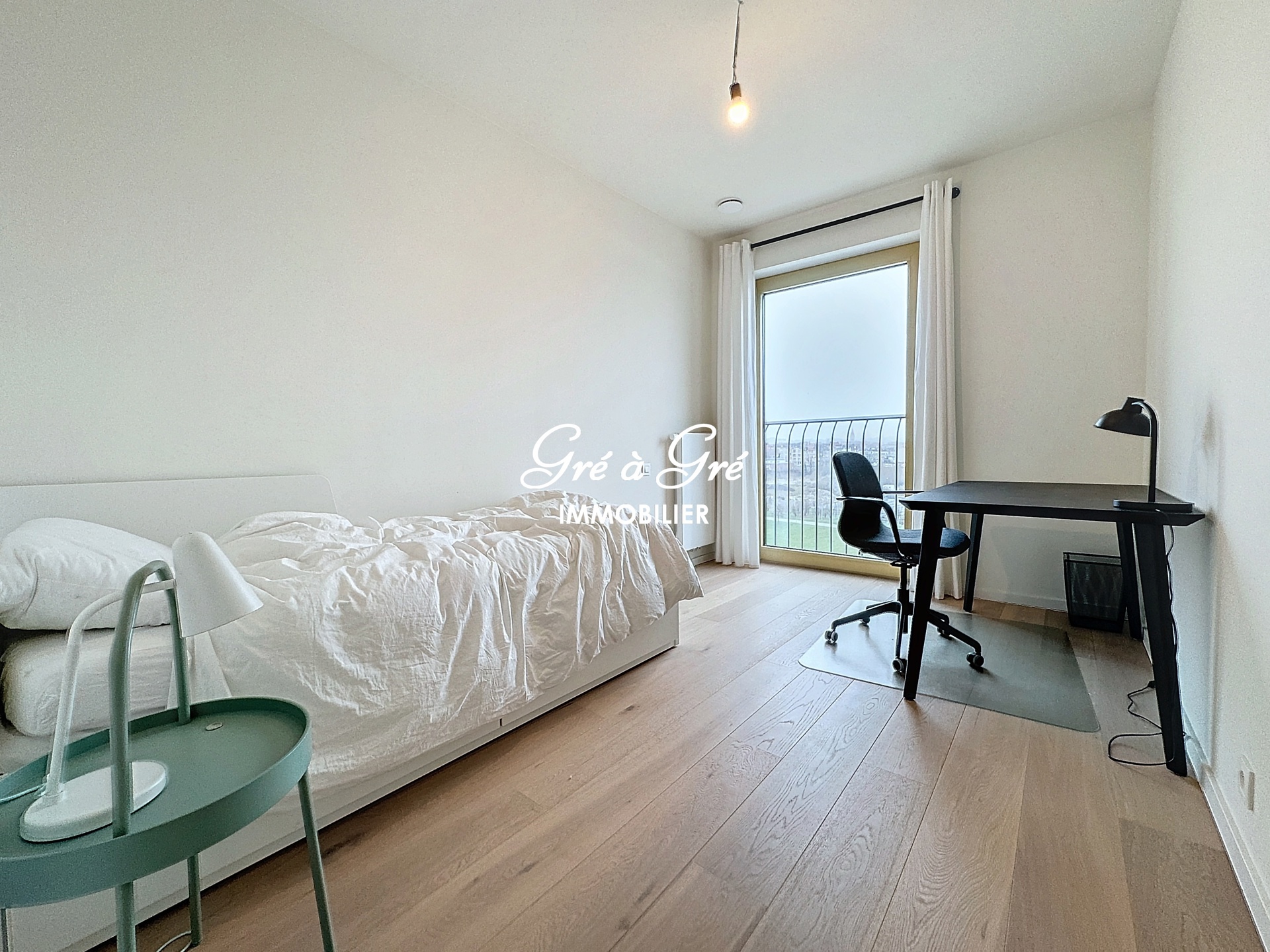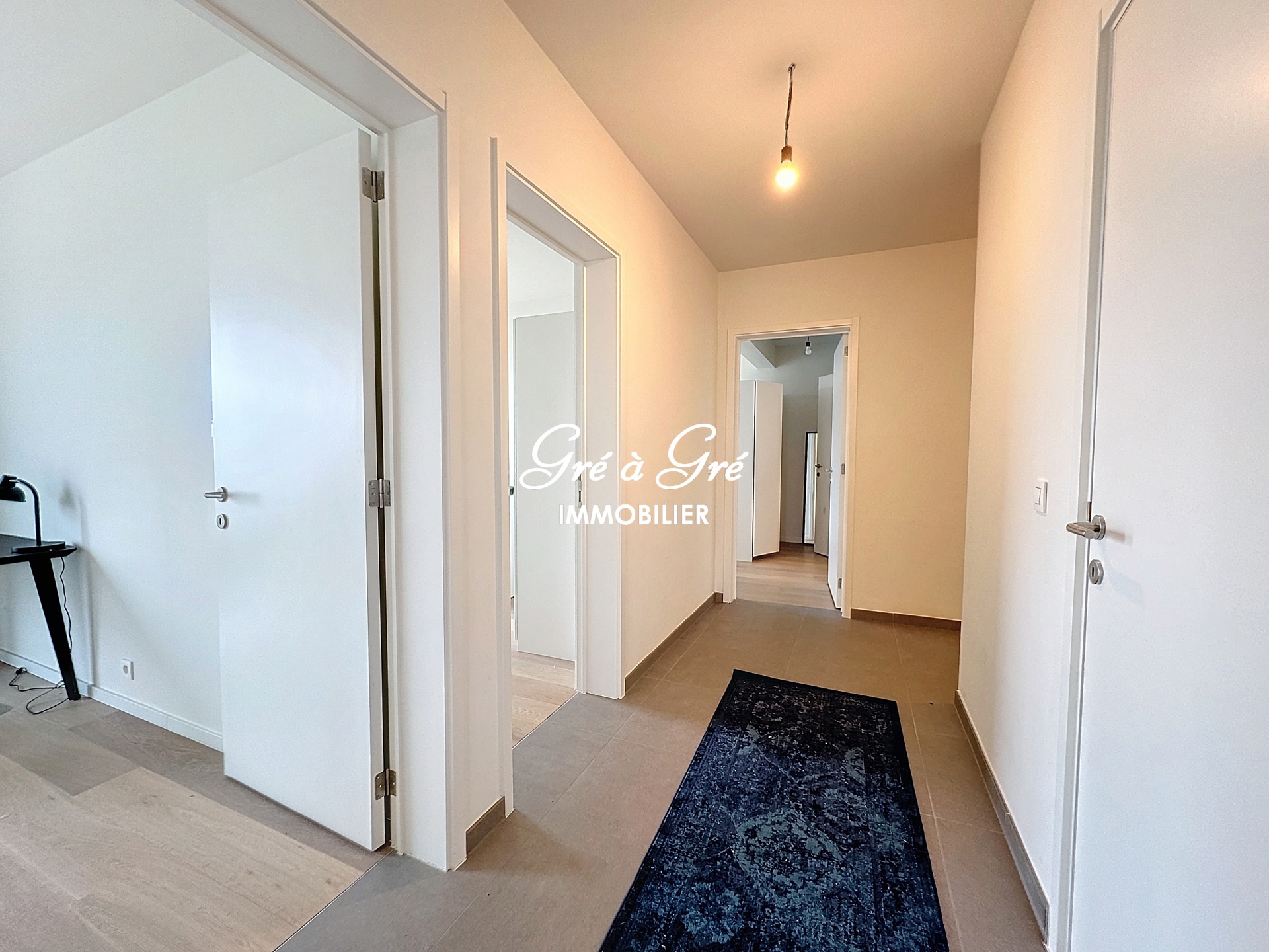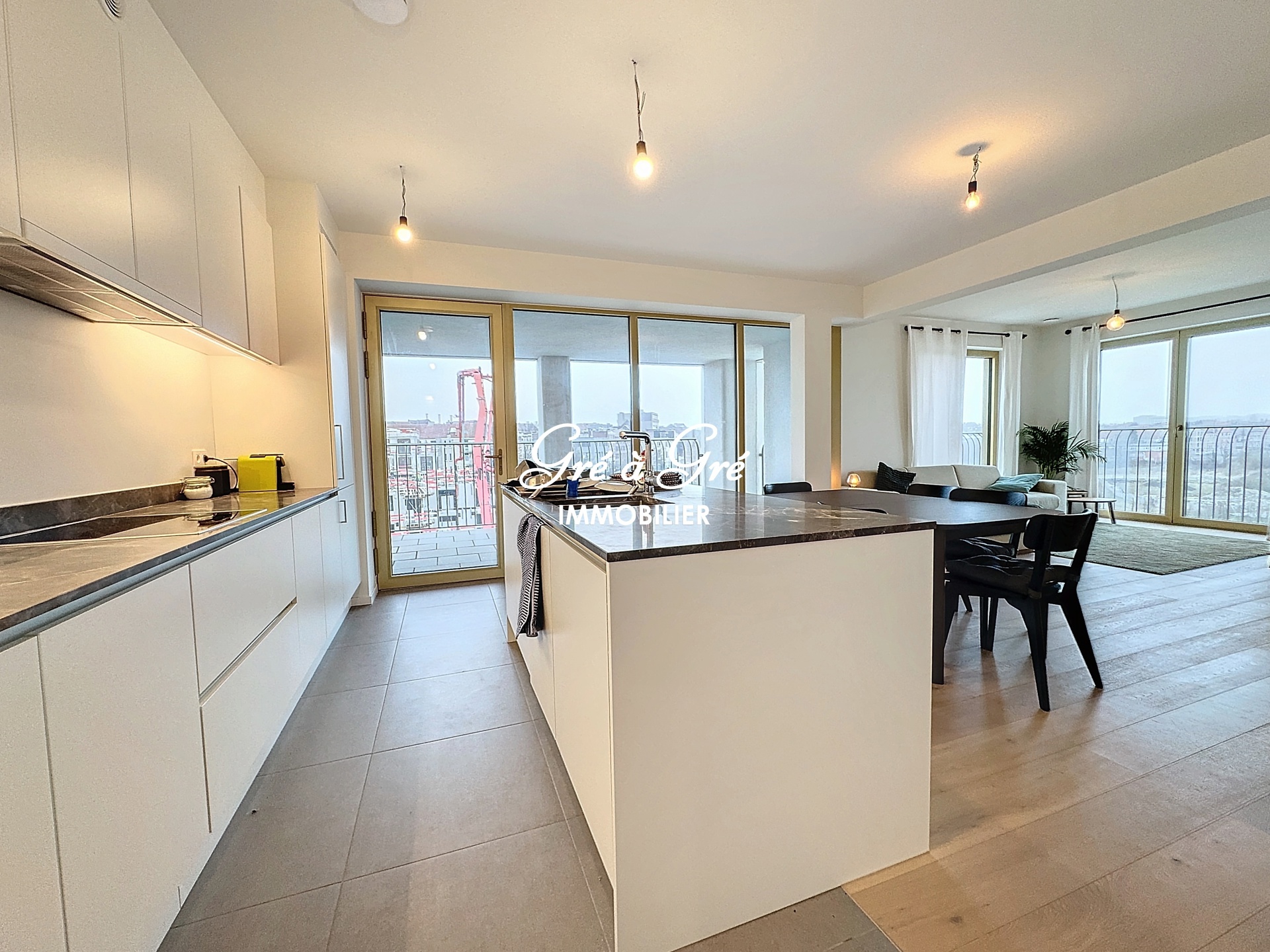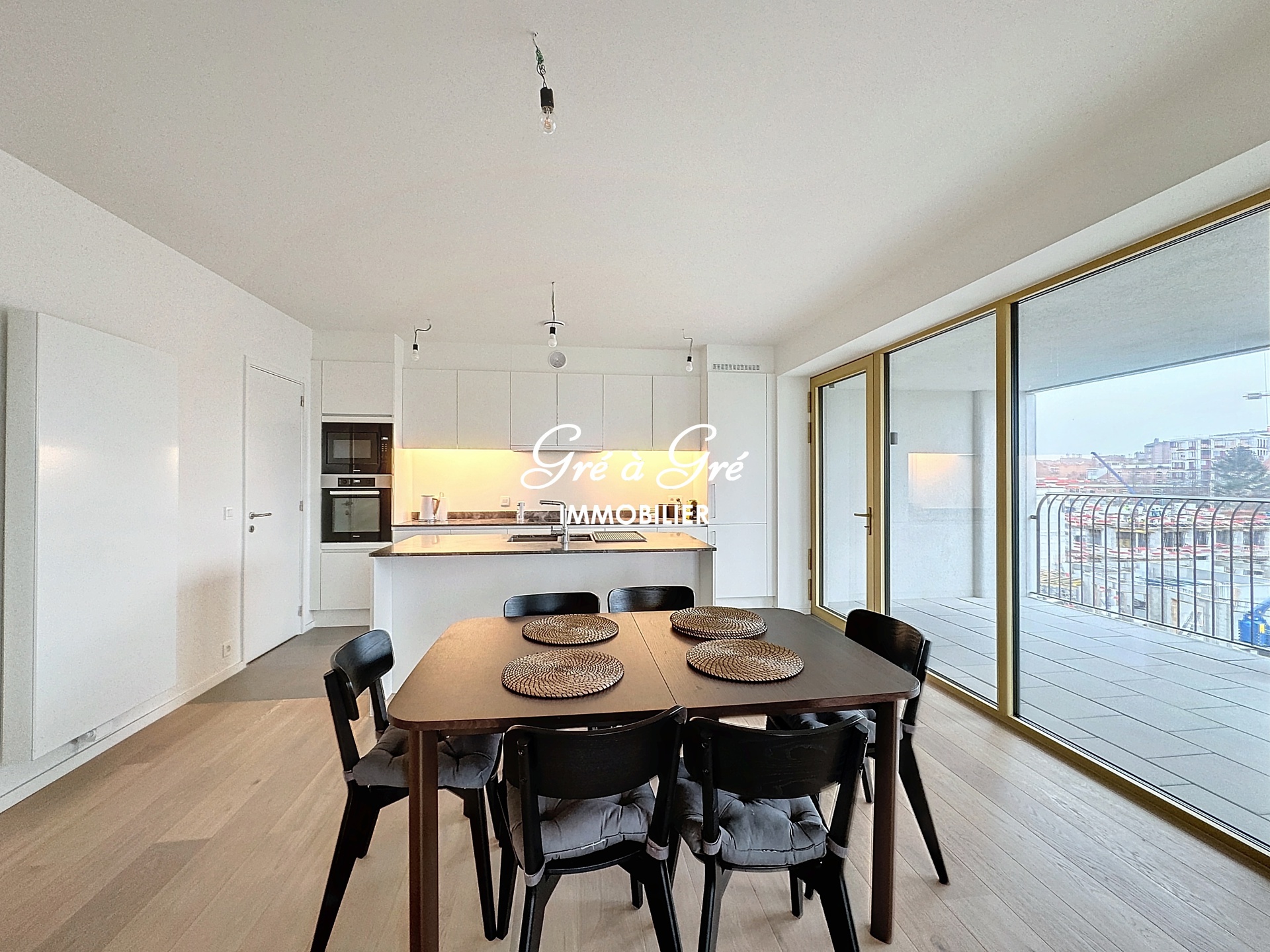 Hall d'entrée avec toilette, séjour avec cuisine hyper équipée et ilot central, 3 chambres, une salle de bains avec wc, une salle de douches, buanderie. Terrasse couverte 15m² avec vue dégagée. Cave privative, Local vélos commun. Parking intérieur. PEB: B. Charges: 150 eur/m (communs, chauffage et eau chaude). Non compris: eau froide et électricité. Immédiatement disponible. Bail 1 an renouvelable. Possibilité location 6 mois (+10%), 3 mois (+20%)/mois.