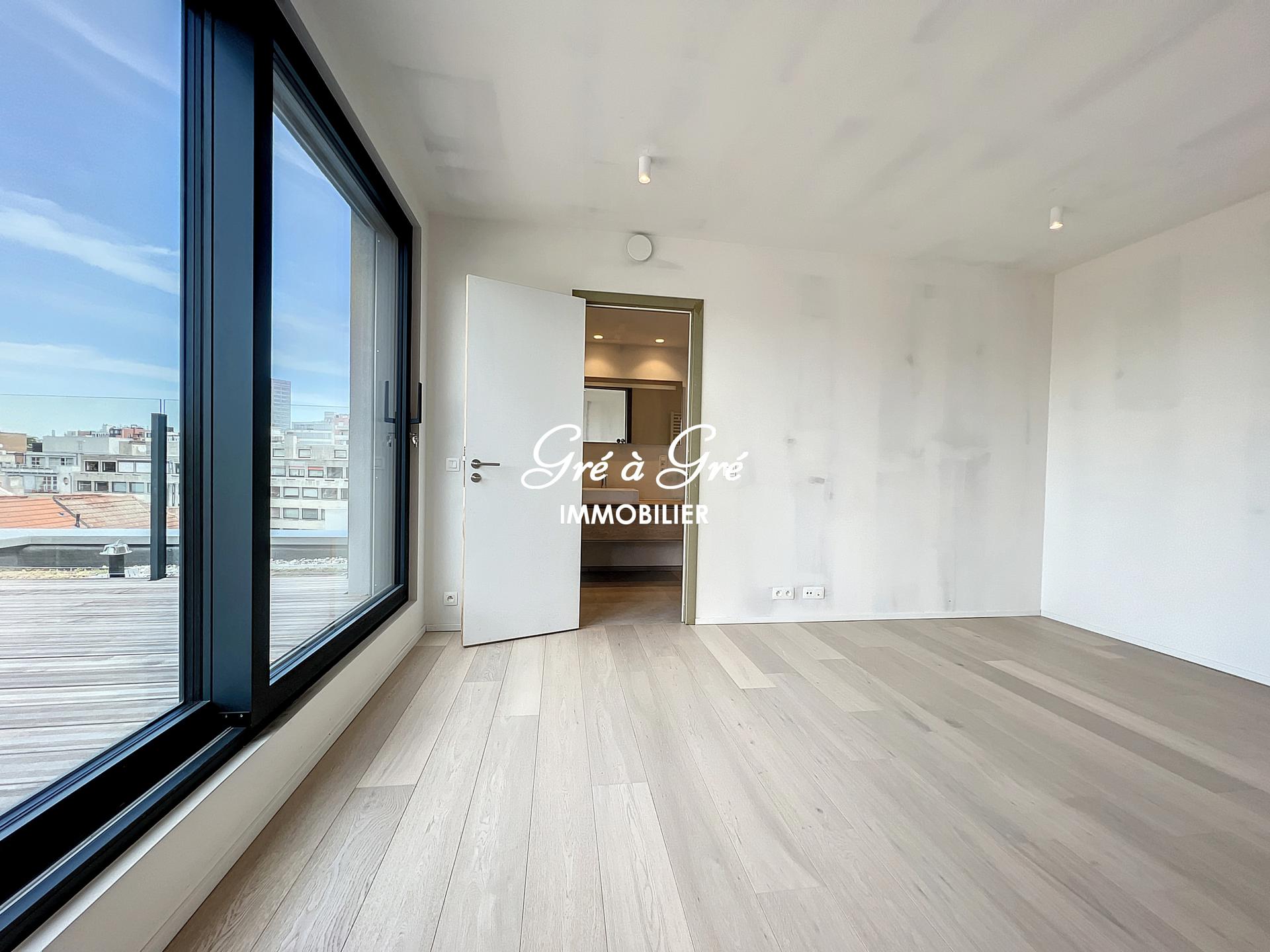 Dans un agréable quartier calme à proximité de l'avenue Louise, du Châtelain et du Bois de la Cambre, magnifique appartement PENTHOUSE NEUF (1ère occupation) bénéficiant de 2 larges terrasses (65m²) et d'une vue dégagée. Situé au 6ème étage de la résidence Balmoral, l'appartement est composé d'un hall d'entrée avec porte blindée, toilette et vestiaire, lumineux séjour (45m²) traversant avec accès aux 2 terrasses et cuisine hyper équipée avec îlot central, 2 chambres ayant chacune accès aux terrasses, salle de bains, salle de douche, terrasses exposées sud-ouest et sud-est. Local vélos et possibilité parking intérieur. Disponible immédiatement!