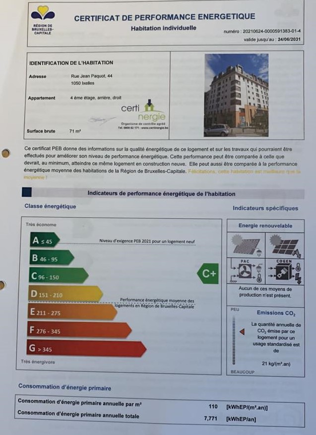 PEB: C-. Charges: 120eur/mois (provision frais communs et eau froide). NON compris: chauffage et électricité.