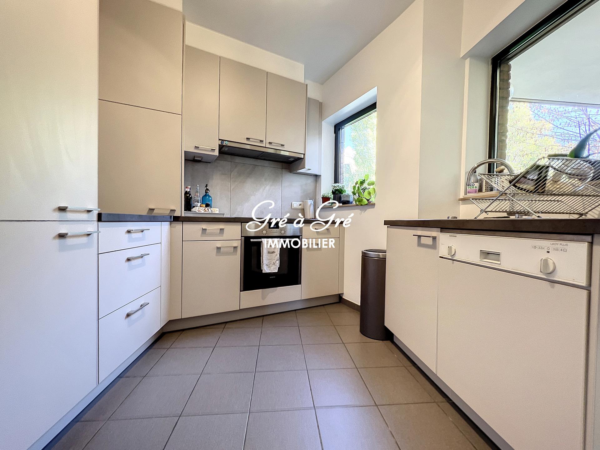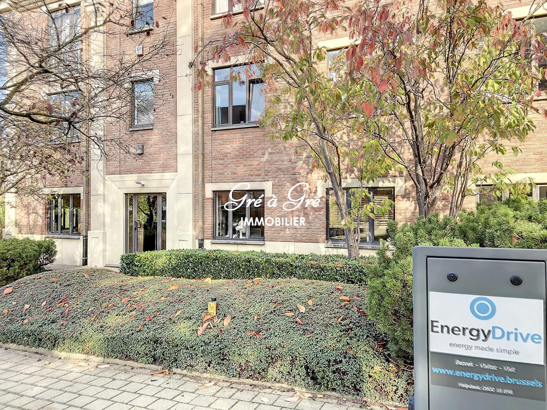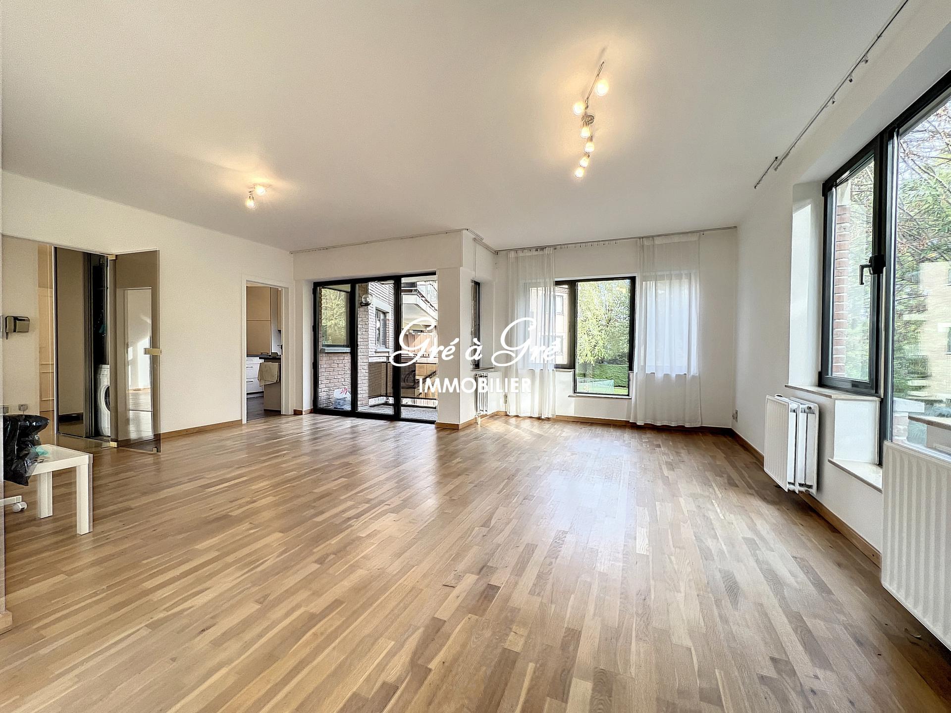 Hall d'entrée avec vestiaire et toilette, grand séjour (45m²) en L, cuisine hyper-équipée, 2 belles chambres (14 et 15m²), salle de bains, salle de douches. Emplacement buanderie avec machine à laver. Agréable terrasse couverte. Chauffage central gaz individuel (2011/condensation). Cave privative (10m²). Au sous-sol de l'immeuble, grand garage pour 2 voitures . PEB: C- (146). Charges: 160 eur/mois= provision pour les communs. Consommations privatives d'eau, gaz et électricité en supplément (compteurs individuels). Chiens non admis.