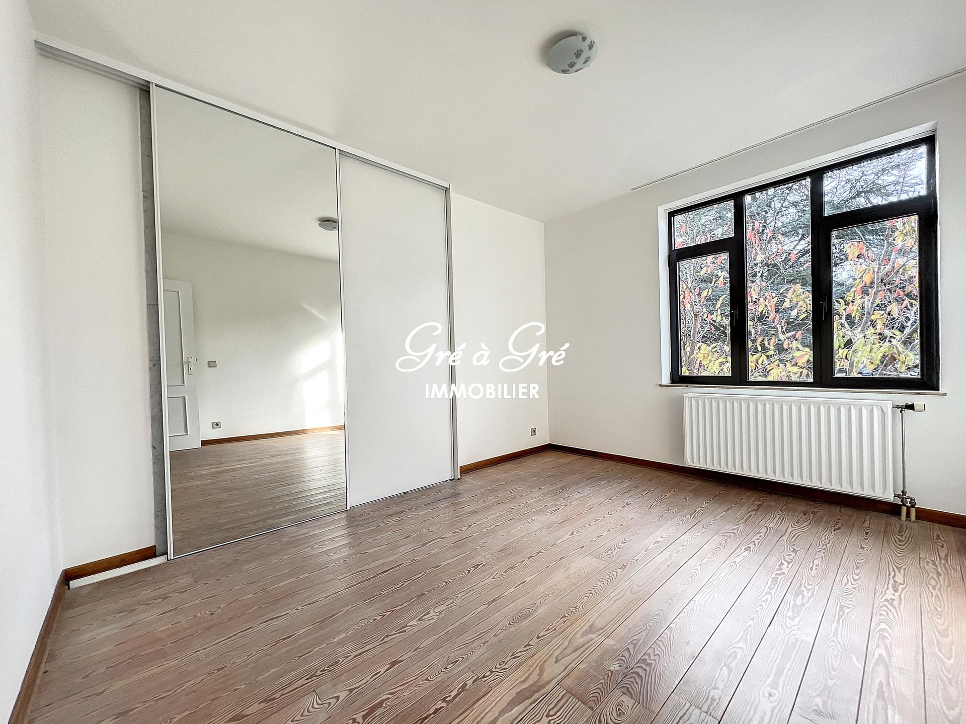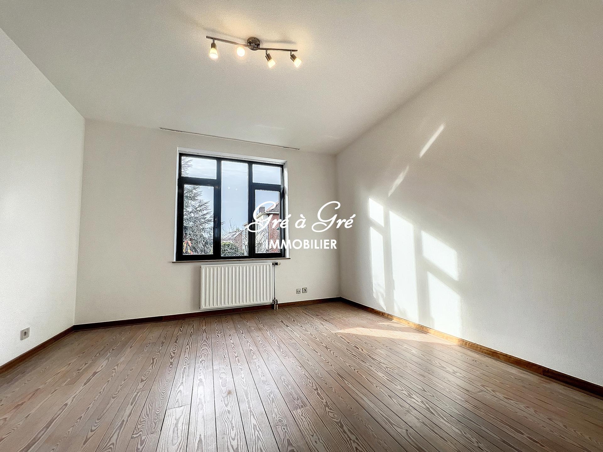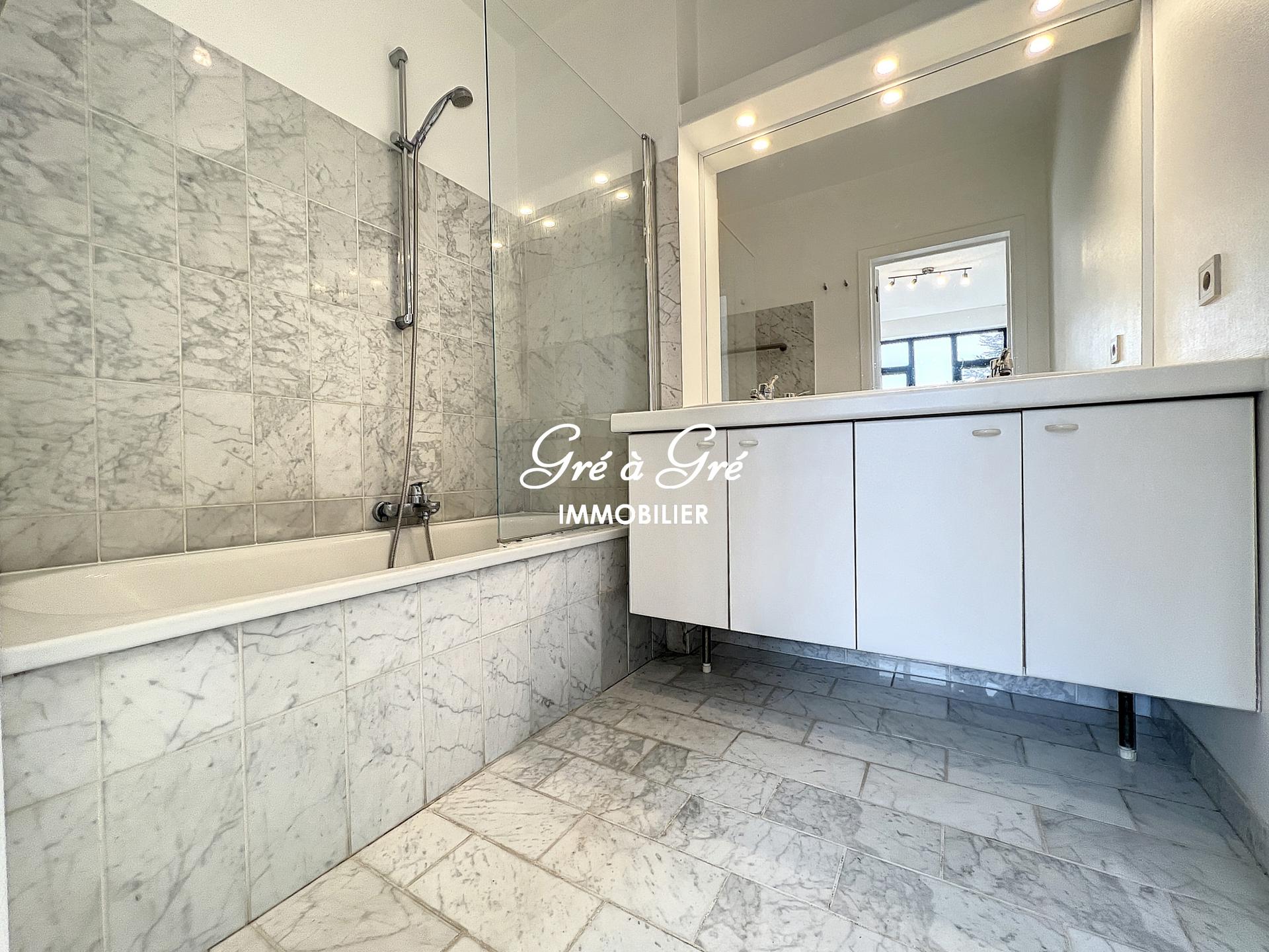 Hall d'entrée avec vestiaire et toilette, grand séjour (45m²) en L, cuisine hyper-équipée, 2 belles chambres (14 et 15m²), salle de bains, salle de douches. Emplacement buanderie avec machine à laver. Agréable terrasse couverte. Chauffage central gaz individuel (2011/condensation). Cave privative (10m²). Au sous-sol de l'immeuble, grand garage pour 2 voitures . PEB: C- (146). Charges: 160 eur/mois= provision pour les communs. Consommations privatives d'eau, gaz et électricité en supplément (compteurs individuels). Chiens non admis.