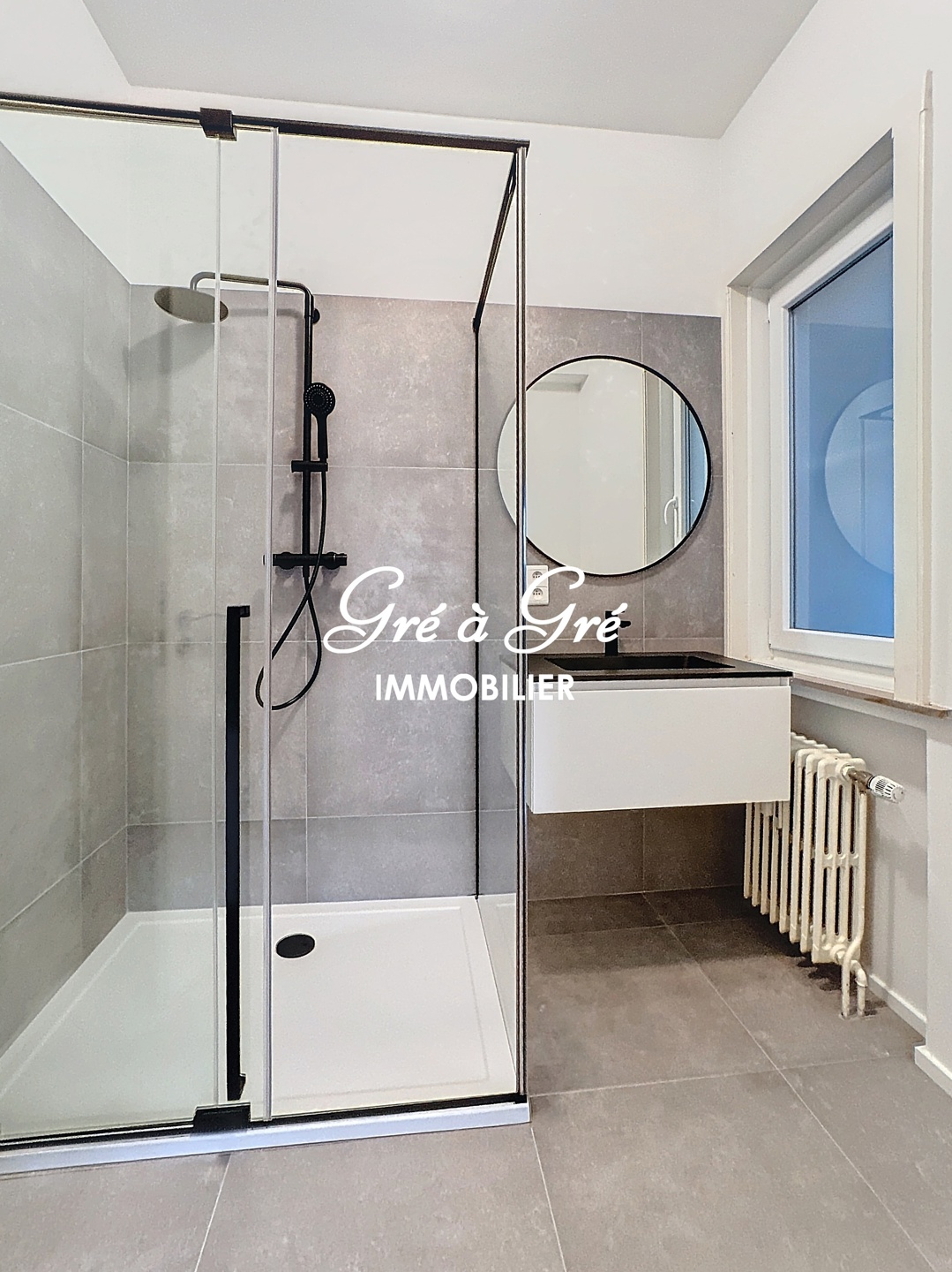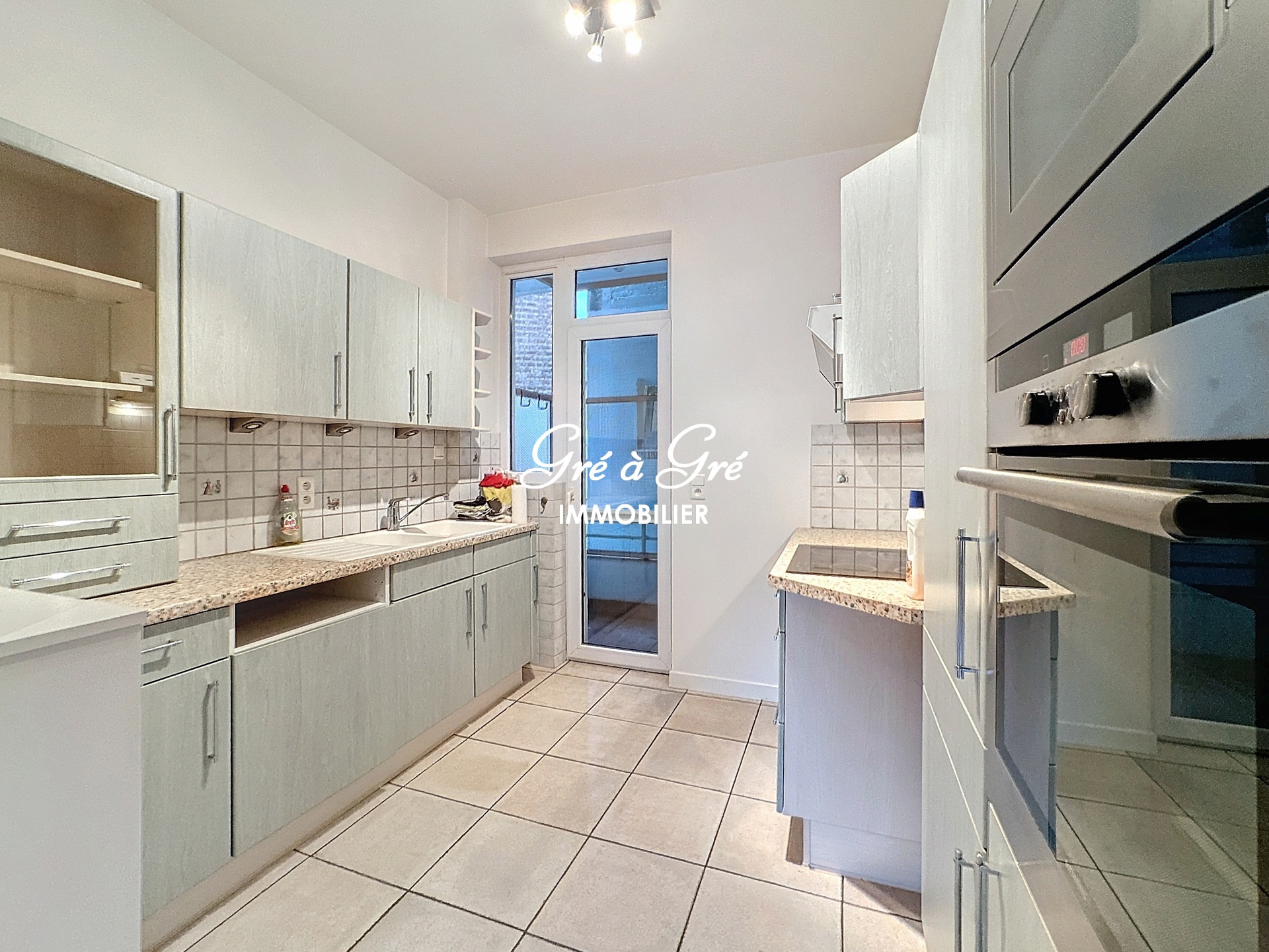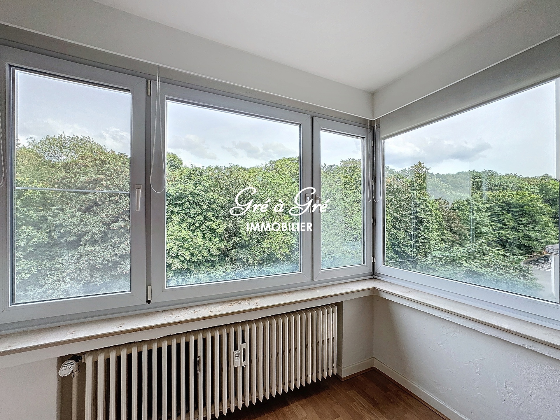 Hall d'entrée avec porte blindée, séjour avec vue sur le bois, cuisine hyper équipée (hotte, taques électriques, frigo, congélateur séparé, lfour et lave-vaisselle neuf) avec balcon (1,5m²), toilette, hall de nuit avec placards, 2 chambres (15m² et 11m²) avec vue arrière sur les jardins, salle de bain avec wc, salle de douches, buanderie. Cave. Charges: provision communs et chauffage. 1ère occupation après rénovation. Bail long terme souhaité. Libre.