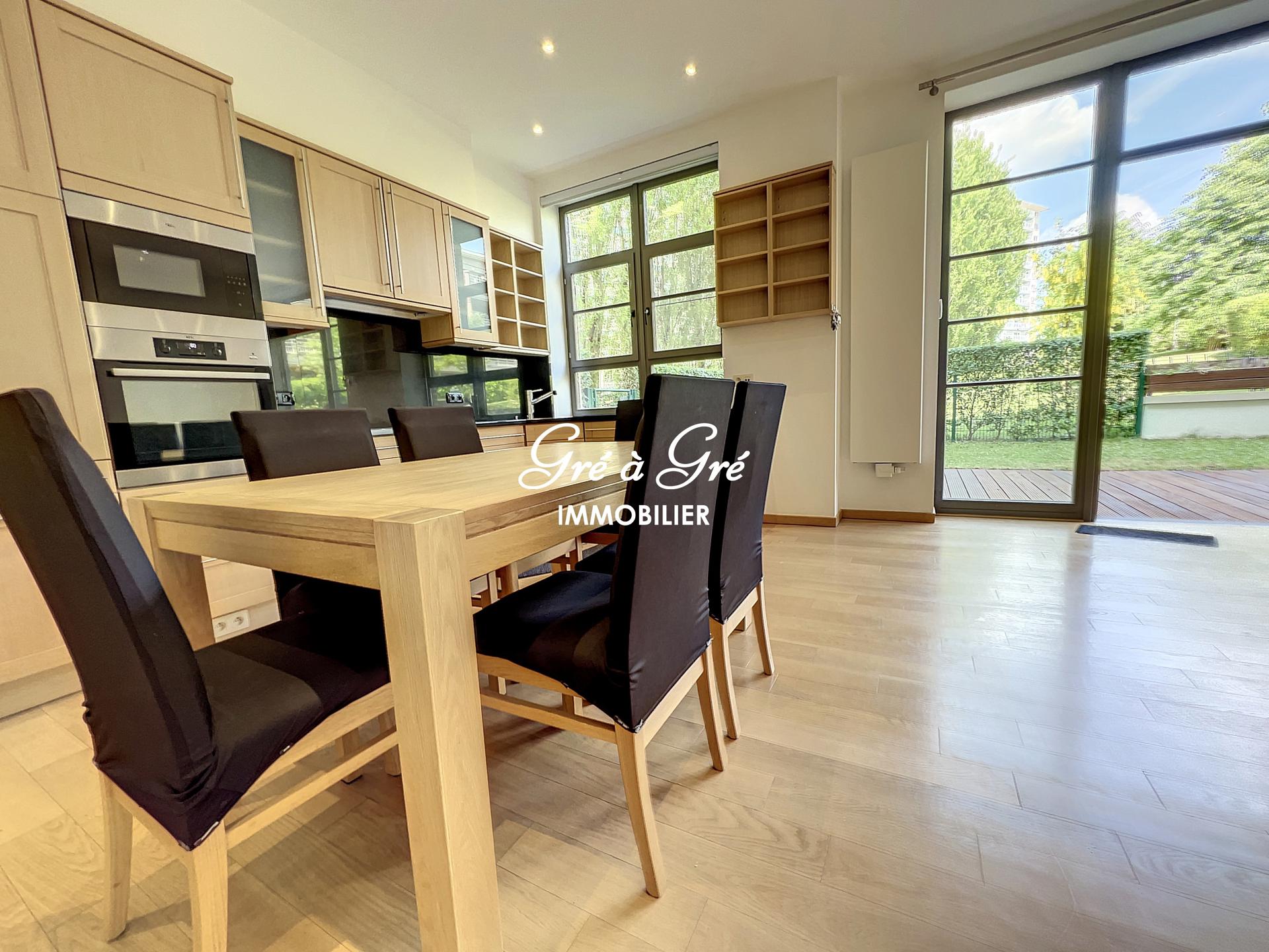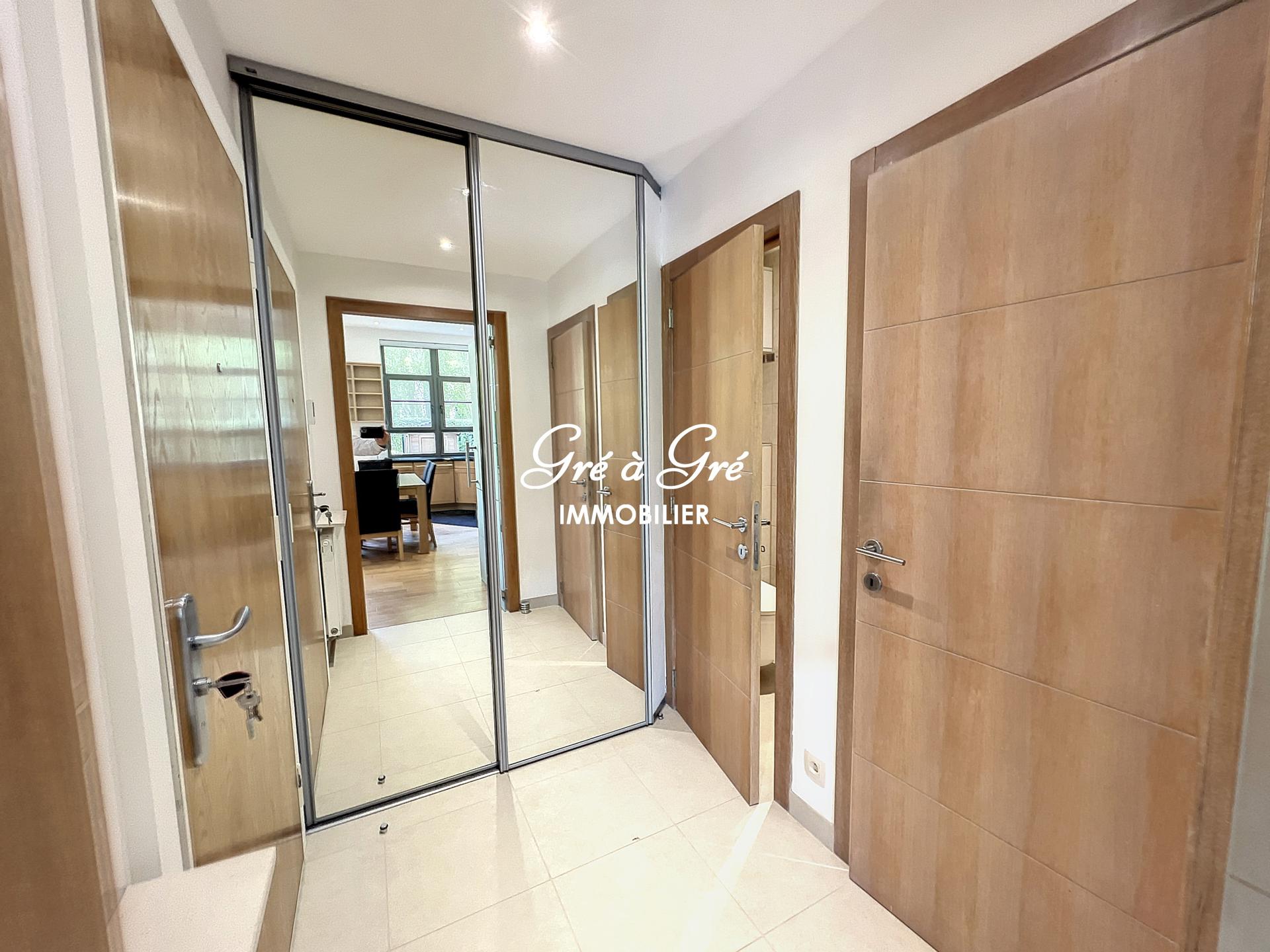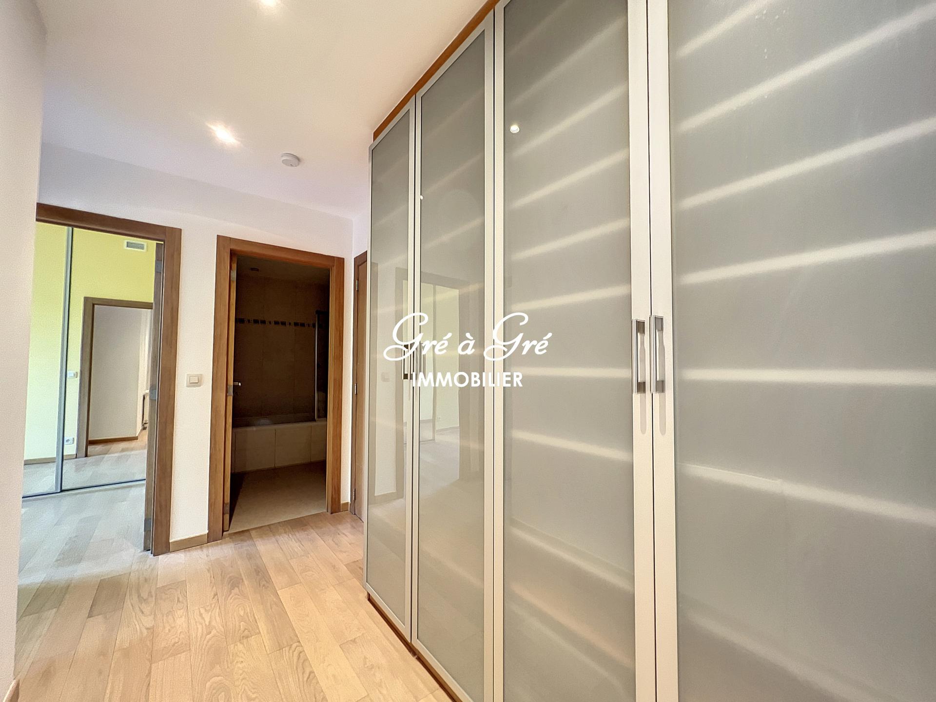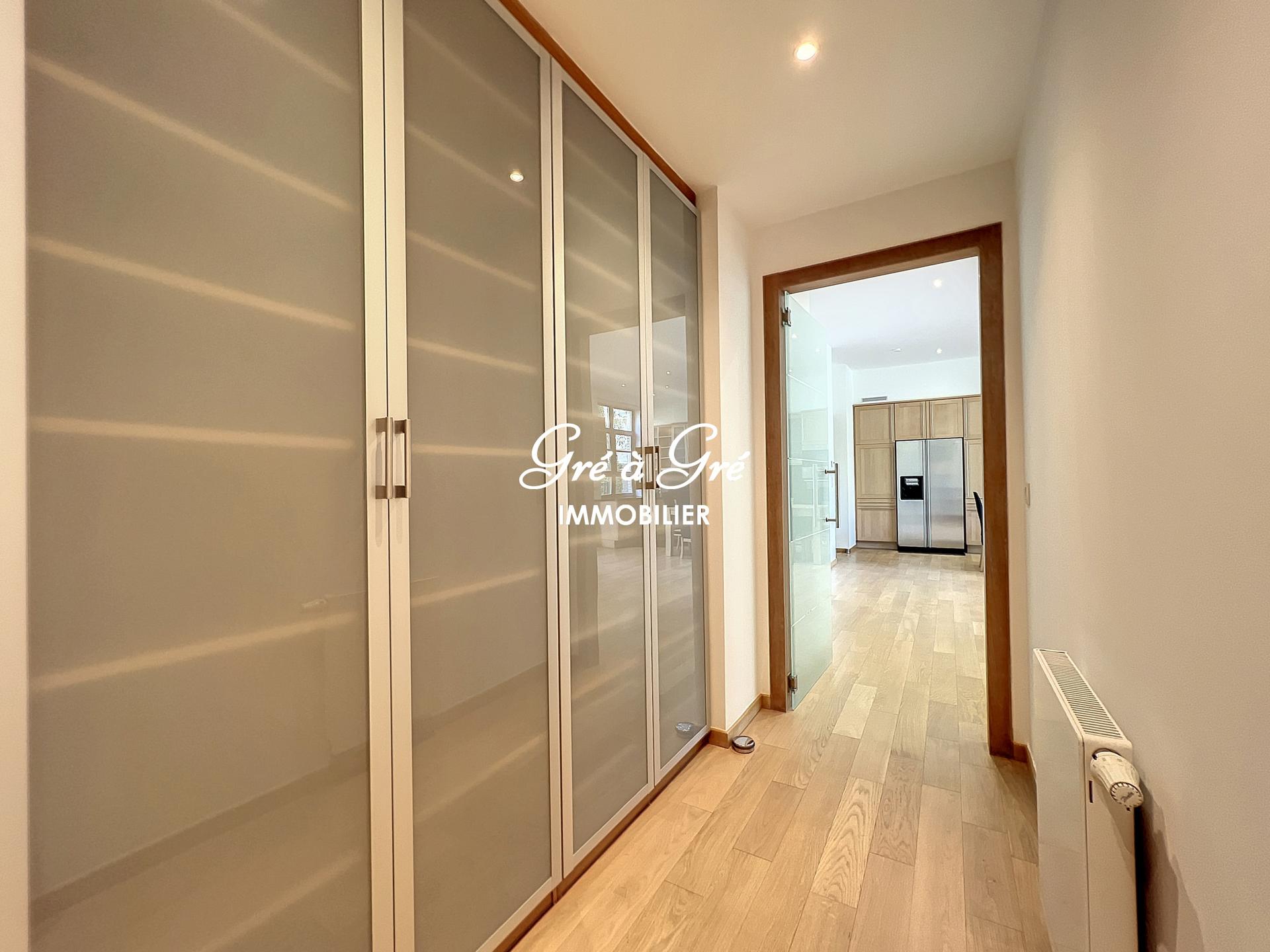 Hall d'entrée (porte blindée, toilette, vestiaire), spacieux séjour avec cuisine américaine hyper équipée (plan de travail en granit, une table et 6 chaises, lave-vaisselle, four, combiné micro-ondes, frigo américain avec distributeur eau + glace, taque vitrocéramique, hotte.) Large porte fenêtre donnant accès à une belle terrasse avec tente solaire (télécommande + leds intégrés) et jardin privatif.