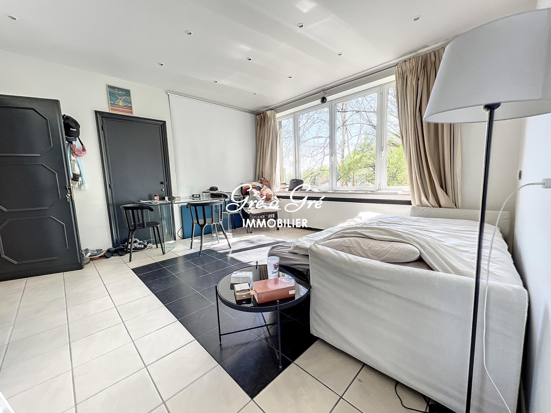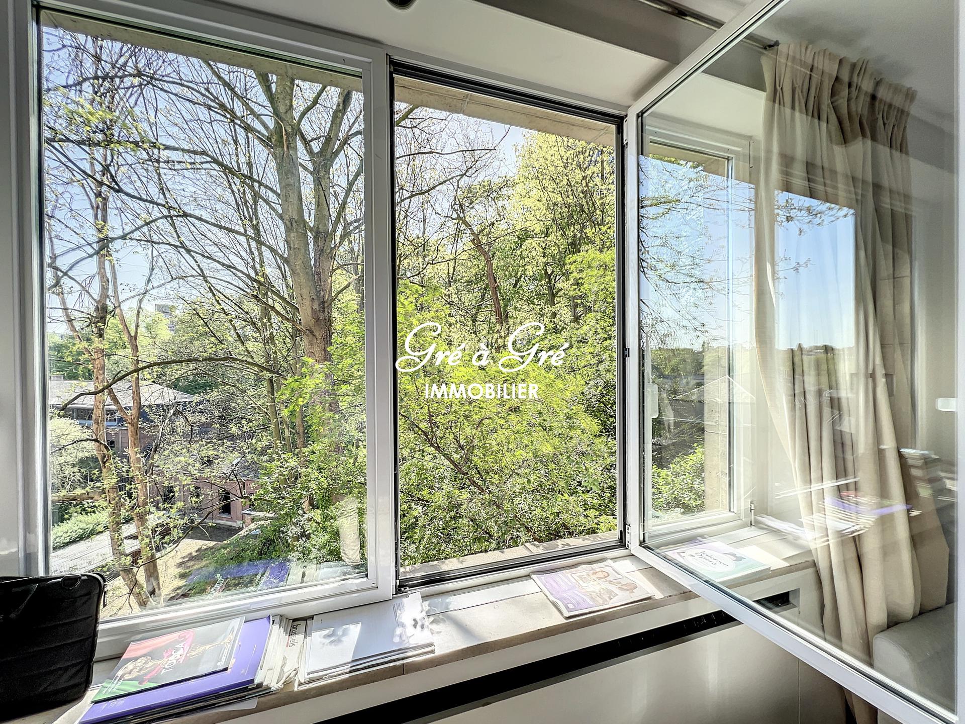 27 m² privatifs: LUMINEUX bureau (19m²) avec parquet et belle vue verdoyante sur l'abbaye de la Cambre, pièce de stockage avec armoires encastrées (1m²),