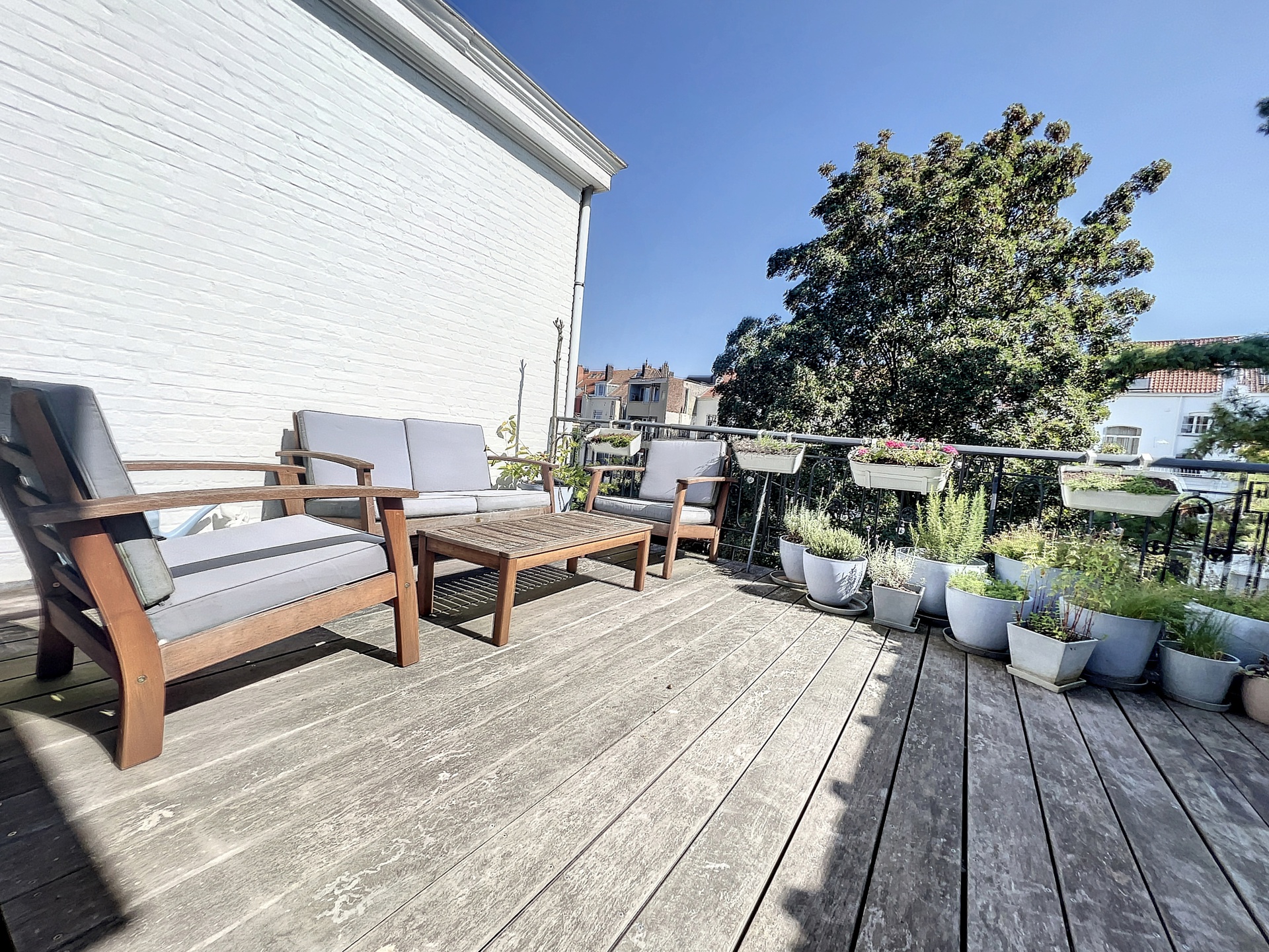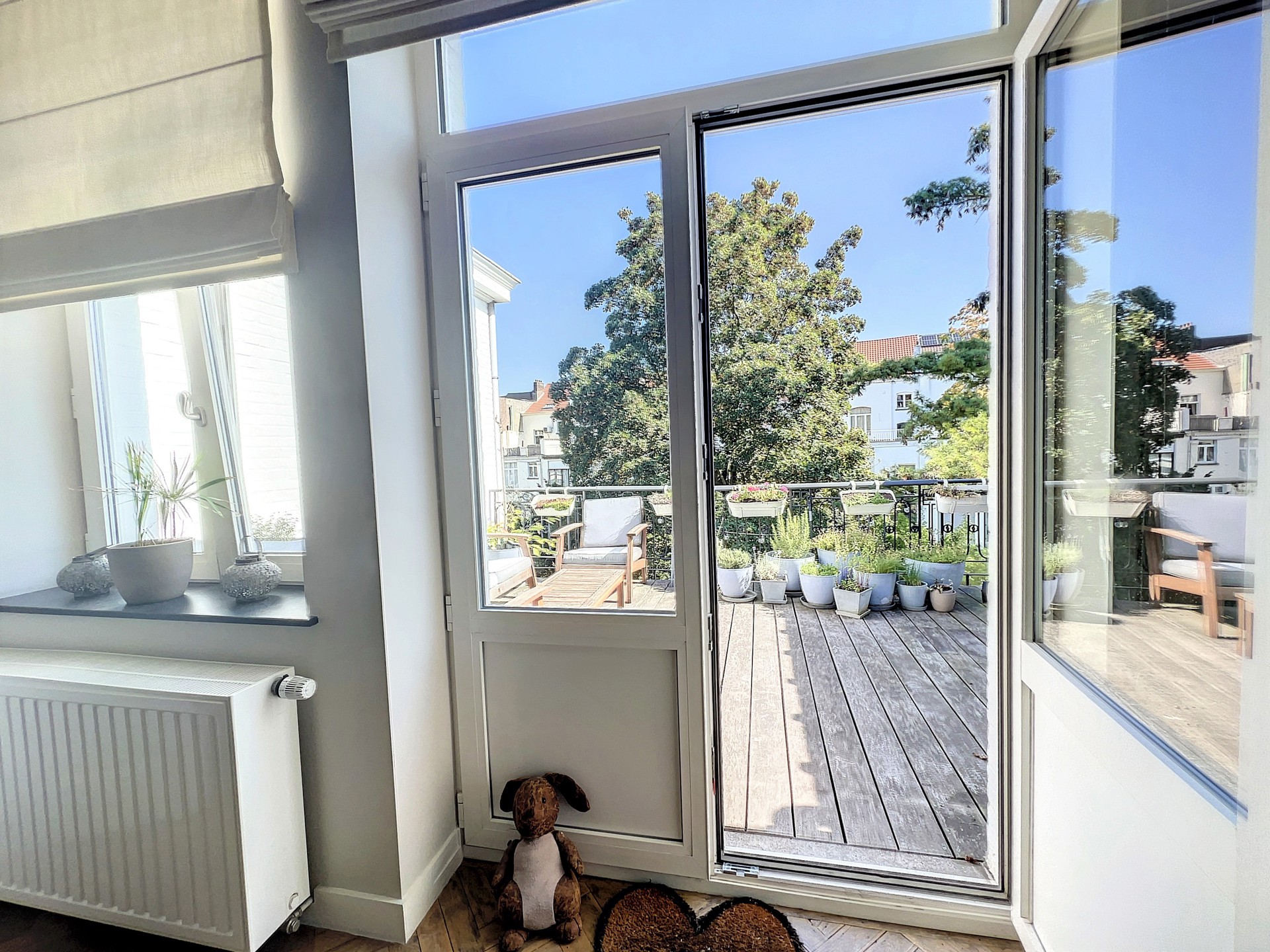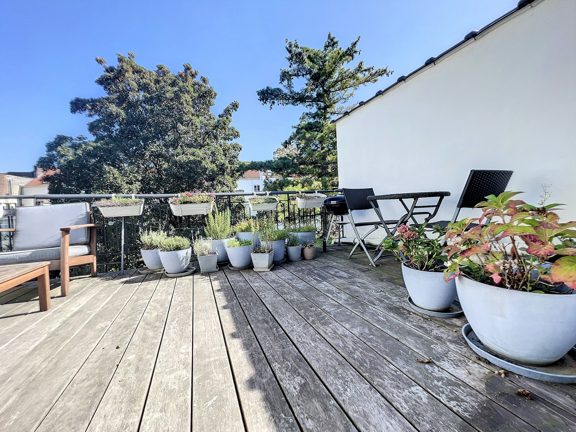 In het centrum van de Europese wijk en in de onmiddellijke nabijheid van de pleinen, het Jubelpark, Schumann (winkels-vervoer), prachtig en licht DUPLEX-PENTHOUSE appartement uitgebreid met een prachtig terras van 15m² met goed uitzicht op de zon en de bomen.