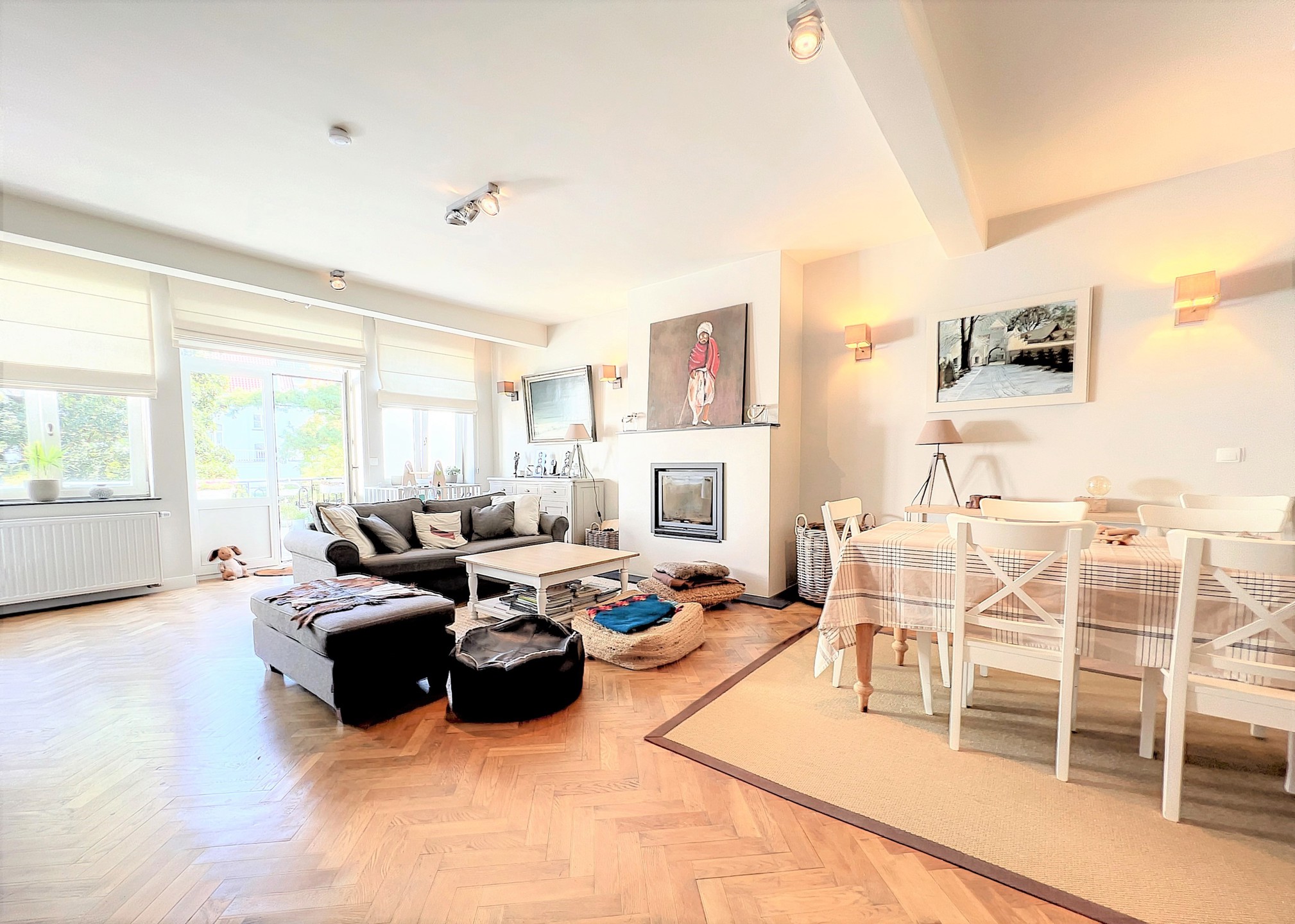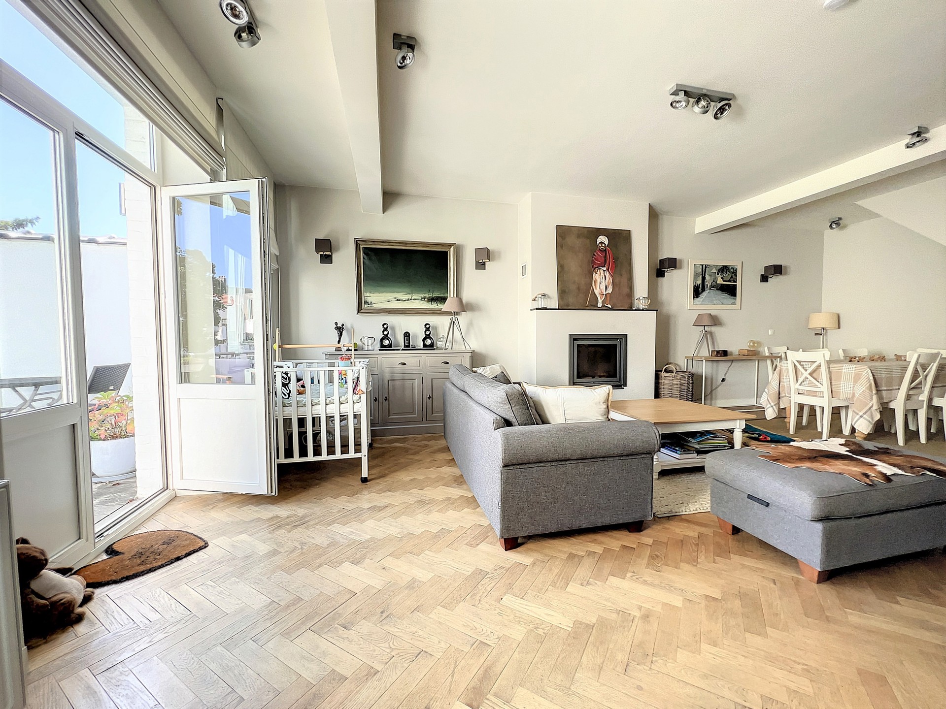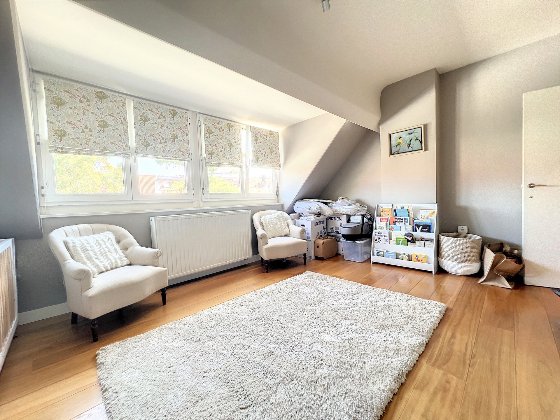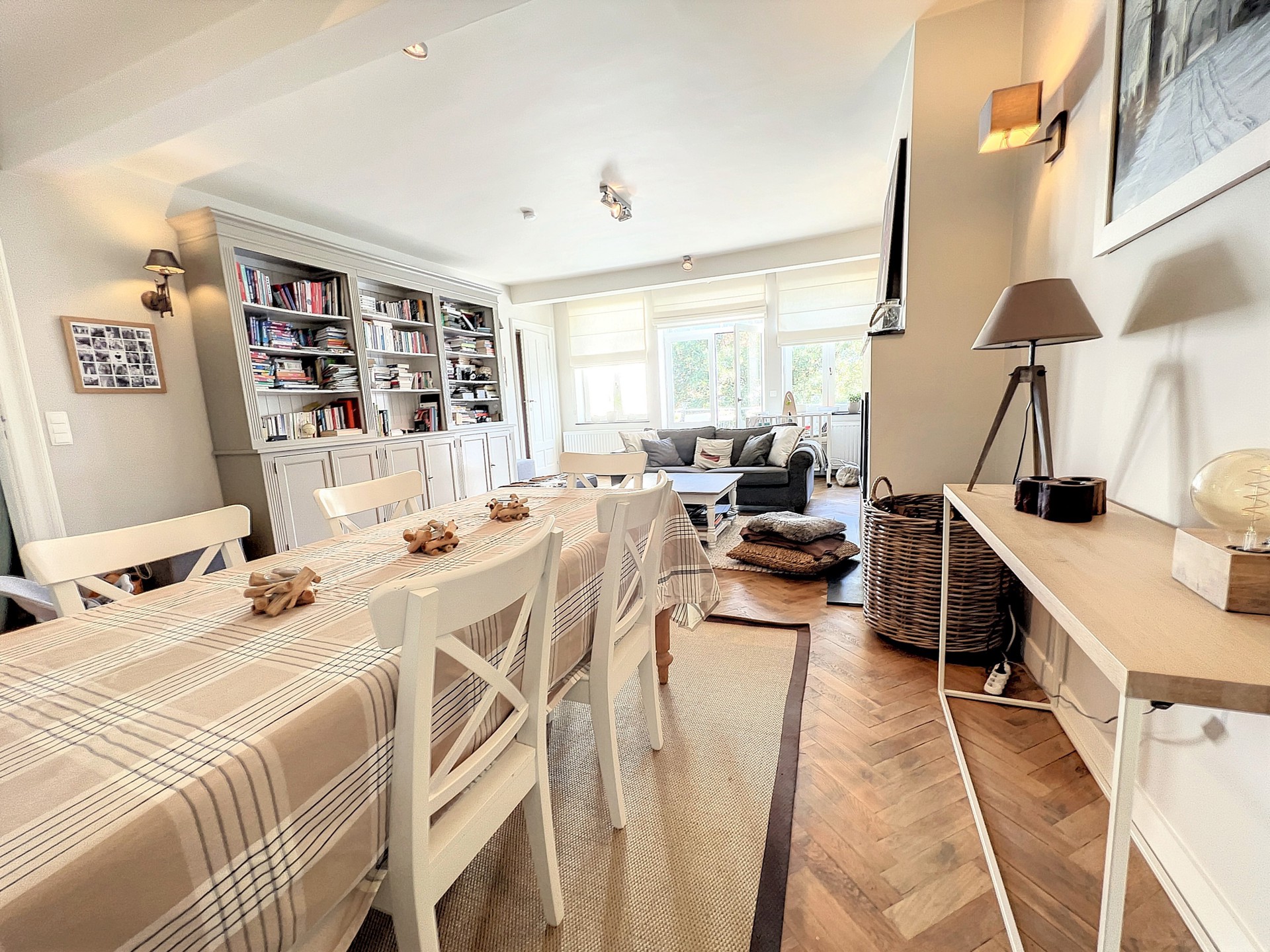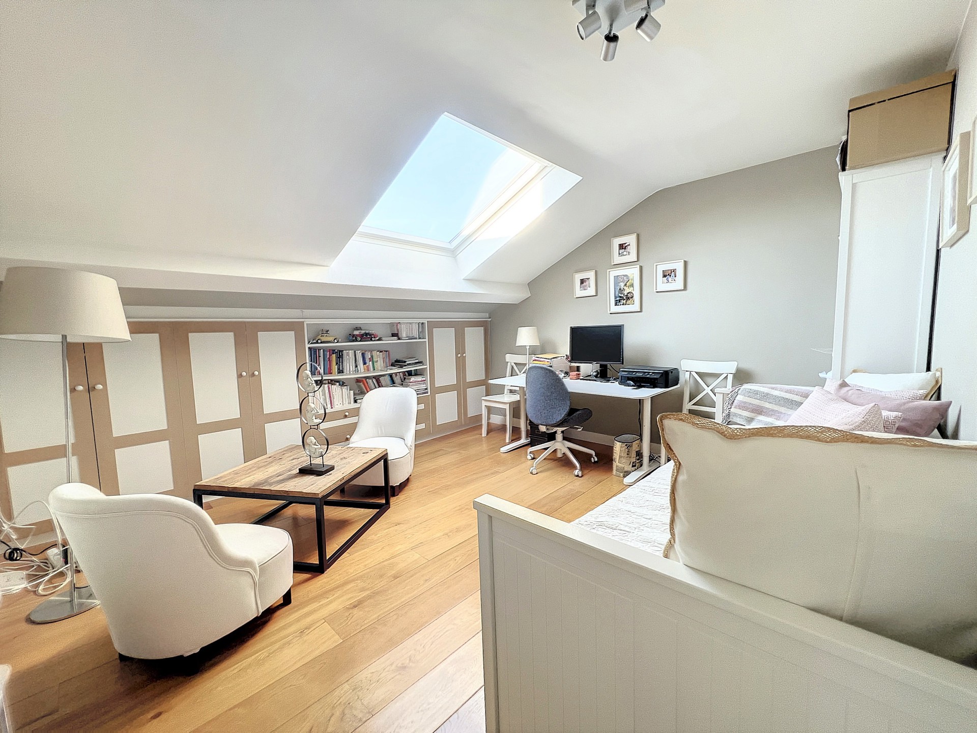 Inkomhal met vestiaire en versterkte deur. Toilet (met fonteintje + 3m² reserve), mooie woonkamer (salon & eetkamer) met open haard en boekenkast. Volledig ingerichte keuken en veel opbergruimte. Hoofdslaapkamer 30m² met garderobekast en en-suite badkamer. Twee slaapkamers (17m² en 19m²)/kantoor-logeerkamer met inbouwkasten. Twee doucheruimtes en apart toilet.