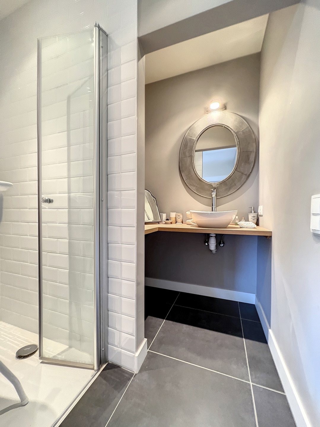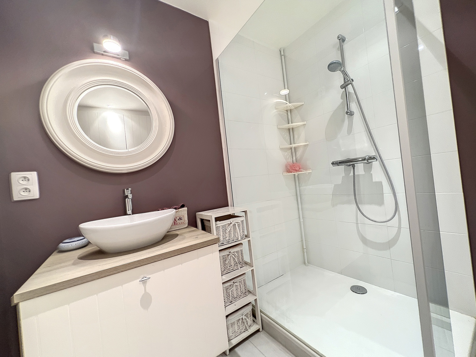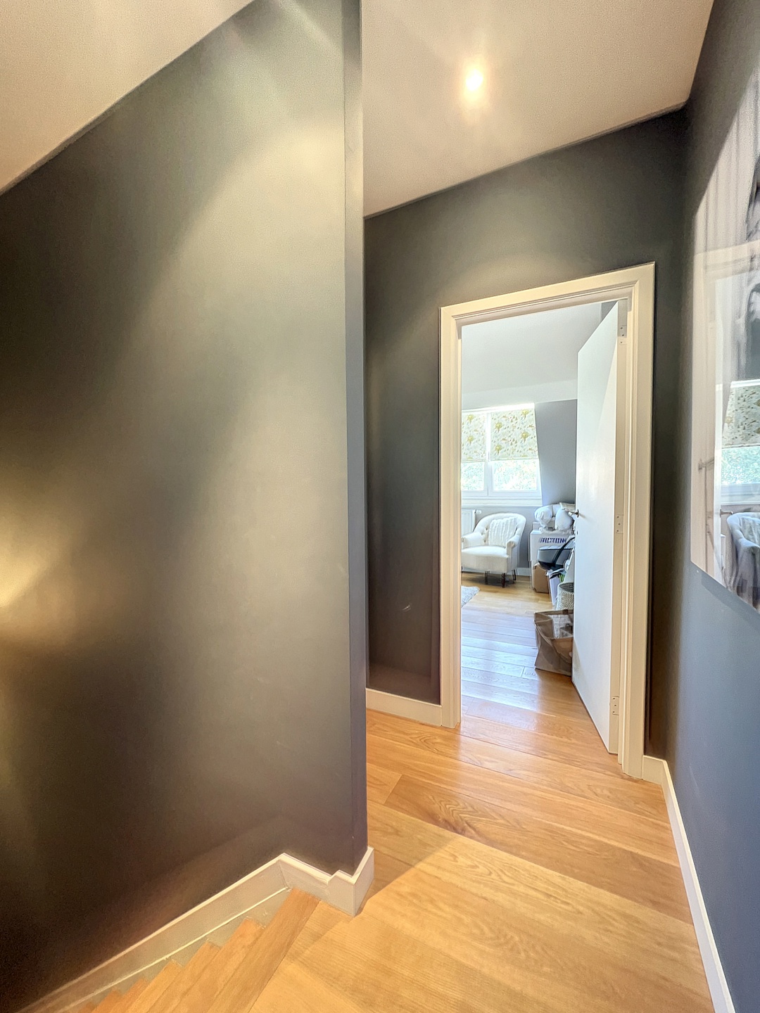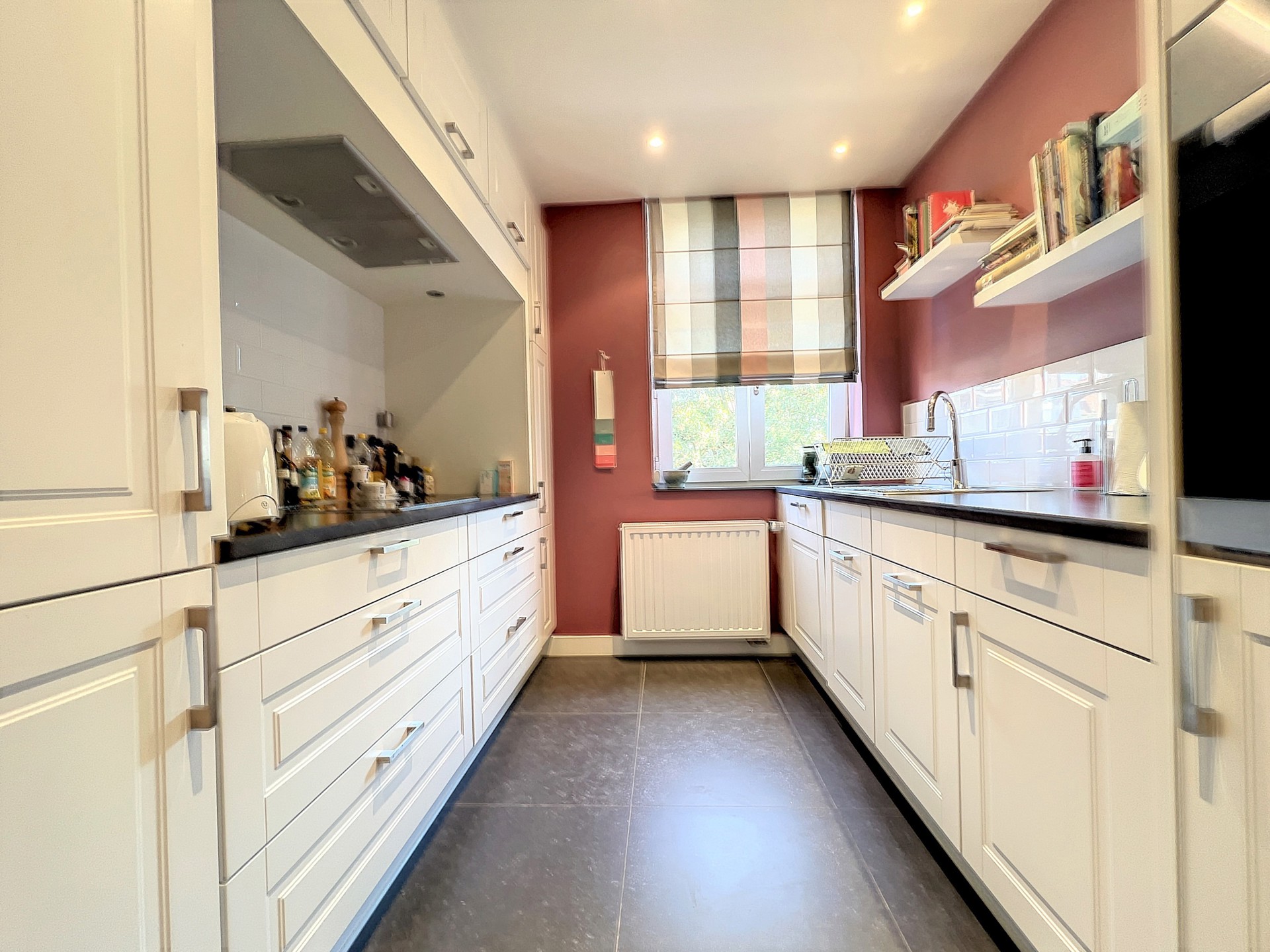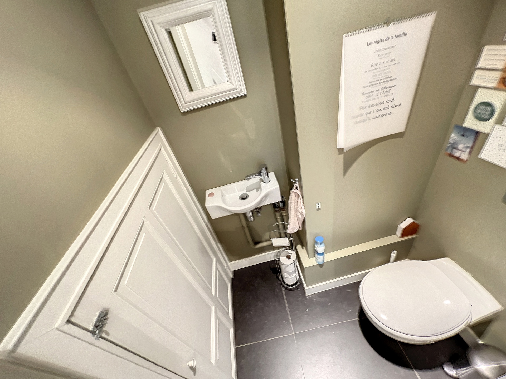 Inkomhal met vestiaire en versterkte deur. Toilet (met fonteintje + 3m² reserve), mooie woonkamer (salon & eetkamer) met open haard en boekenkast. Volledig ingerichte keuken en veel opbergruimte. Hoofdslaapkamer 30m² met garderobekast en en-suite badkamer. Twee slaapkamers (17m² en 19m²)/kantoor-logeerkamer met inbouwkasten. Twee doucheruimtes en apart toilet.