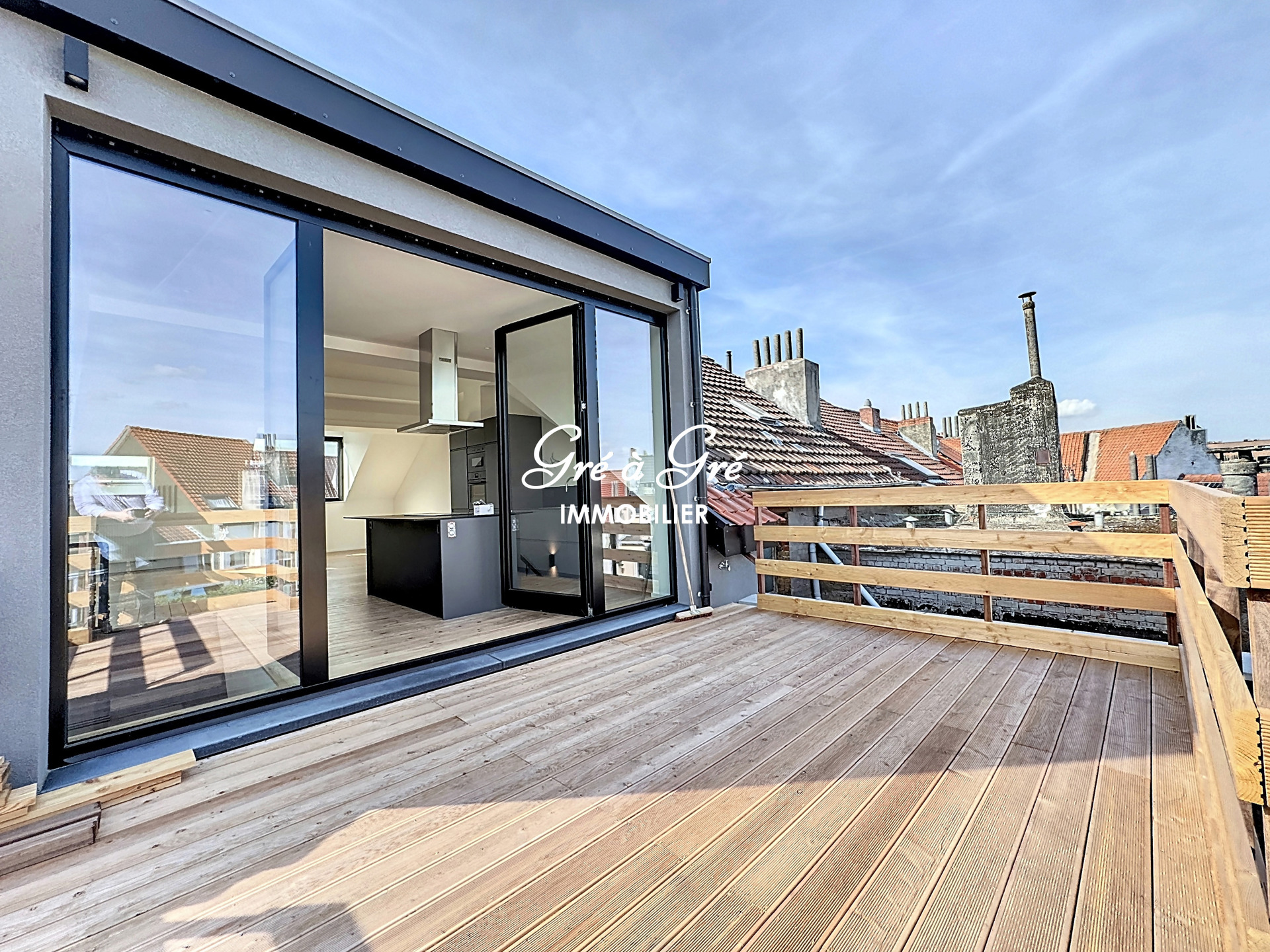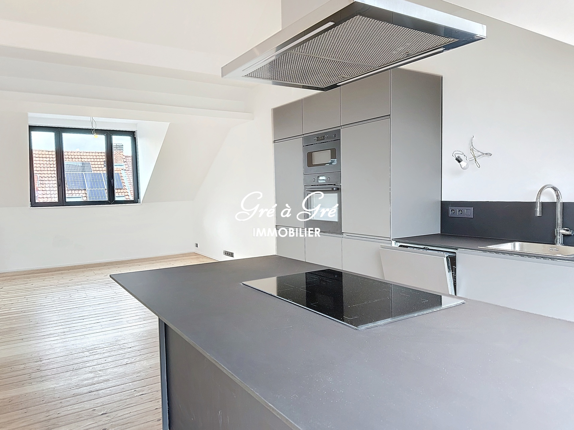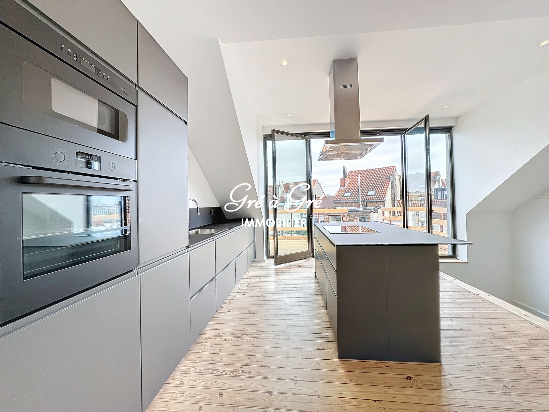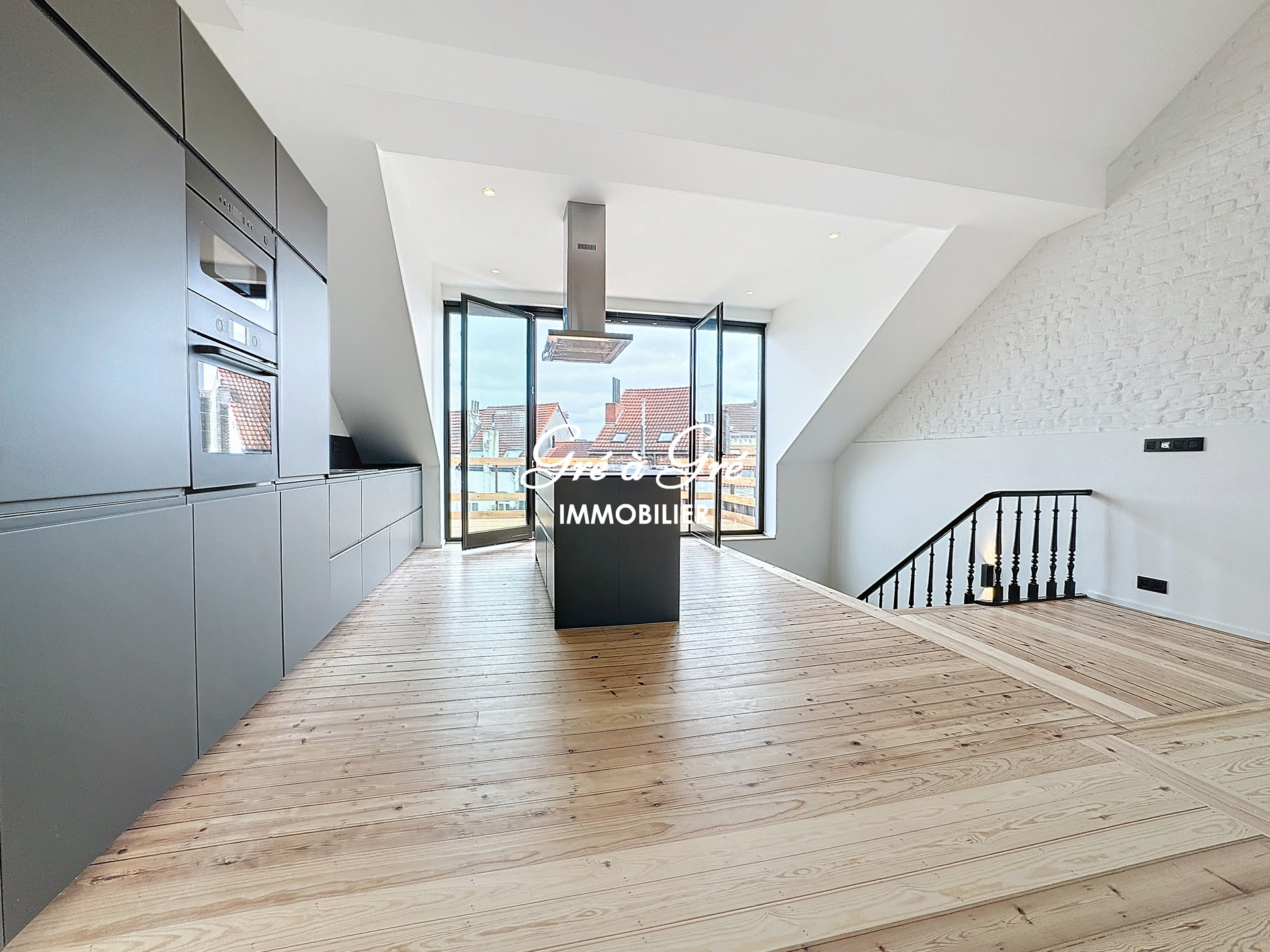 Ruime woonkamer (58m²) met mooie volledig ingerichte keuken, veel bergruimte + centraal eiland en ruime toegang tot een prachtig terras van 20m² (wordt momenteel afgewerkt).