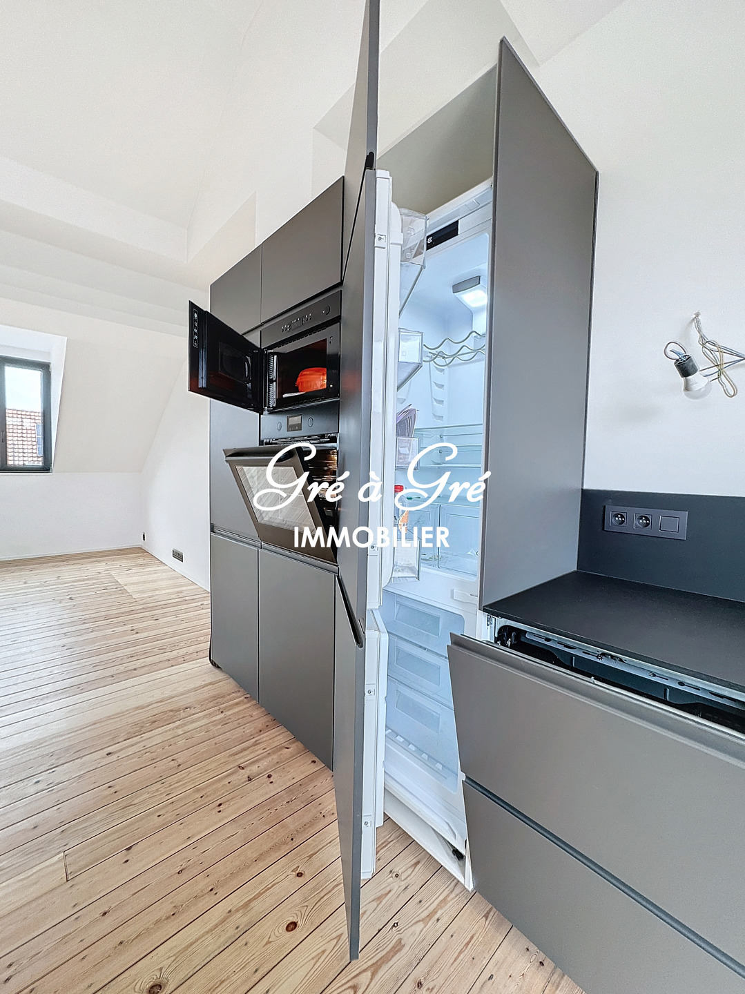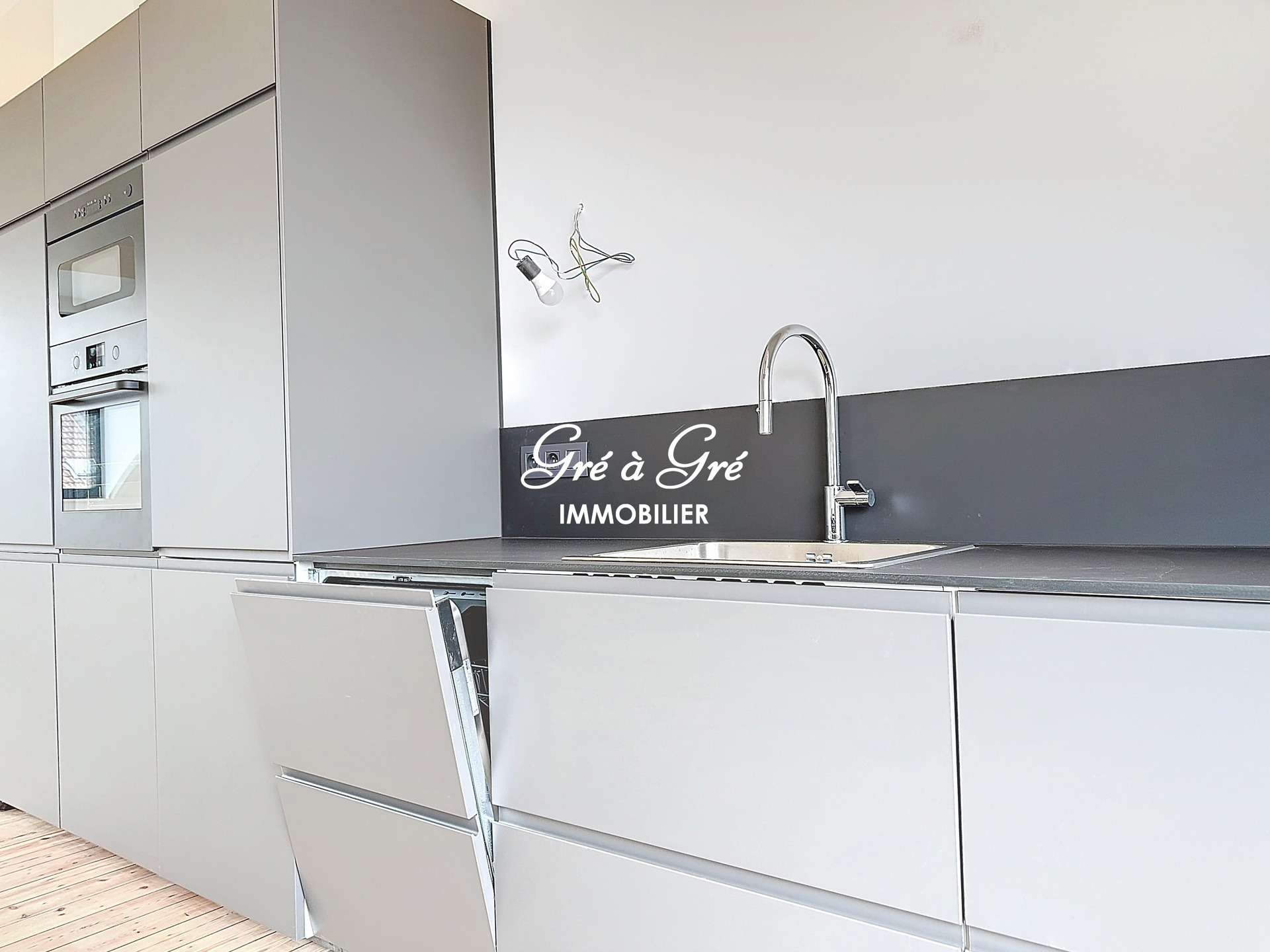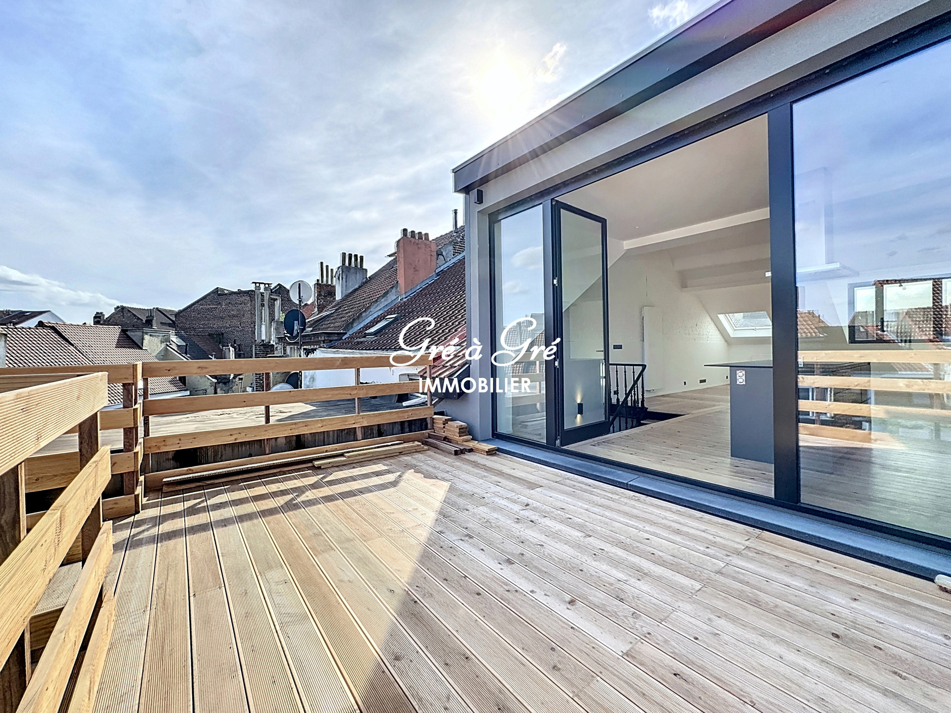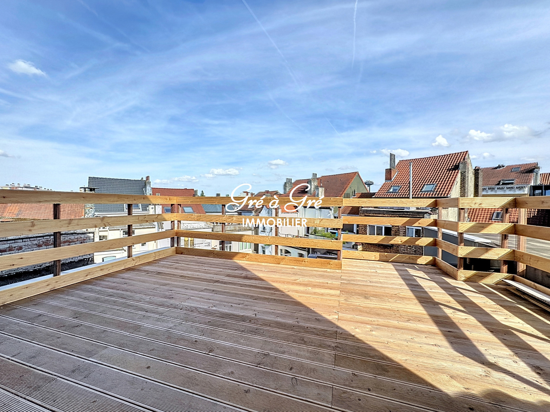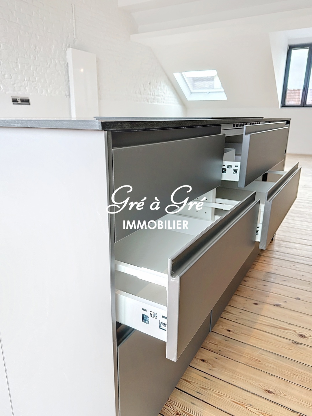 Ruime woonkamer (58m²) met mooie volledig ingerichte keuken, veel bergruimte + centraal eiland en ruime toegang tot een prachtig terras van 20m² (wordt momenteel afgewerkt).