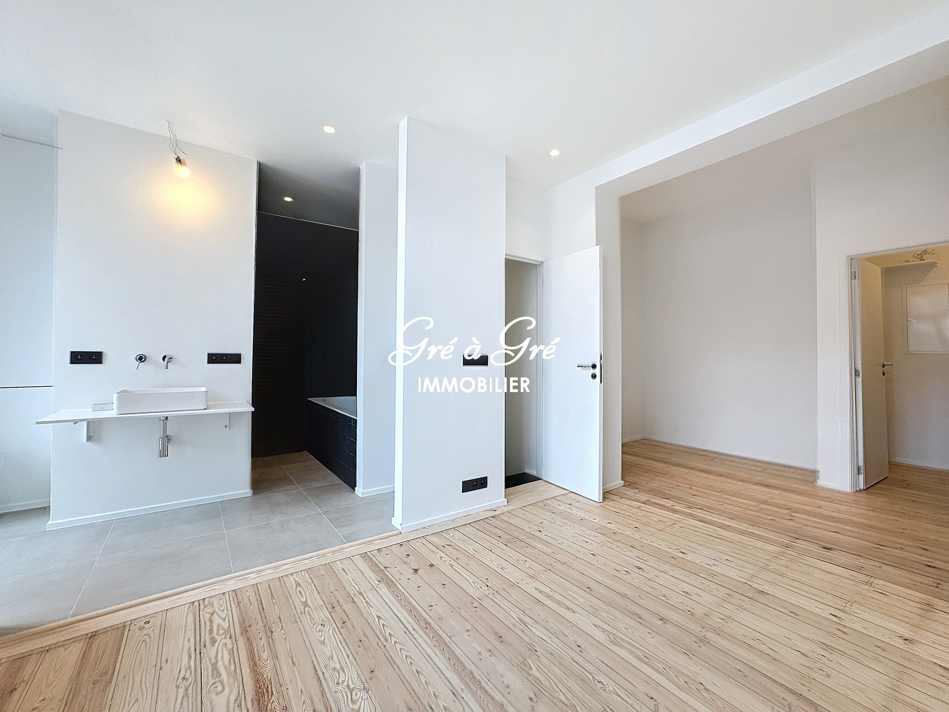 De master suite omvat de slaapkamer, badkamer (bad + douche), toilet, terras en mogelijkheid tot kleedkamer.