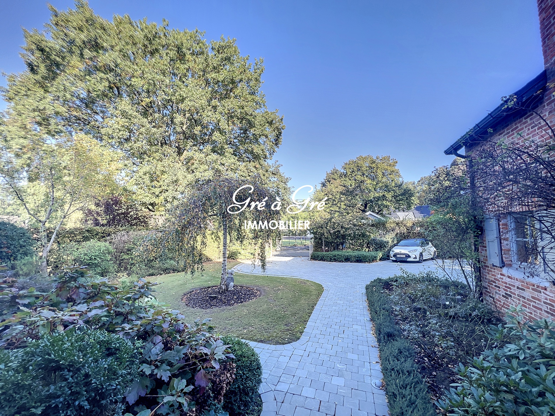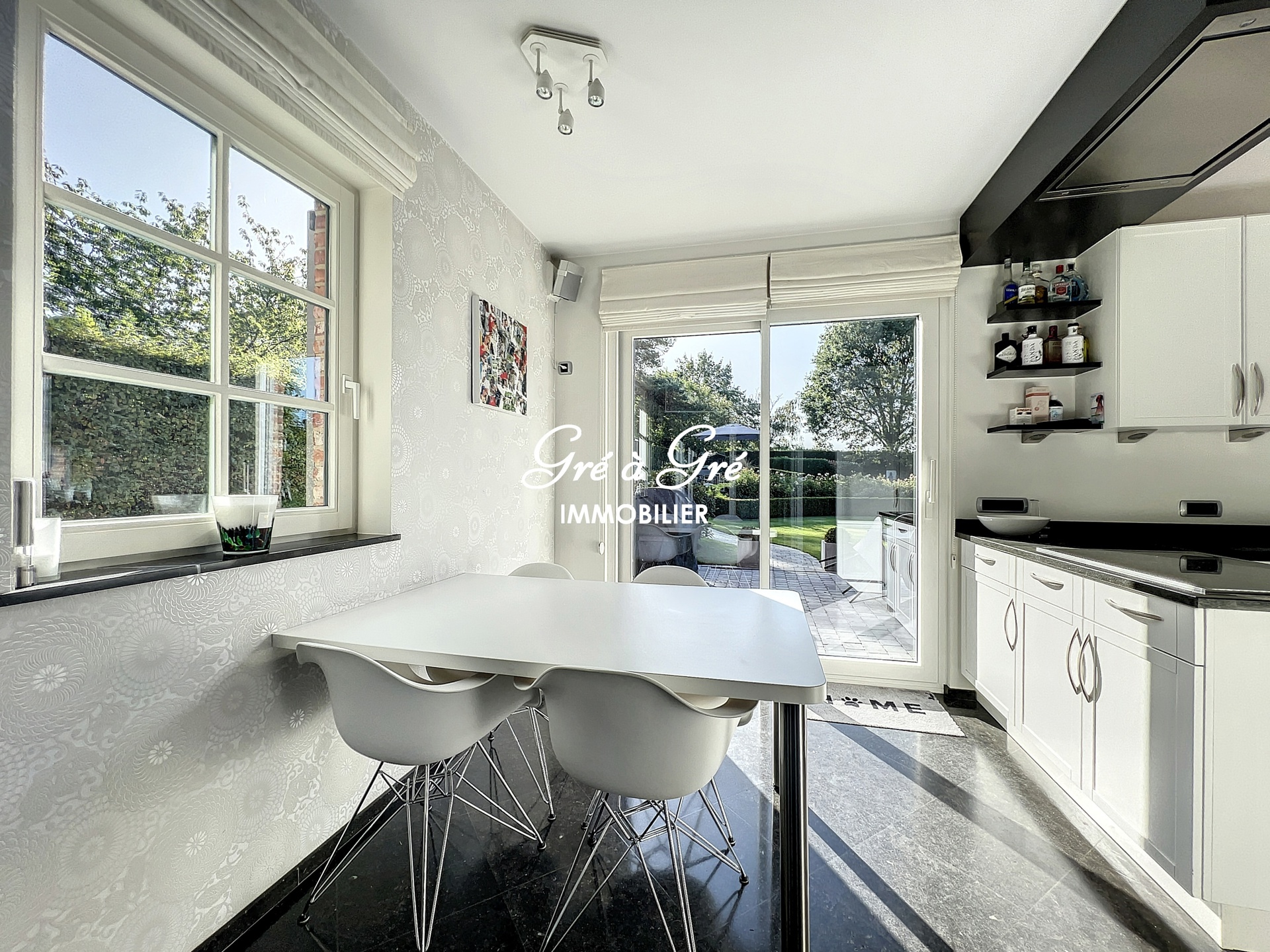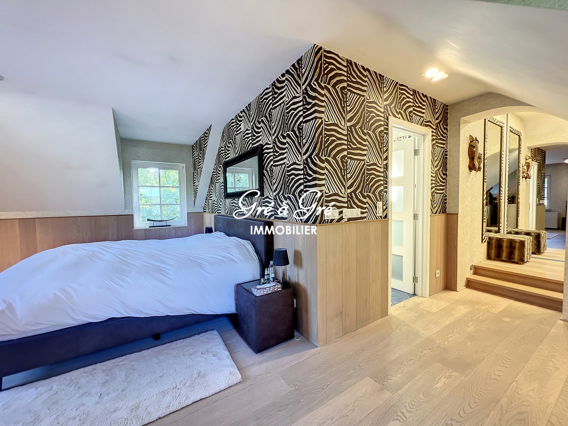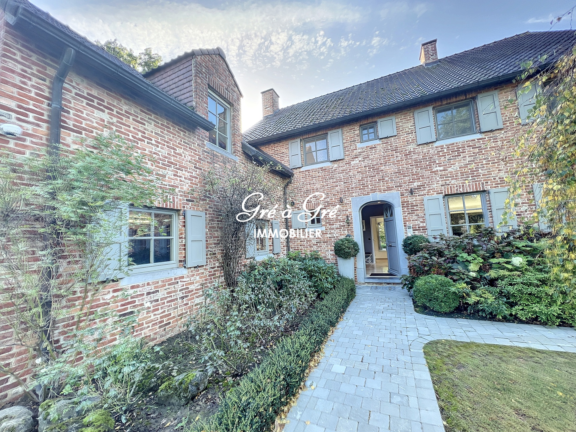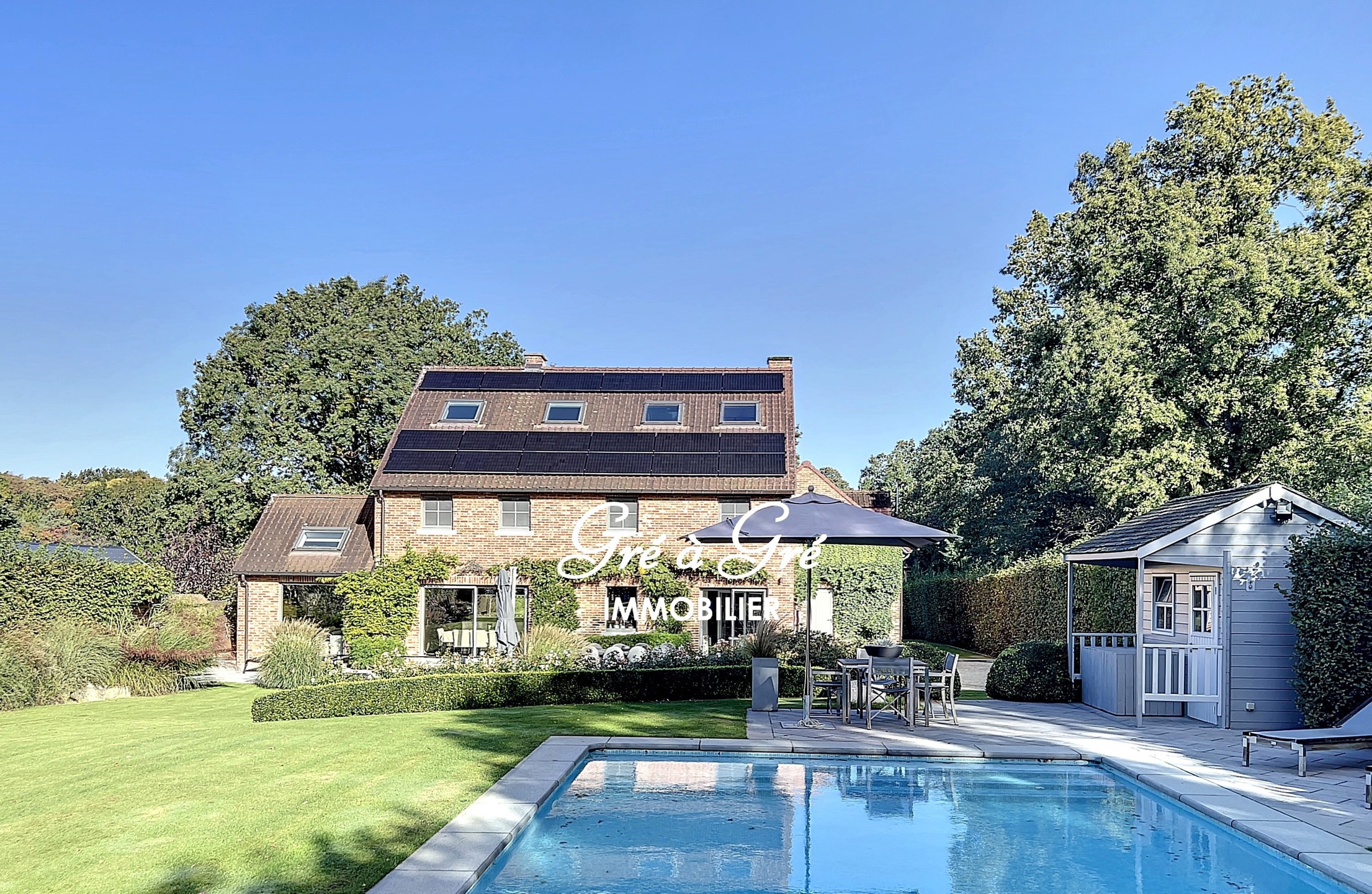 Inkomhal met vestiaire en toilet, lichtrijke woonkamer (salon met open haard, eetkamer en bibliotheek) die via grote glasopeningen toegang geeft aan het terras. Volledig ingerichte keuken, ontbijtruimte en bijkeuken/wasruimte. Op de eerste verdieping, 4 mooie slaapkamers, 2 badkamers, 1 doucheruimte, kleedkamer, 2 toiletten en kantoor. Omgebouwde zolder. Kelders, garage voor 2 auto's + buitenparkeerplaatsen.
