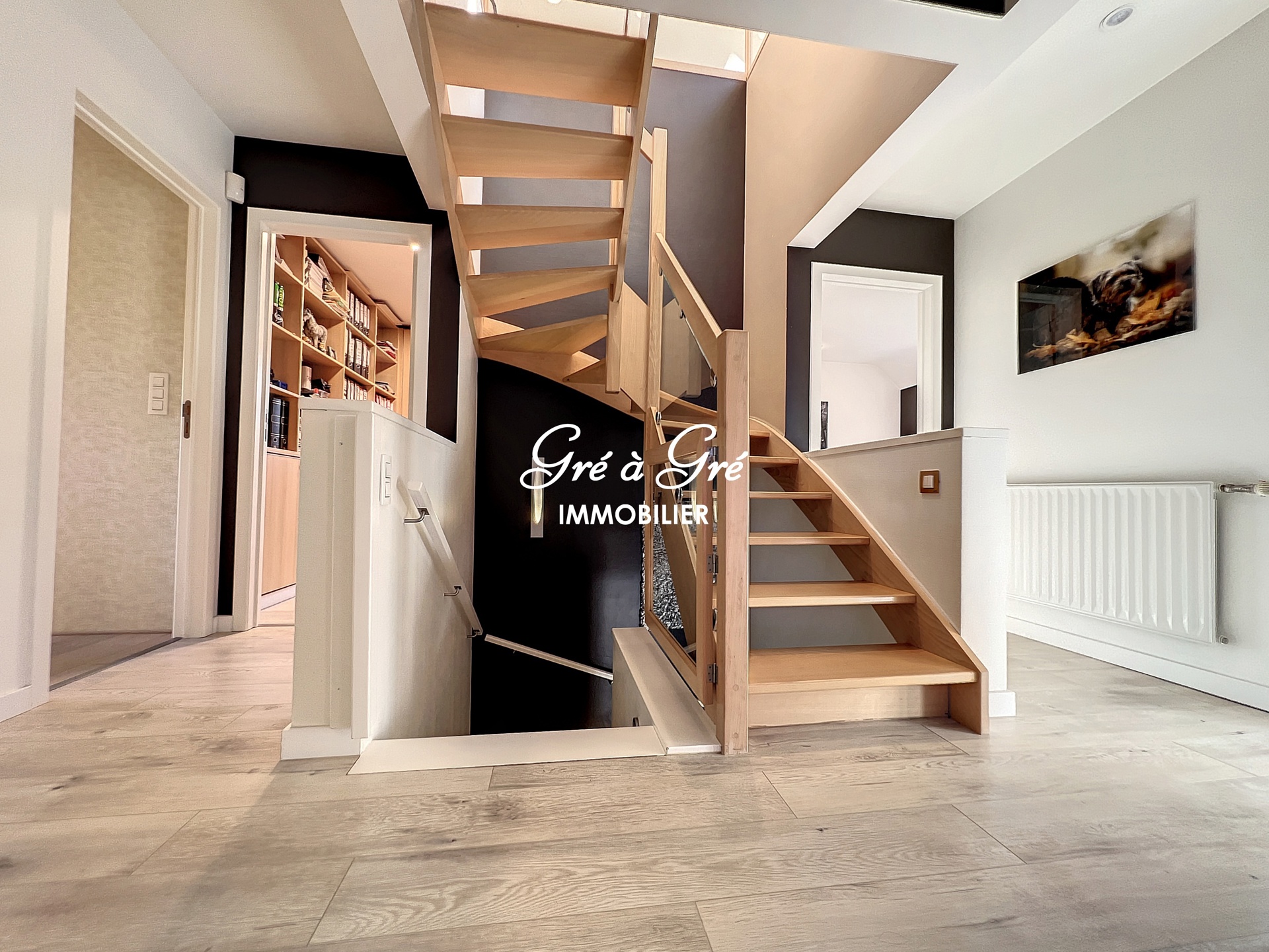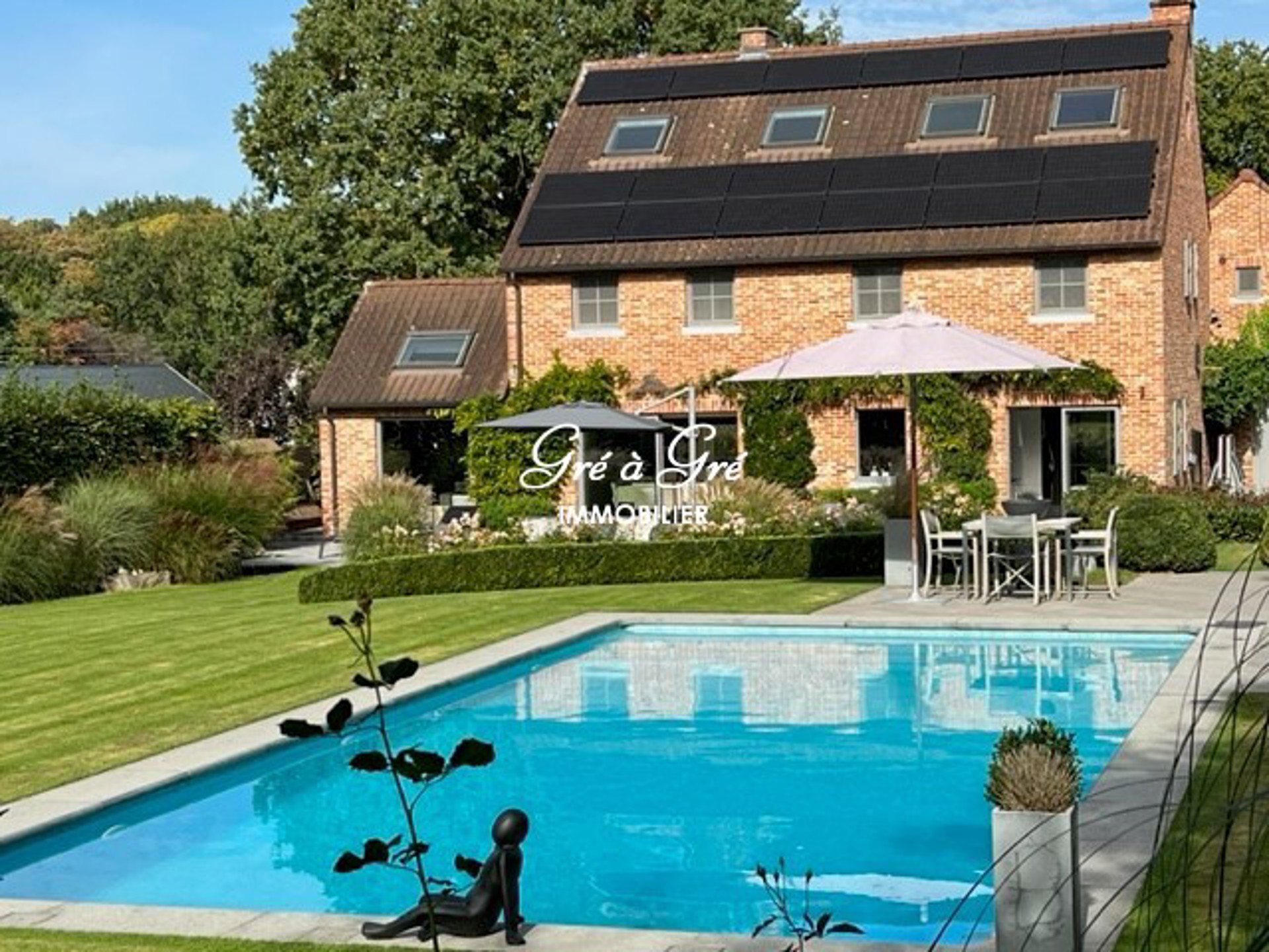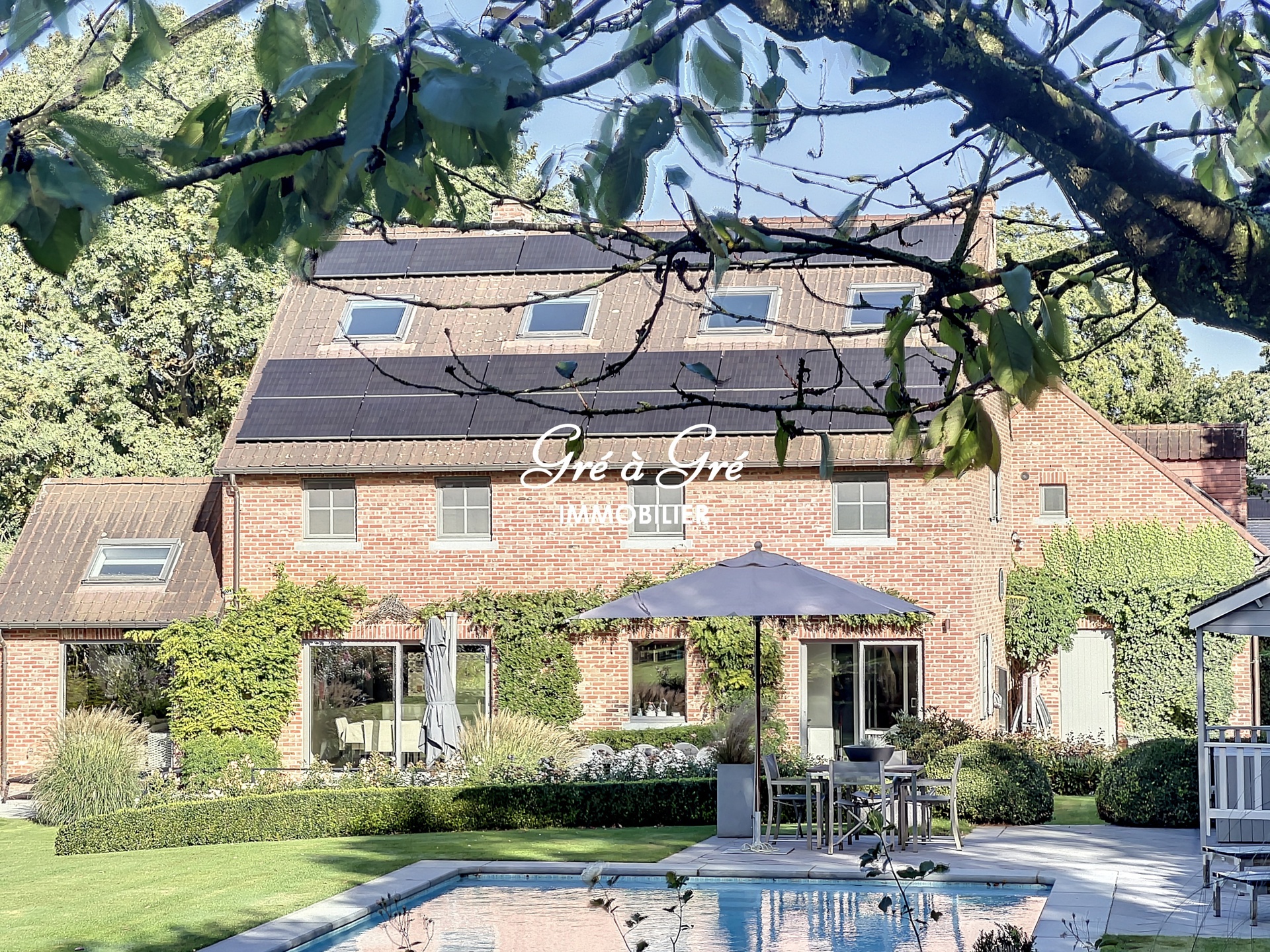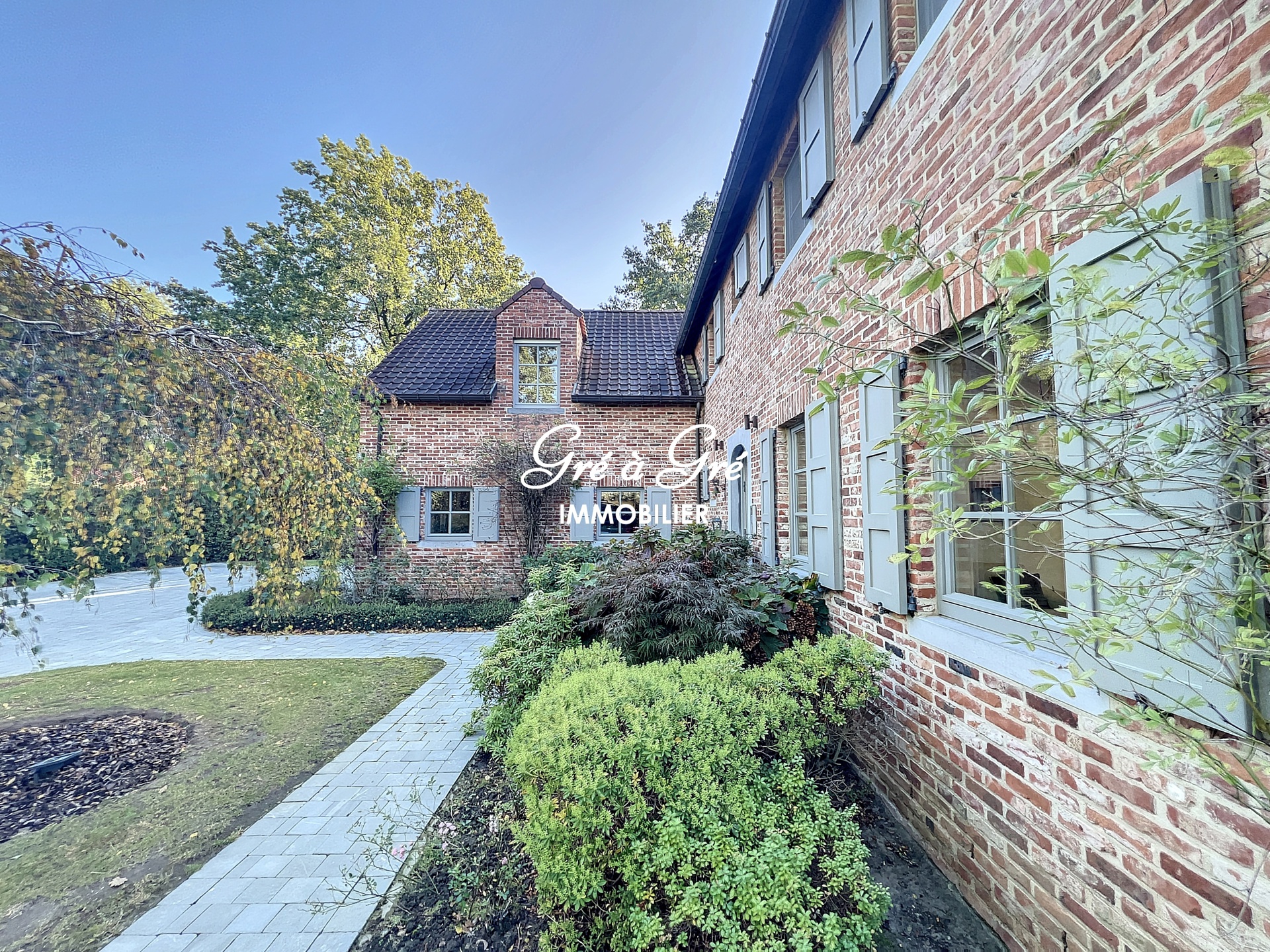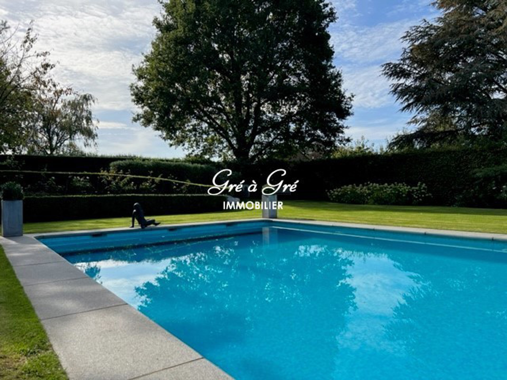 Inkomhal met vestiaire en toilet, lichtrijke woonkamer (salon met open haard, eetkamer en bibliotheek) die via grote glasopeningen toegang geeft aan het terras. Volledig ingerichte keuken, ontbijtruimte en bijkeuken/wasruimte. Op de eerste verdieping, 4 mooie slaapkamers, 2 badkamers, 1 doucheruimte, kleedkamer, 2 toiletten en kantoor. Omgebouwde zolder. Kelders, garage voor 2 auto's + buitenparkeerplaatsen.