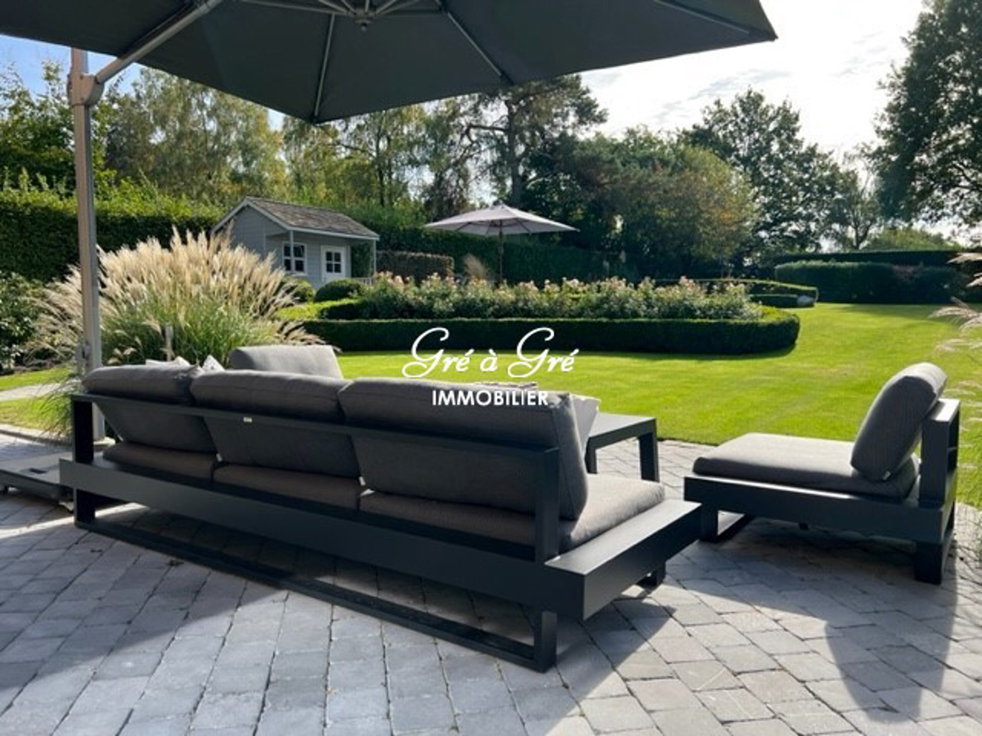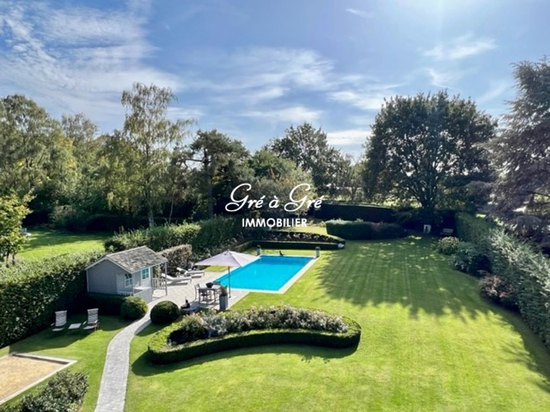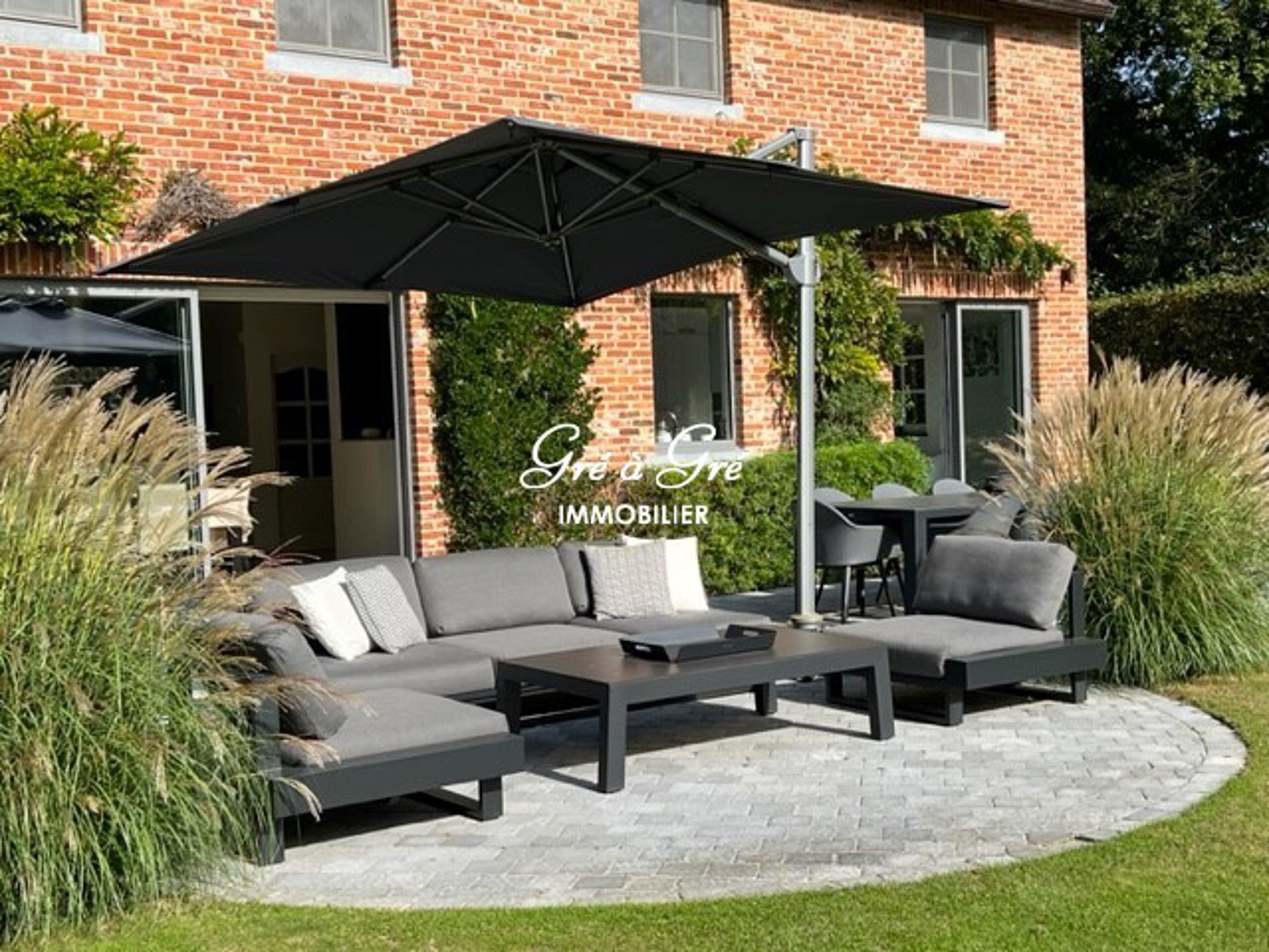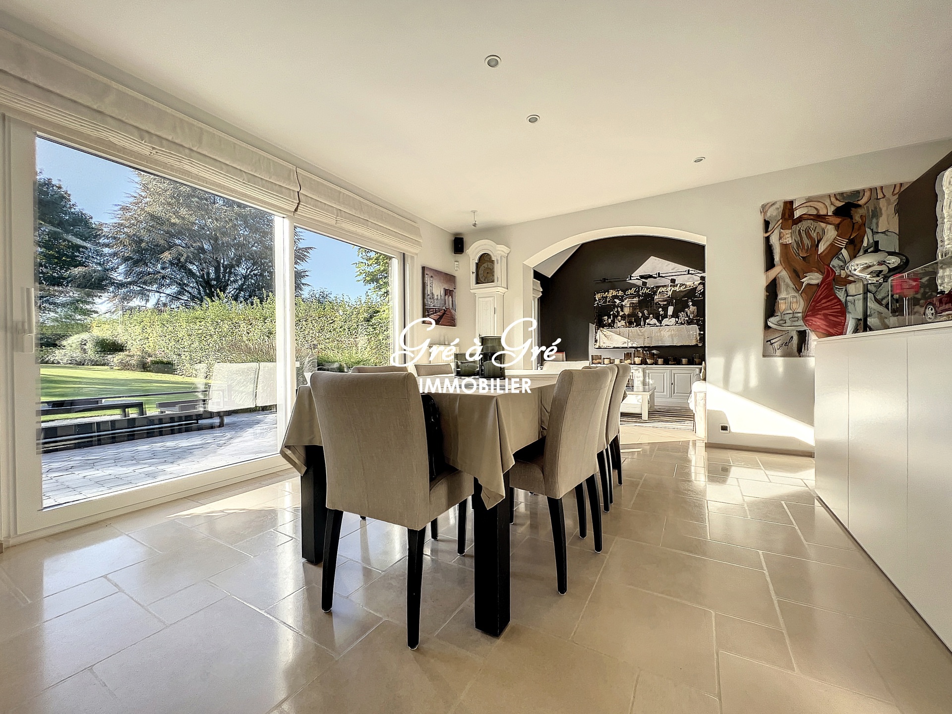 Inkomhal met vestiaire en toilet, lichtrijke woonkamer (salon met open haard, eetkamer en bibliotheek) die via grote glasopeningen toegang geeft aan het terras. Volledig ingerichte keuken, ontbijtruimte en bijkeuken/wasruimte. Op de eerste verdieping, 4 mooie slaapkamers, 2 badkamers, 1 doucheruimte, kleedkamer, 2 toiletten en kantoor. Omgebouwde zolder. Kelders, garage voor 2 auto's + buitenparkeerplaatsen.