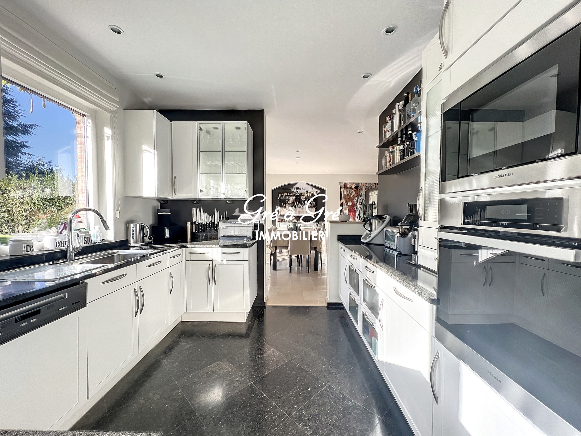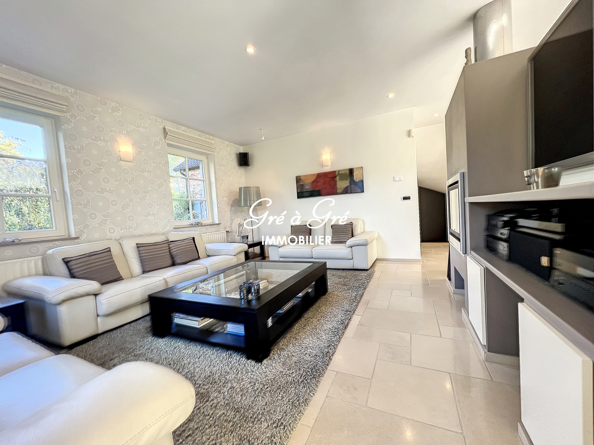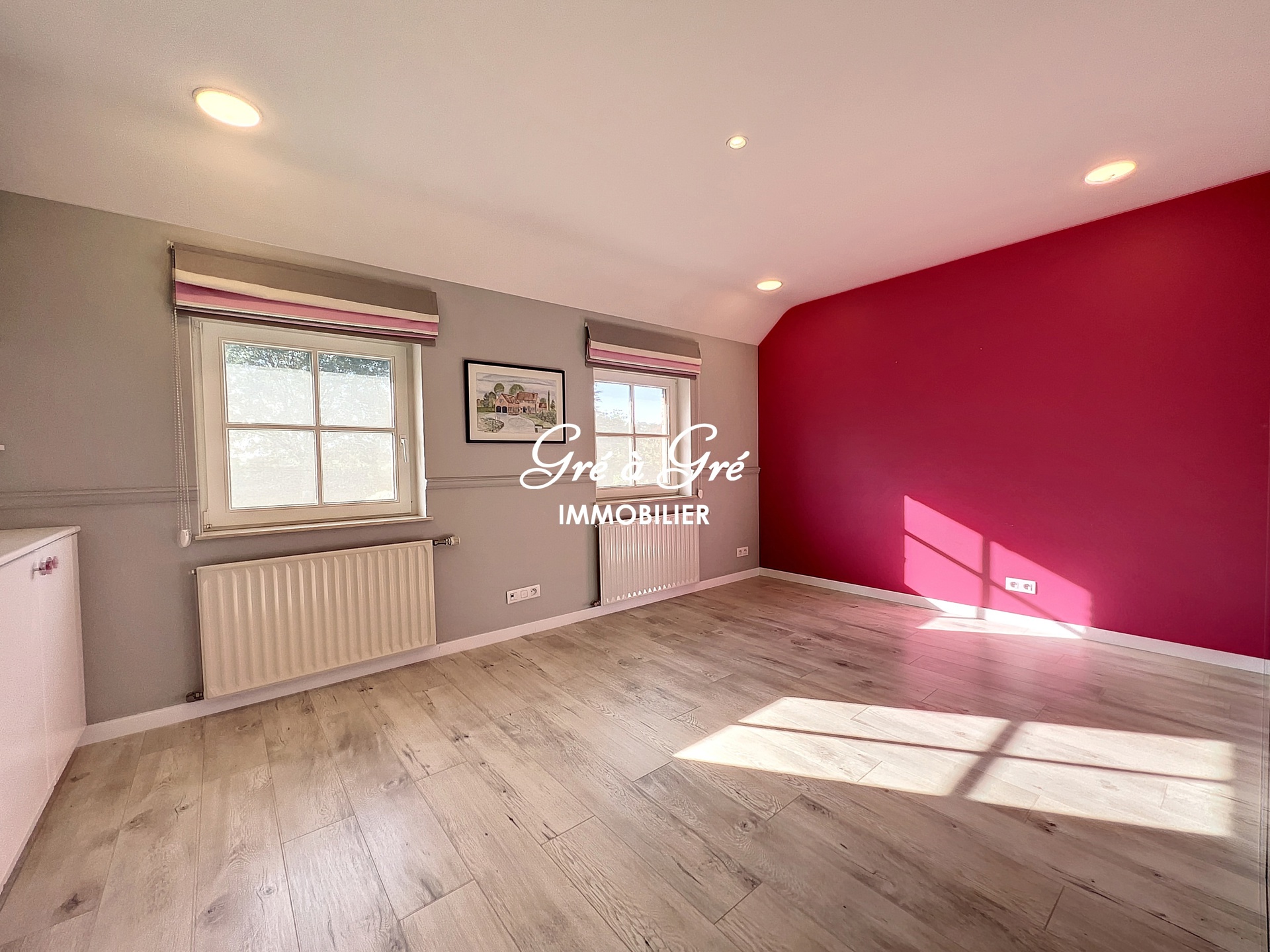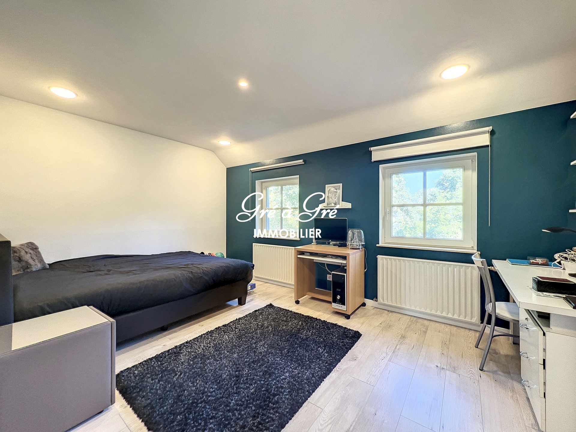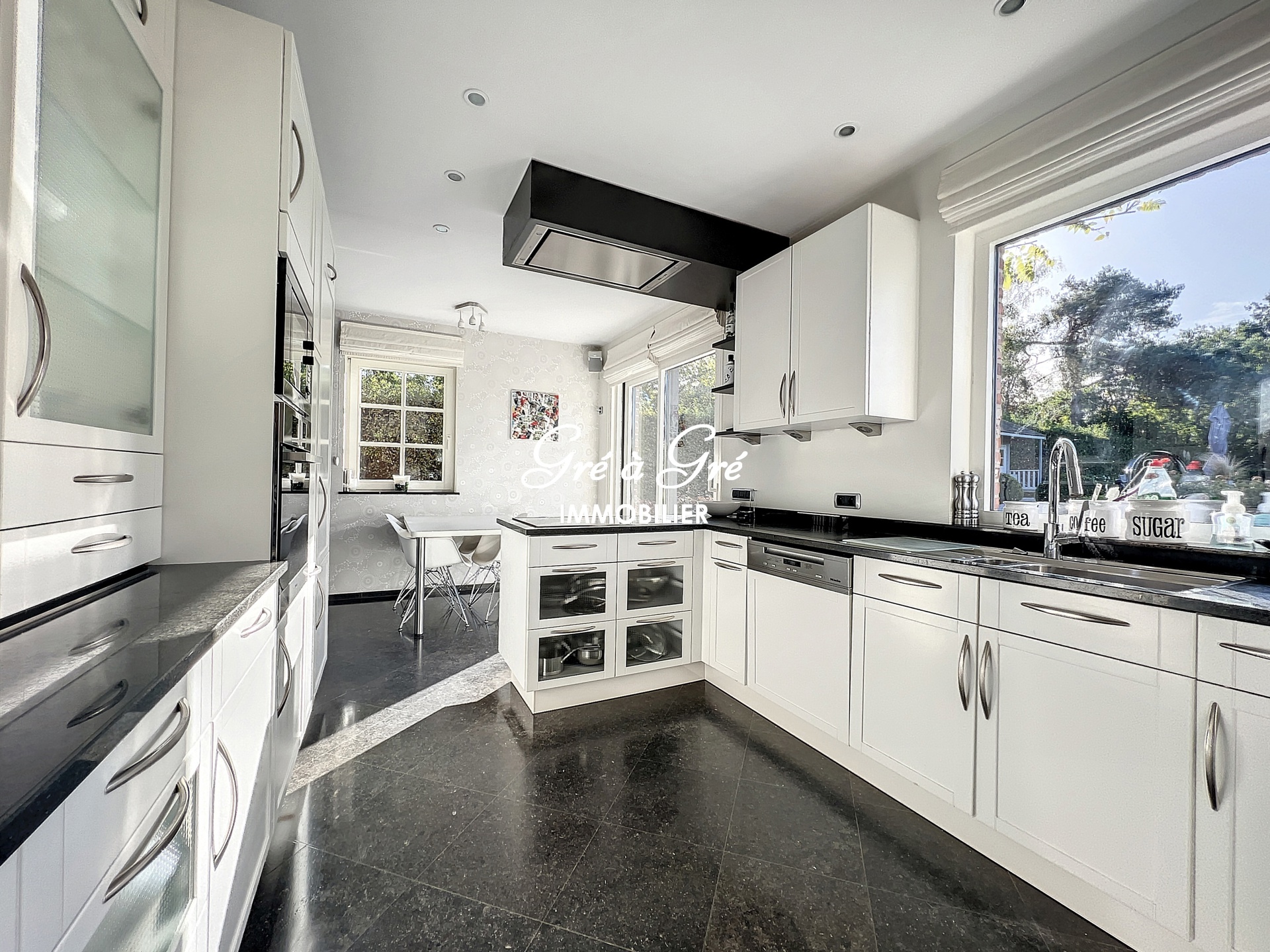 Inkomhal met vestiaire en toilet, lichtrijke woonkamer (salon met open haard, eetkamer en bibliotheek) die via grote glasopeningen toegang geeft aan het terras. Volledig ingerichte keuken, ontbijtruimte en bijkeuken/wasruimte. Op de eerste verdieping, 4 mooie slaapkamers, 2 badkamers, 1 doucheruimte, kleedkamer, 2 toiletten en kantoor. Omgebouwde zolder. Kelders, garage voor 2 auto's + buitenparkeerplaatsen.