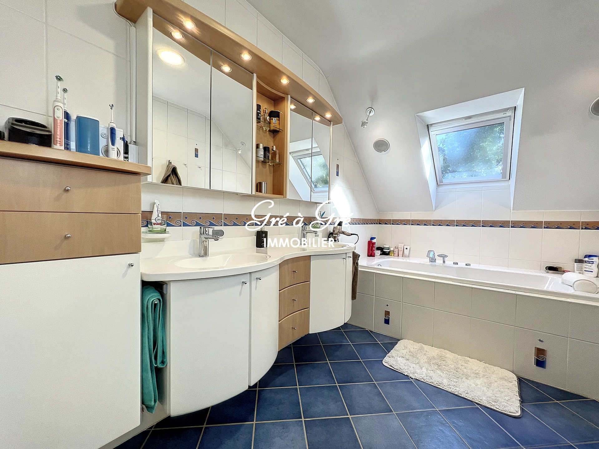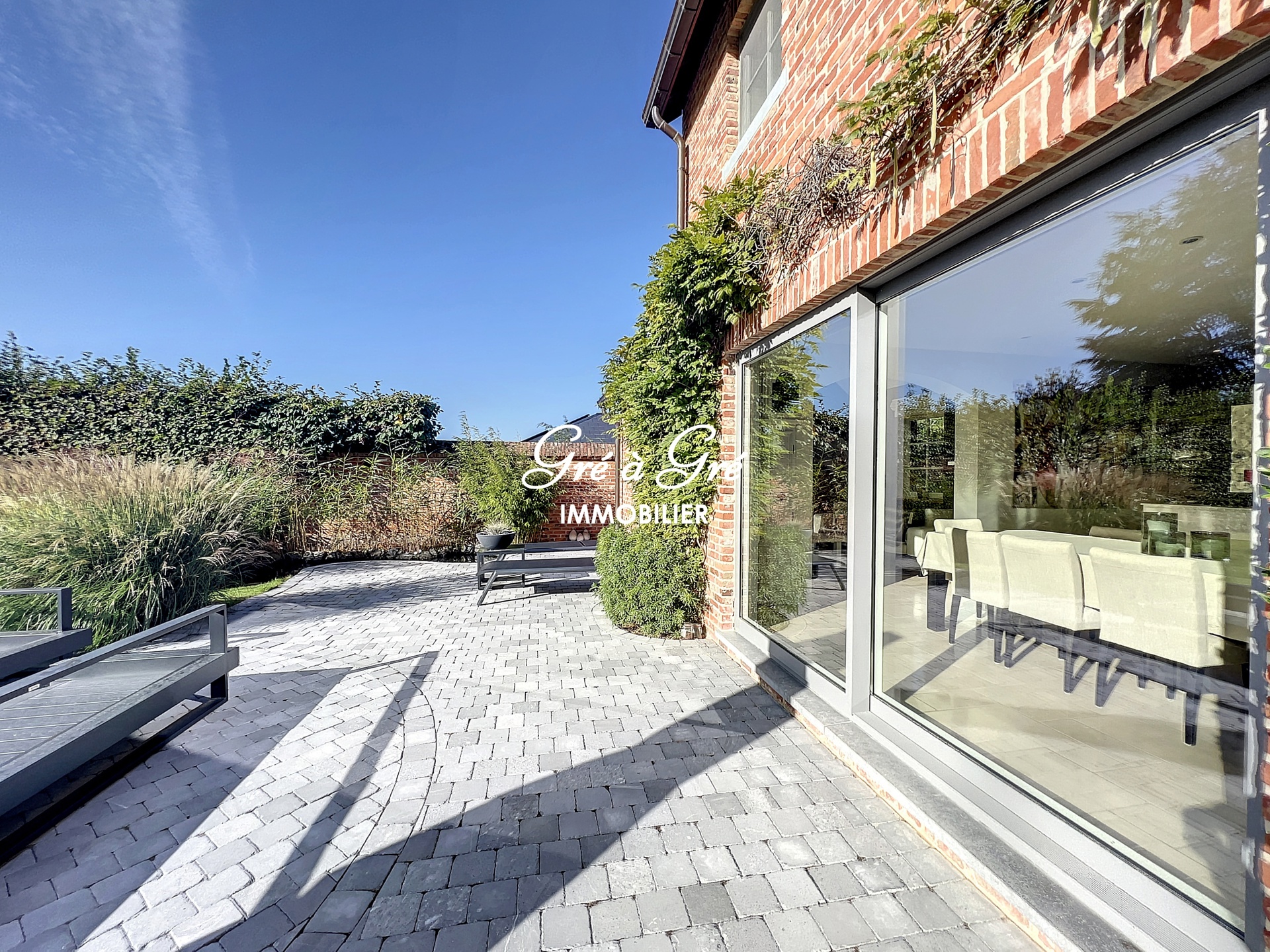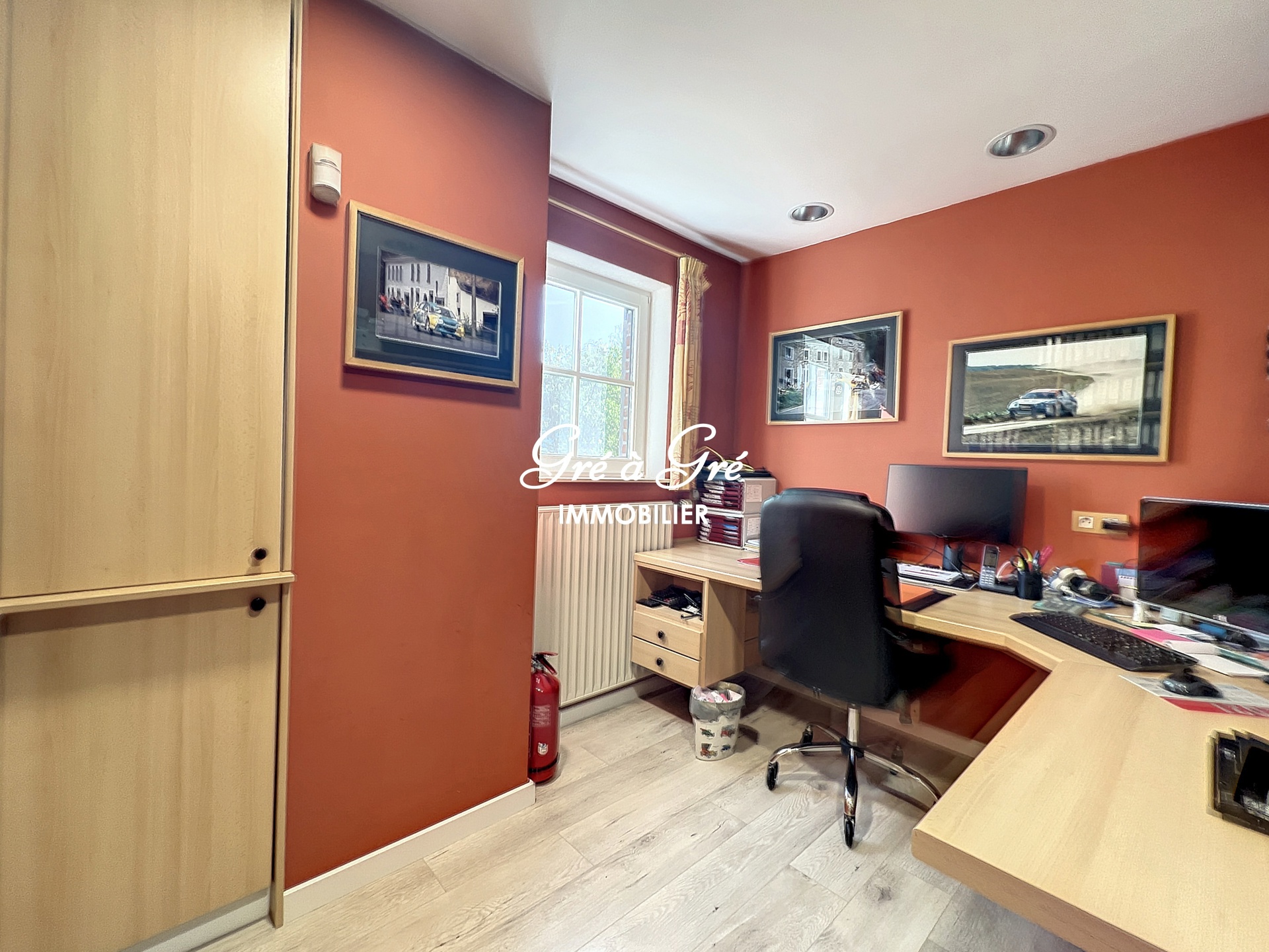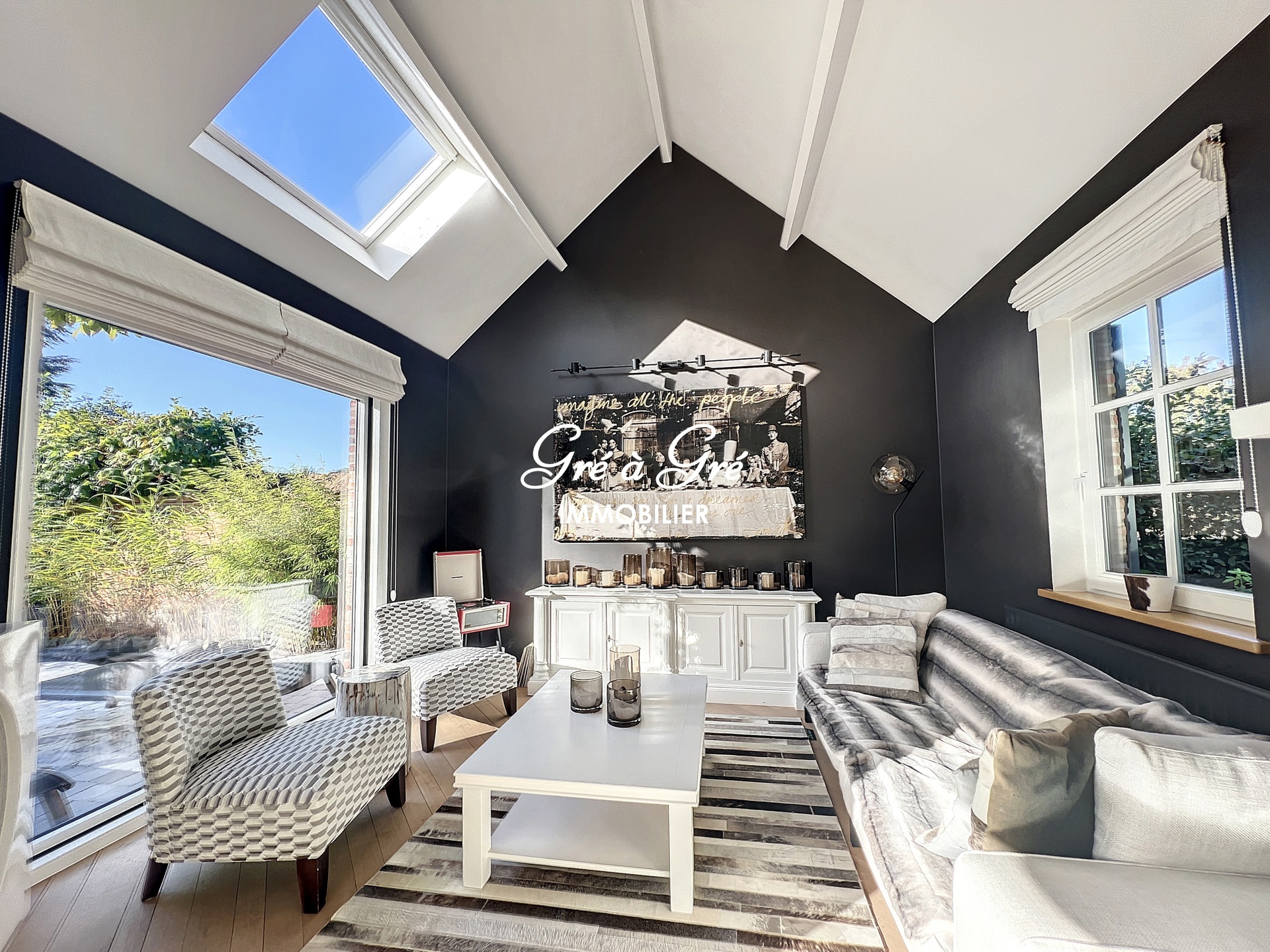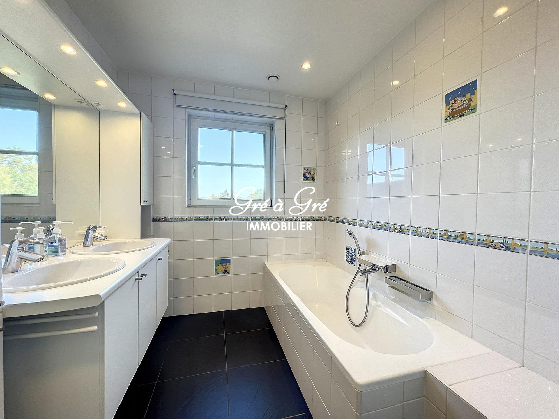 Inkomhal met vestiaire en toilet, lichtrijke woonkamer (salon met open haard, eetkamer en bibliotheek) die via grote glasopeningen toegang geeft aan het terras. Volledig ingerichte keuken, ontbijtruimte en bijkeuken/wasruimte. Op de eerste verdieping, 4 mooie slaapkamers, 2 badkamers, 1 doucheruimte, kleedkamer, 2 toiletten en kantoor. Omgebouwde zolder. Kelders, garage voor 2 auto's + buitenparkeerplaatsen.